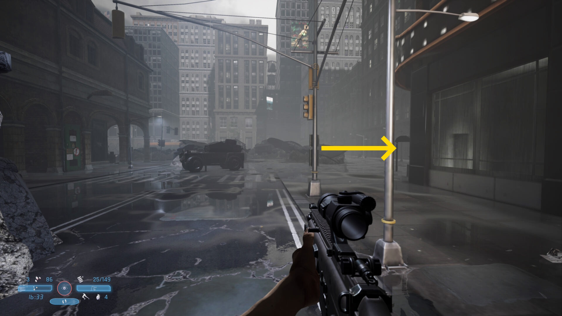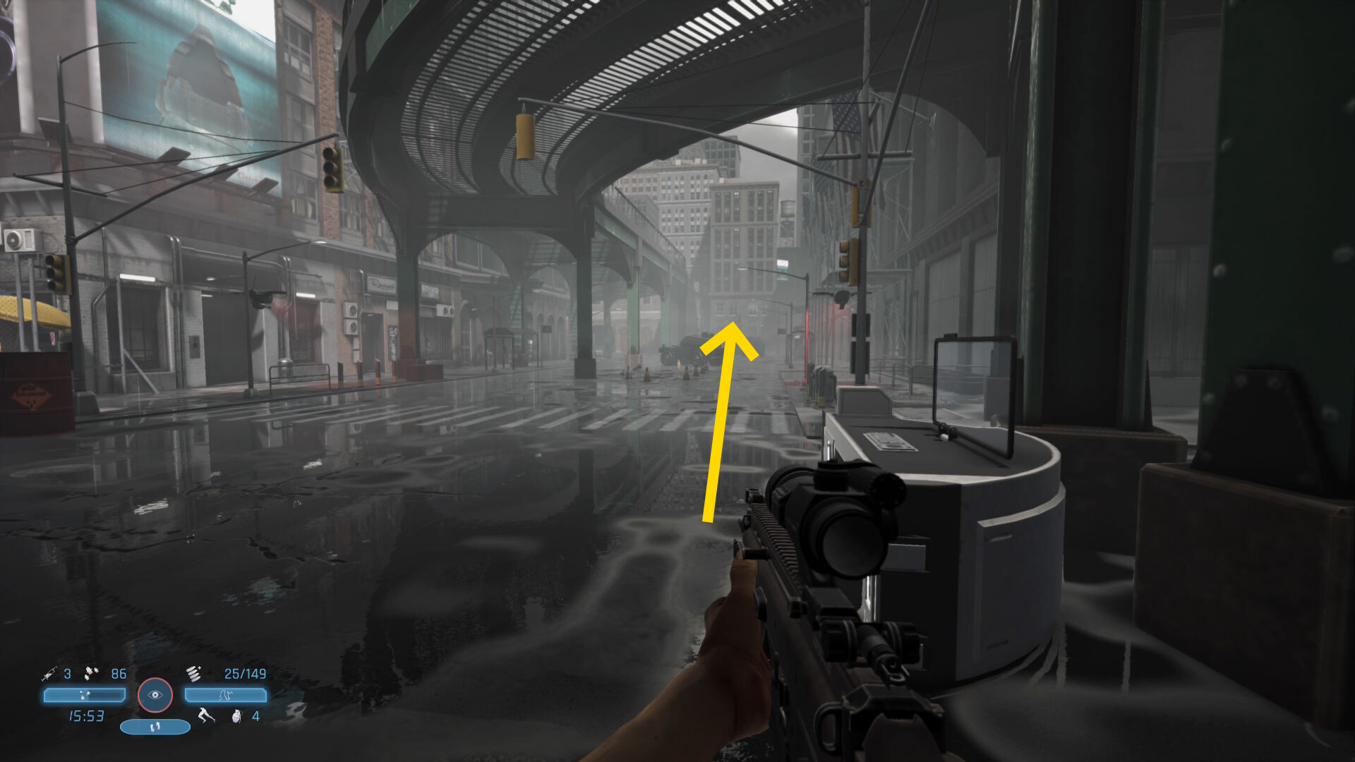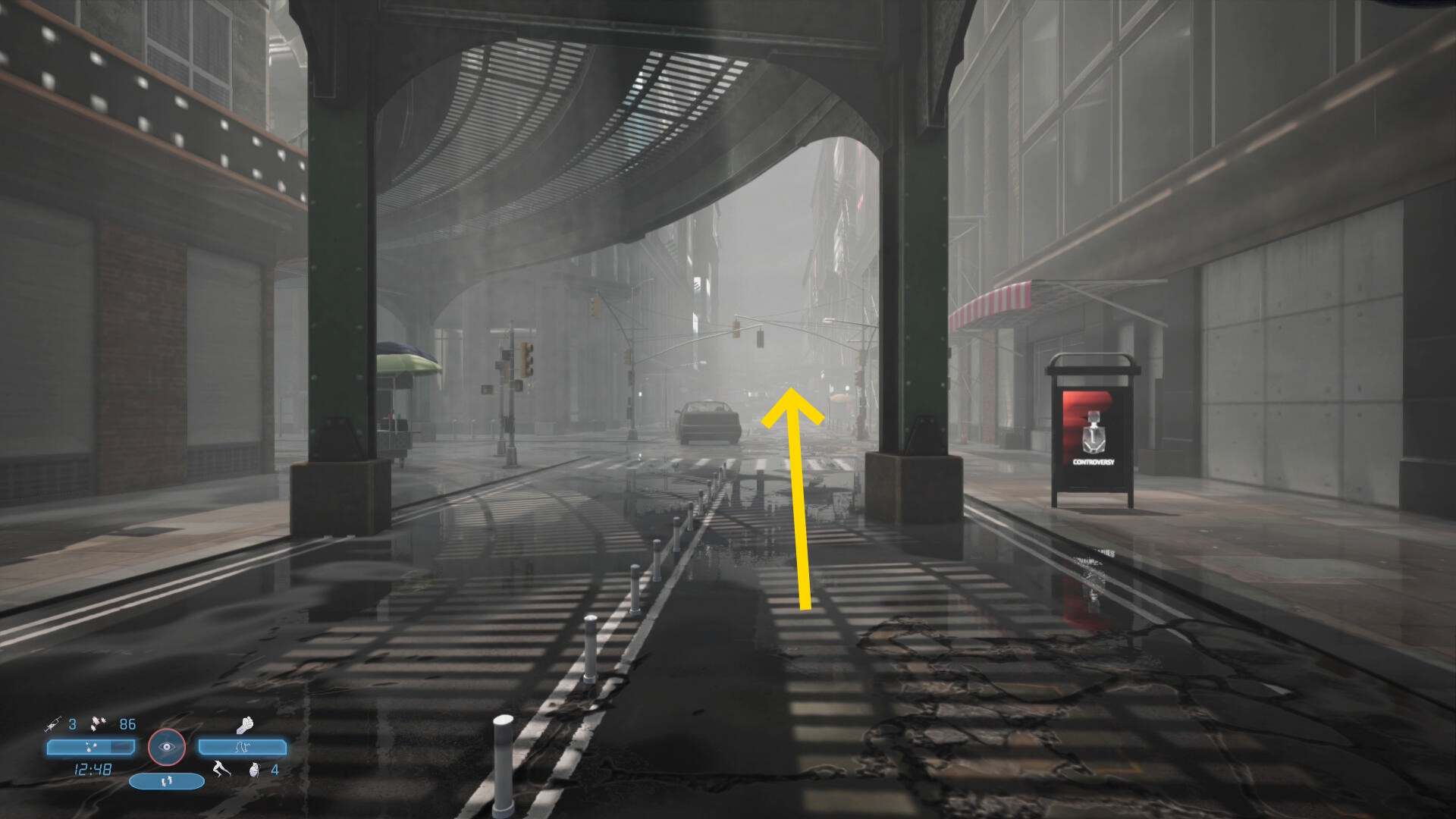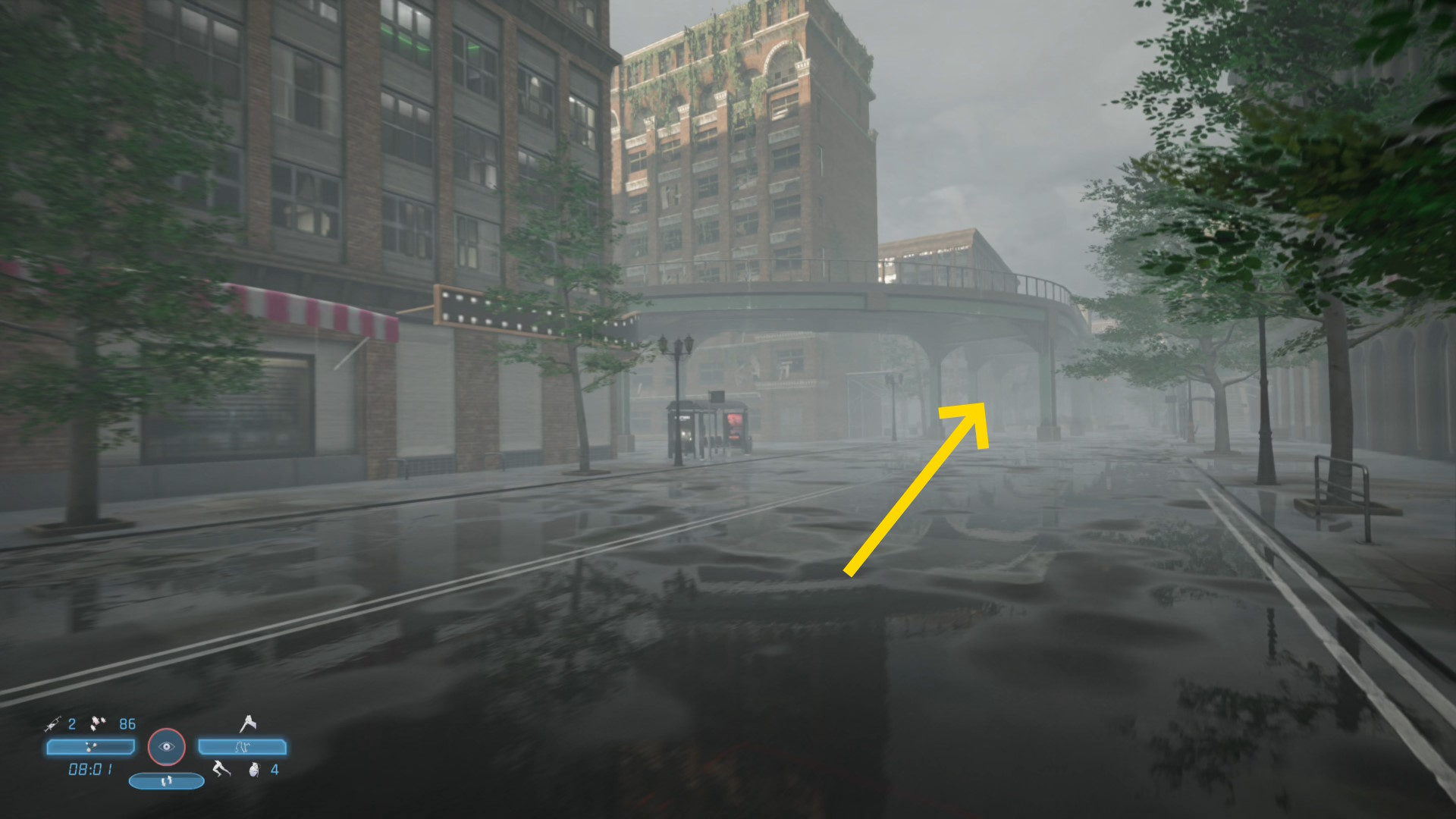 - 高架下は丁字路になっているので、まっすぐ進むこともできるし、左に進むこともできるが、解りやすくするためにまっすぐ進み、少し前に崩落する高架のシーンを観たところまで戻り、そこを左折して公園方面へ