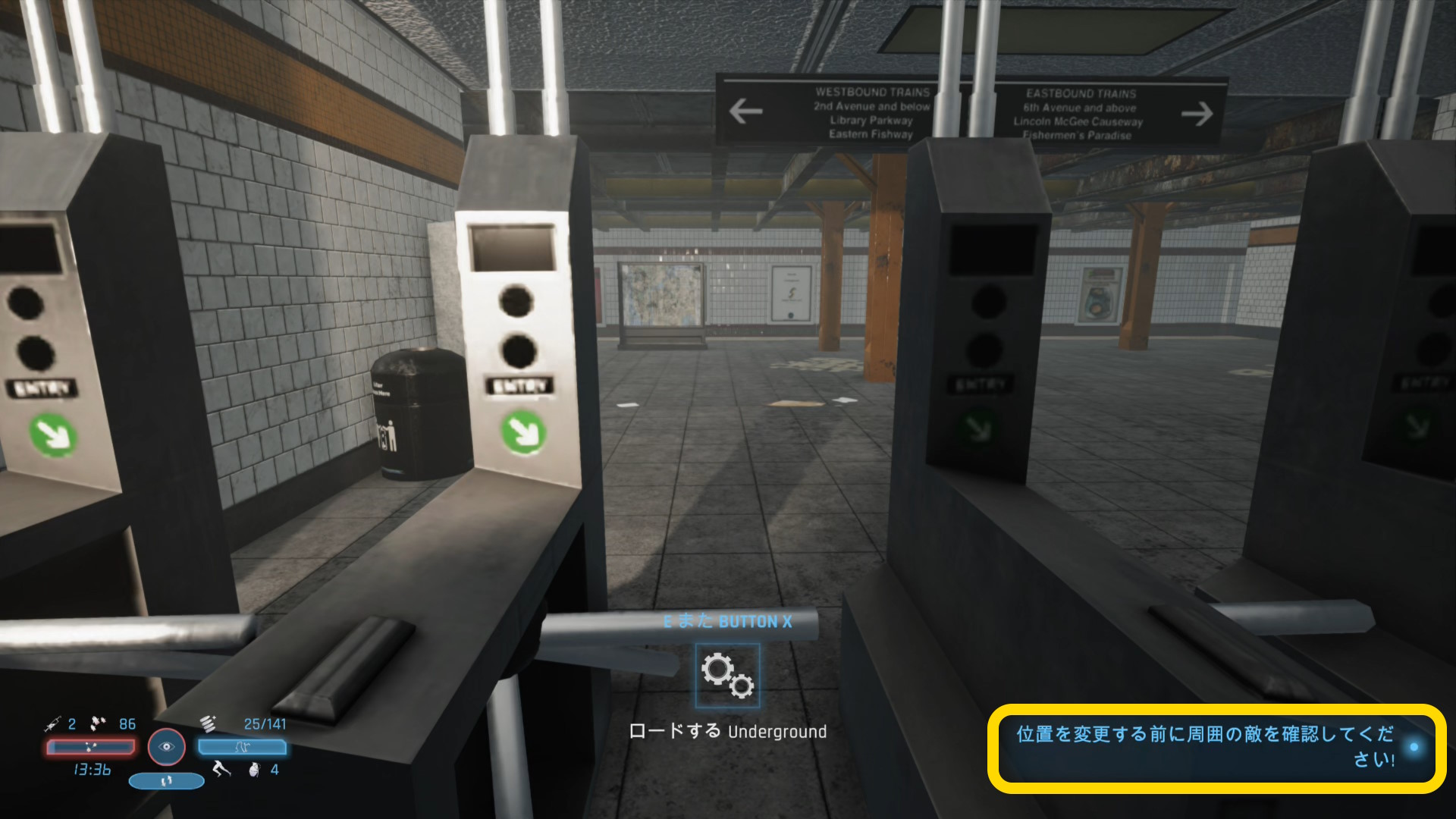 - ただし、勇ましい BGM が流れている場合、位置を変更する前に周囲の敵を確認してください というメッセージが出て改札を通過(ロード)できない