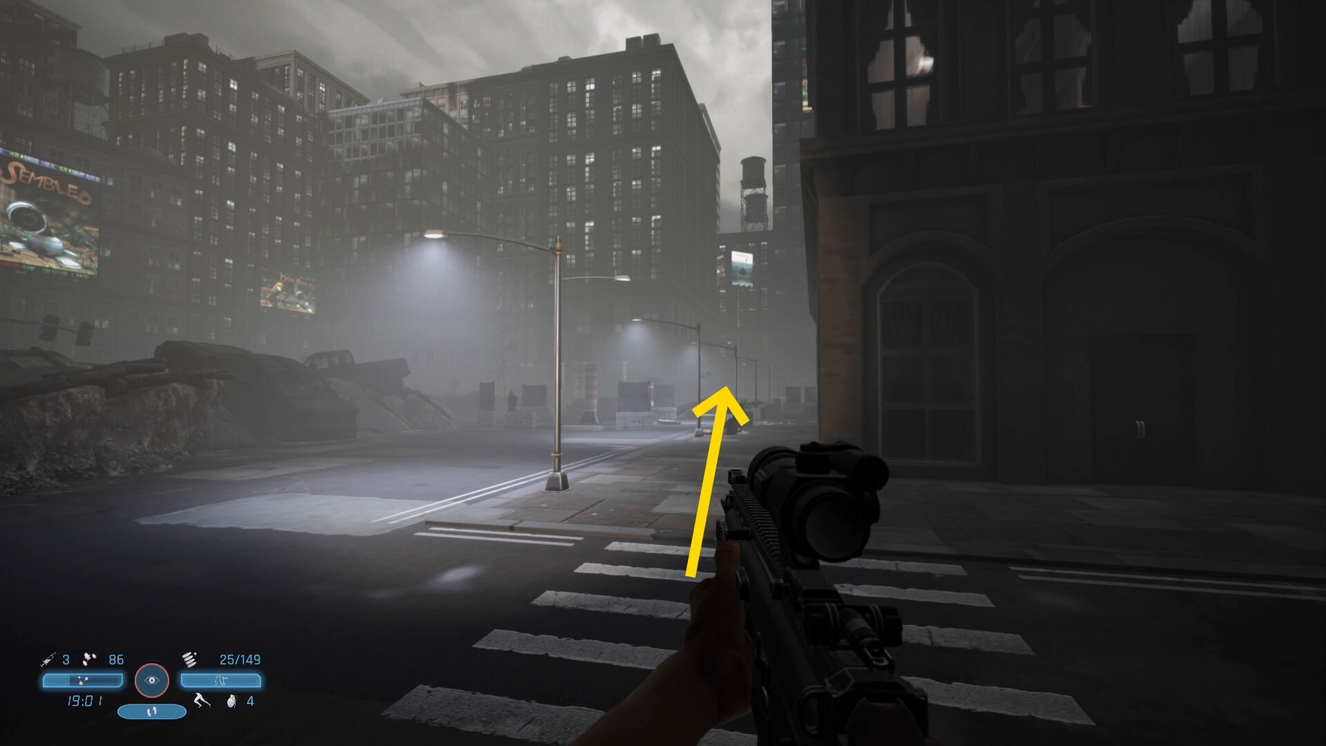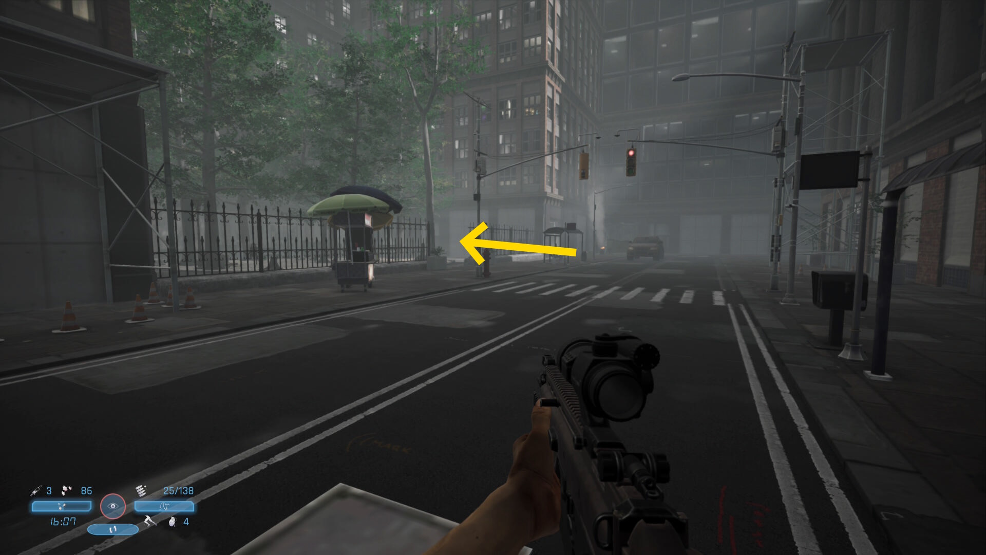 - 歩道を左に進むと武器の切り替え、リロード、狙い(エイム)、投擲の説明あり