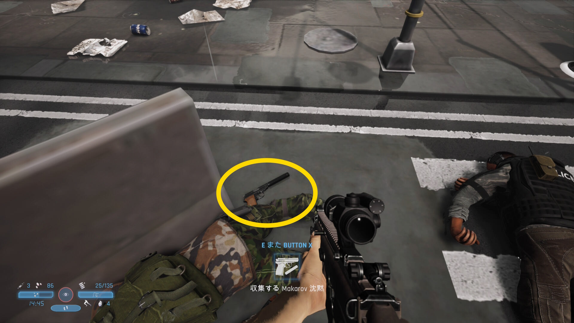 - キルした敵は武器を落とすことが多いので回収し、また死体も調べて弾薬等を回収しよう