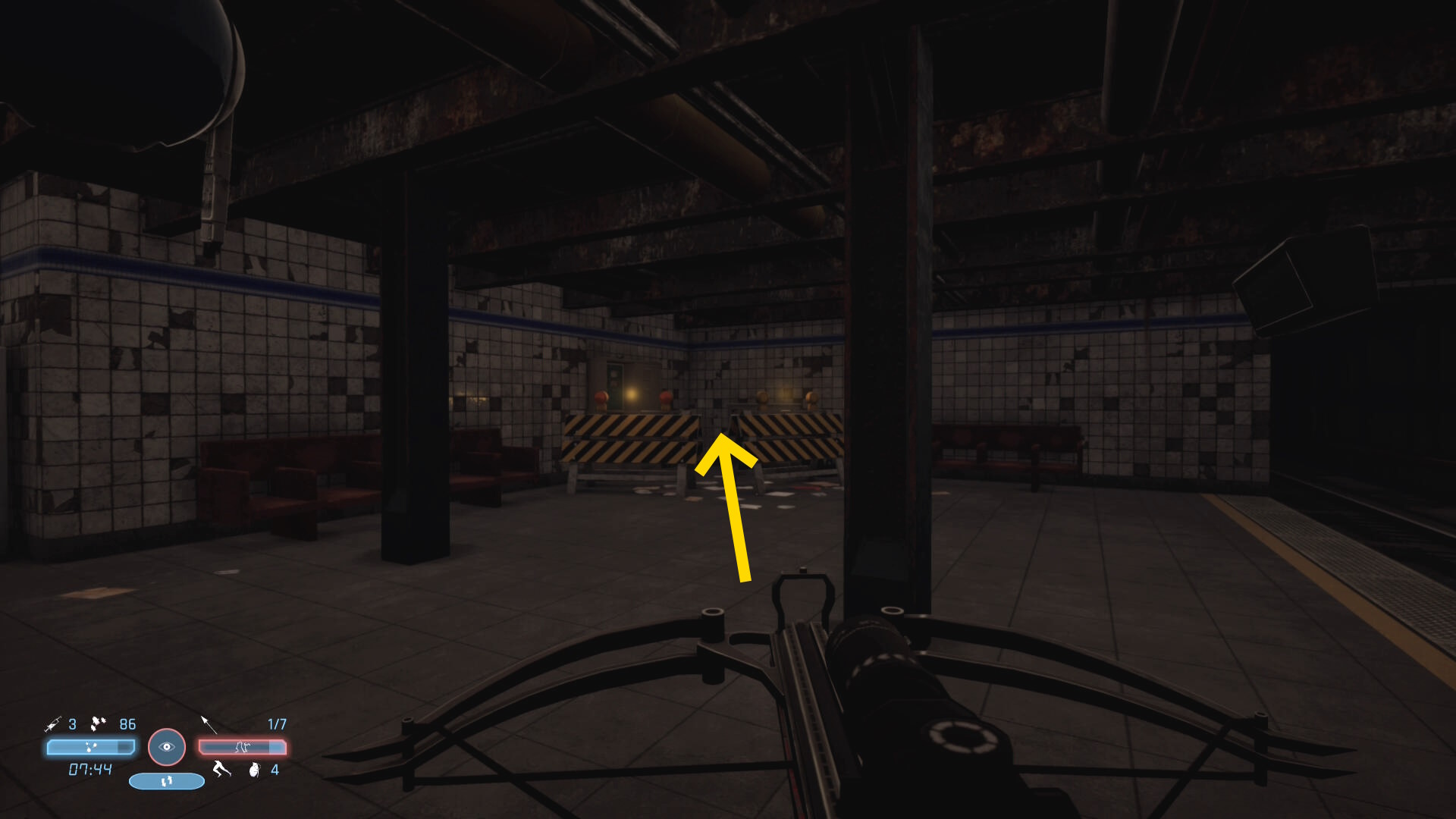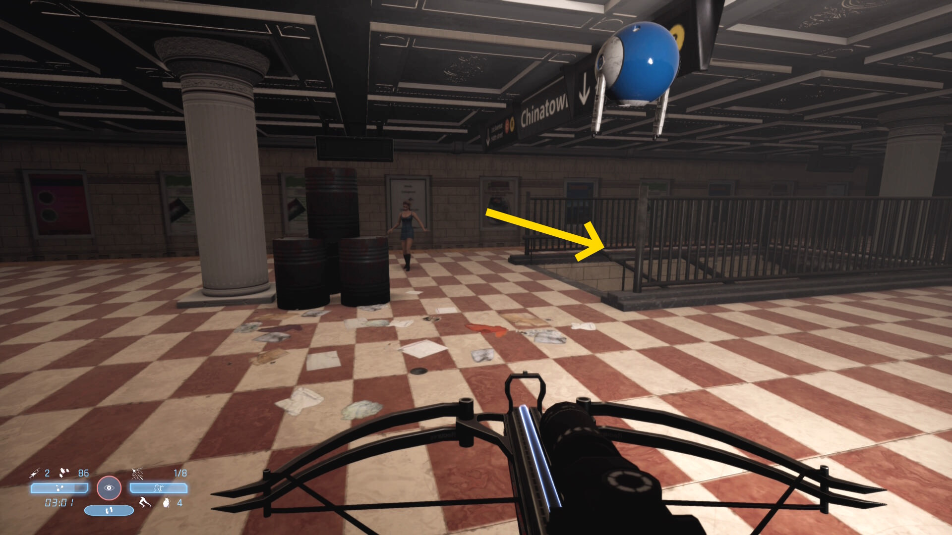 - ジャンプでホームに上がり、前方隅にあるトラ模様のバリケードのところへ