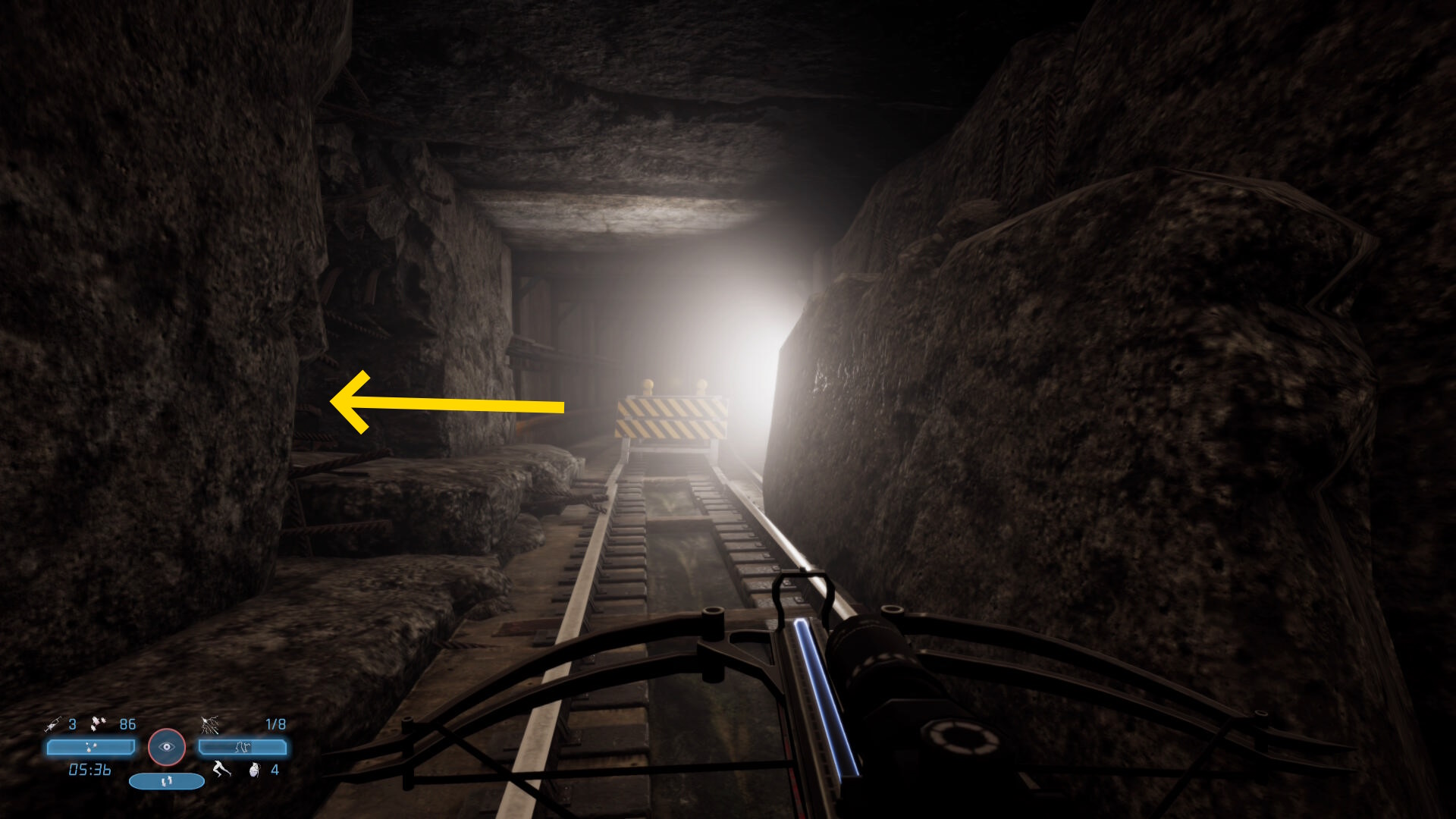 - 線路を進んでいくとトラ模様のバリケードがあり、その左脇の壁に穴が空いている