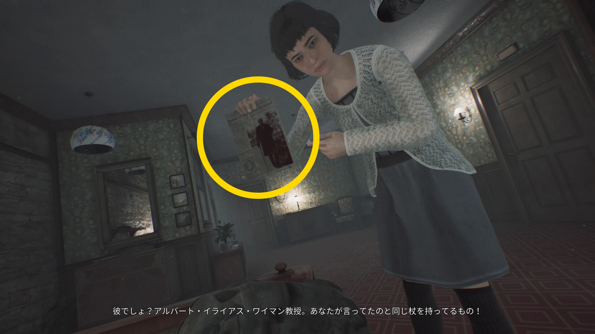 - このシーン中、リンから新聞記事を見せられ 記事4 – ワイマン氏の自殺、偽装の可能性 (メモ:15/33)を自動回収