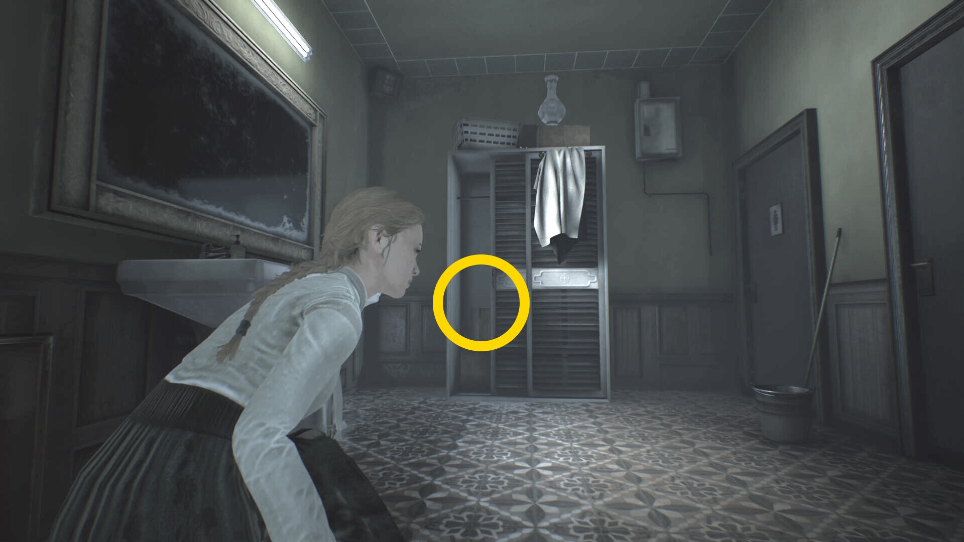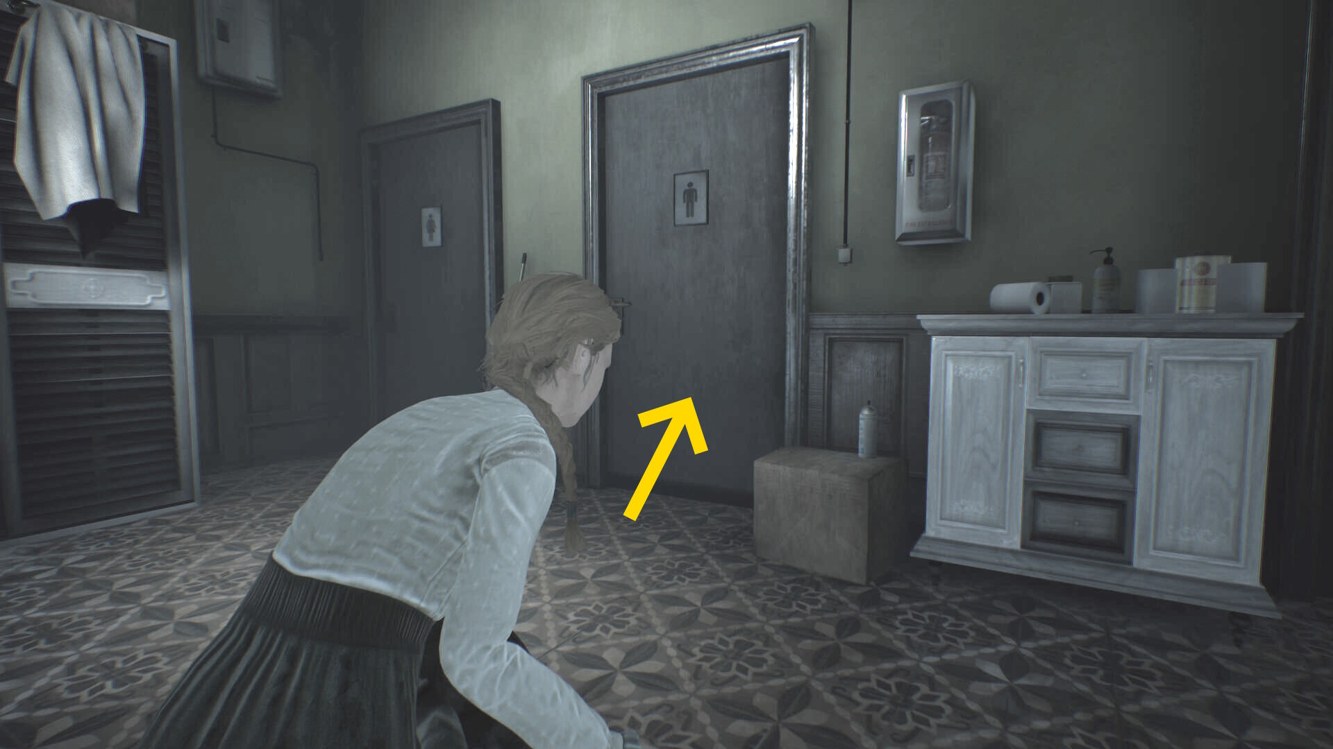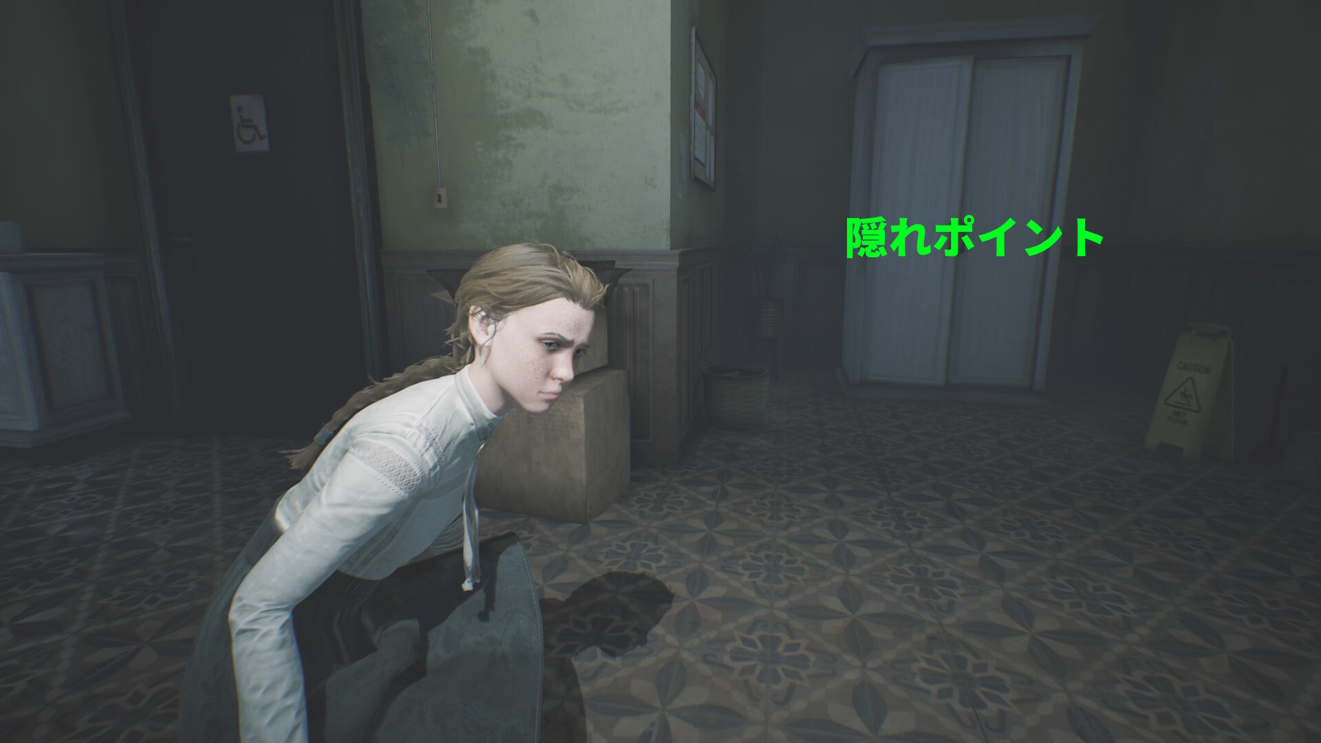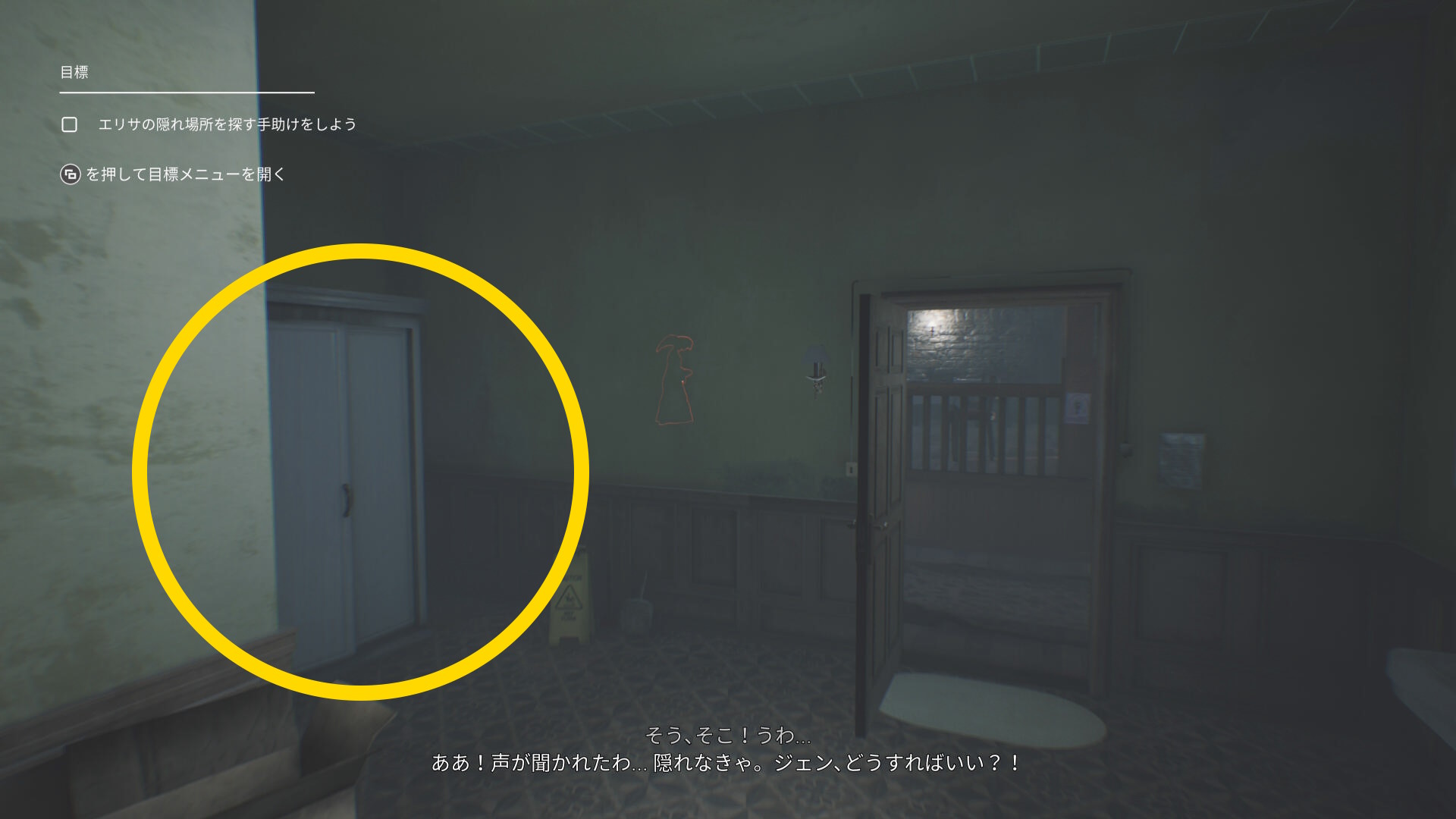 - トイレ内のクローゼットに近づき、A を押せばエリサが隠れる