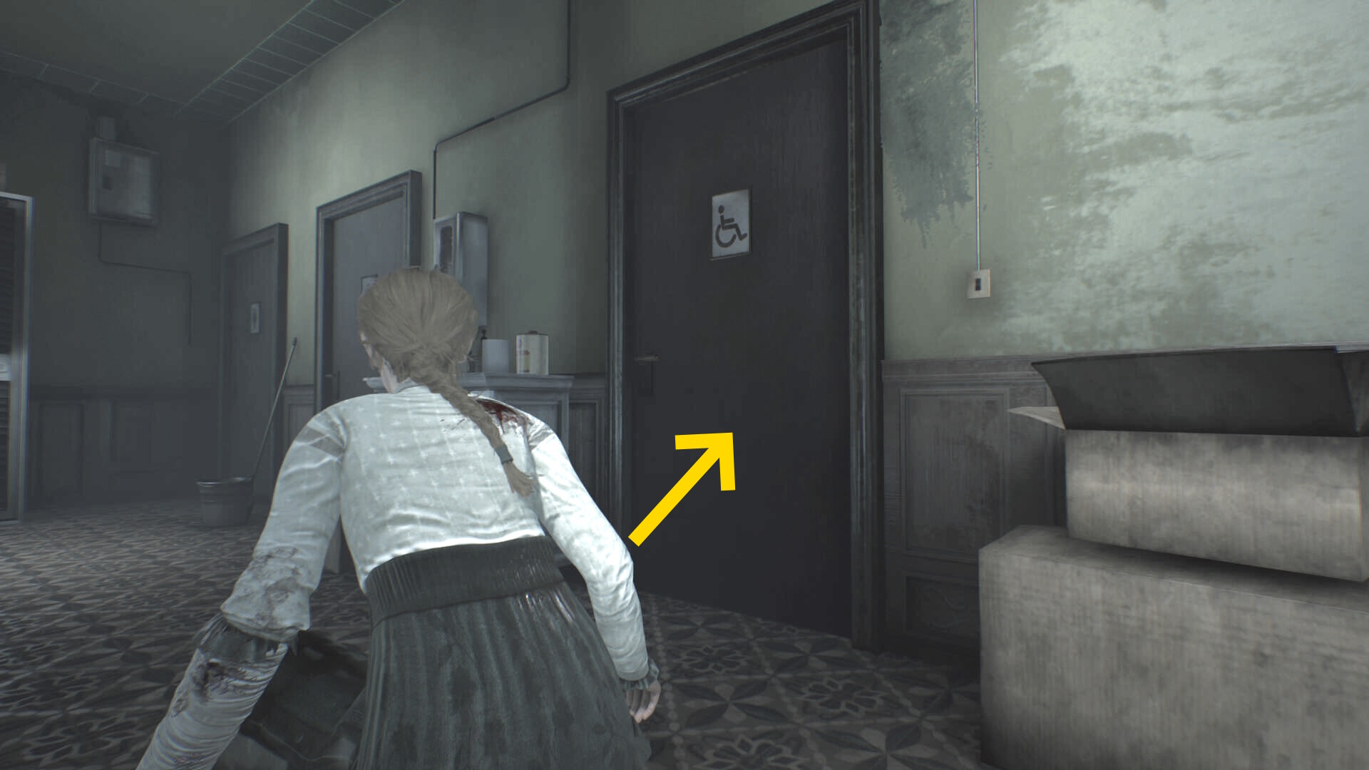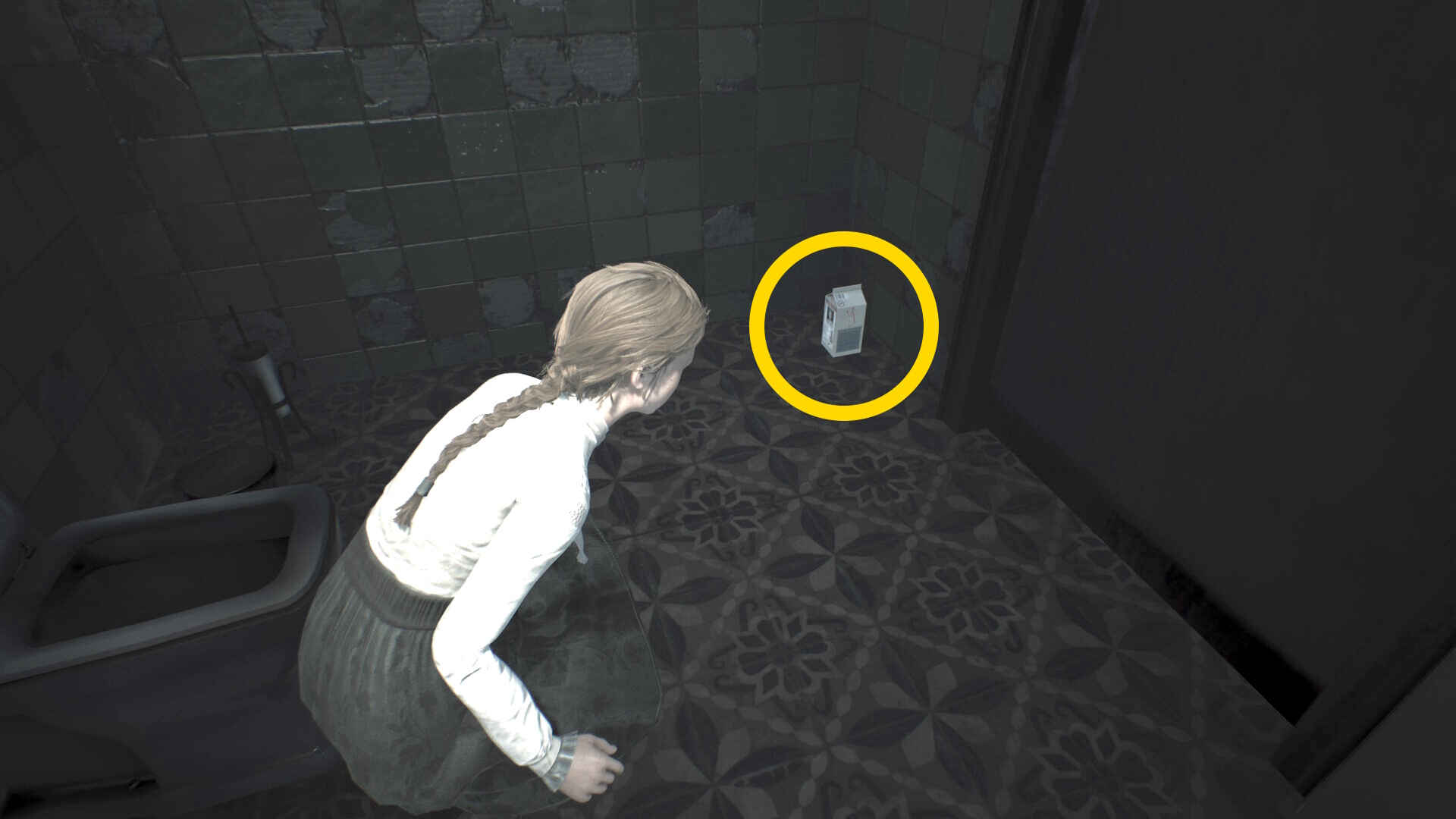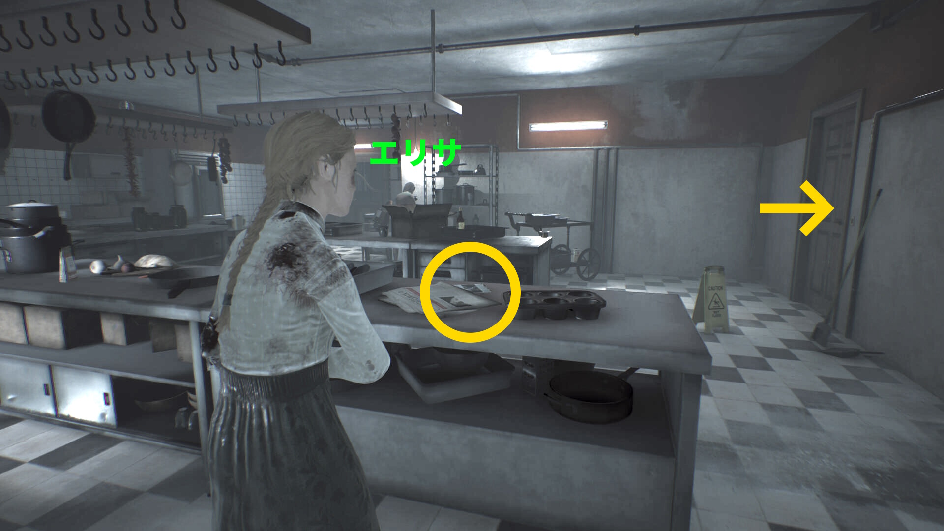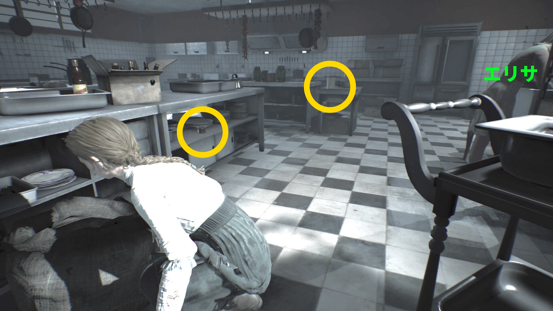 - トイレ内のクローゼットに近づき、A を押せばエリサが隠れる
