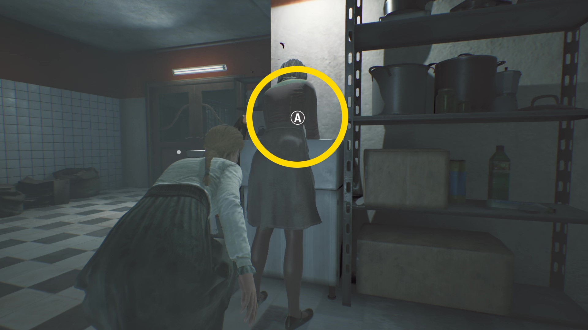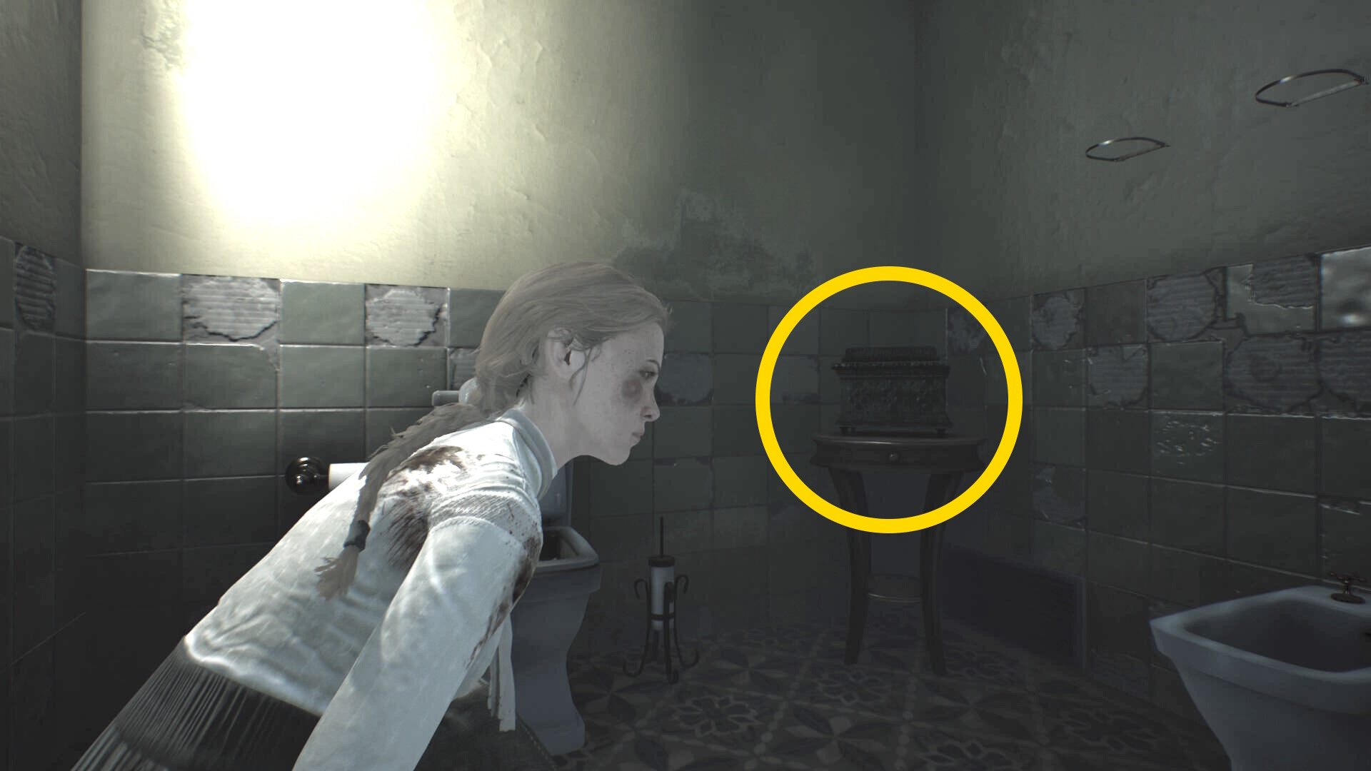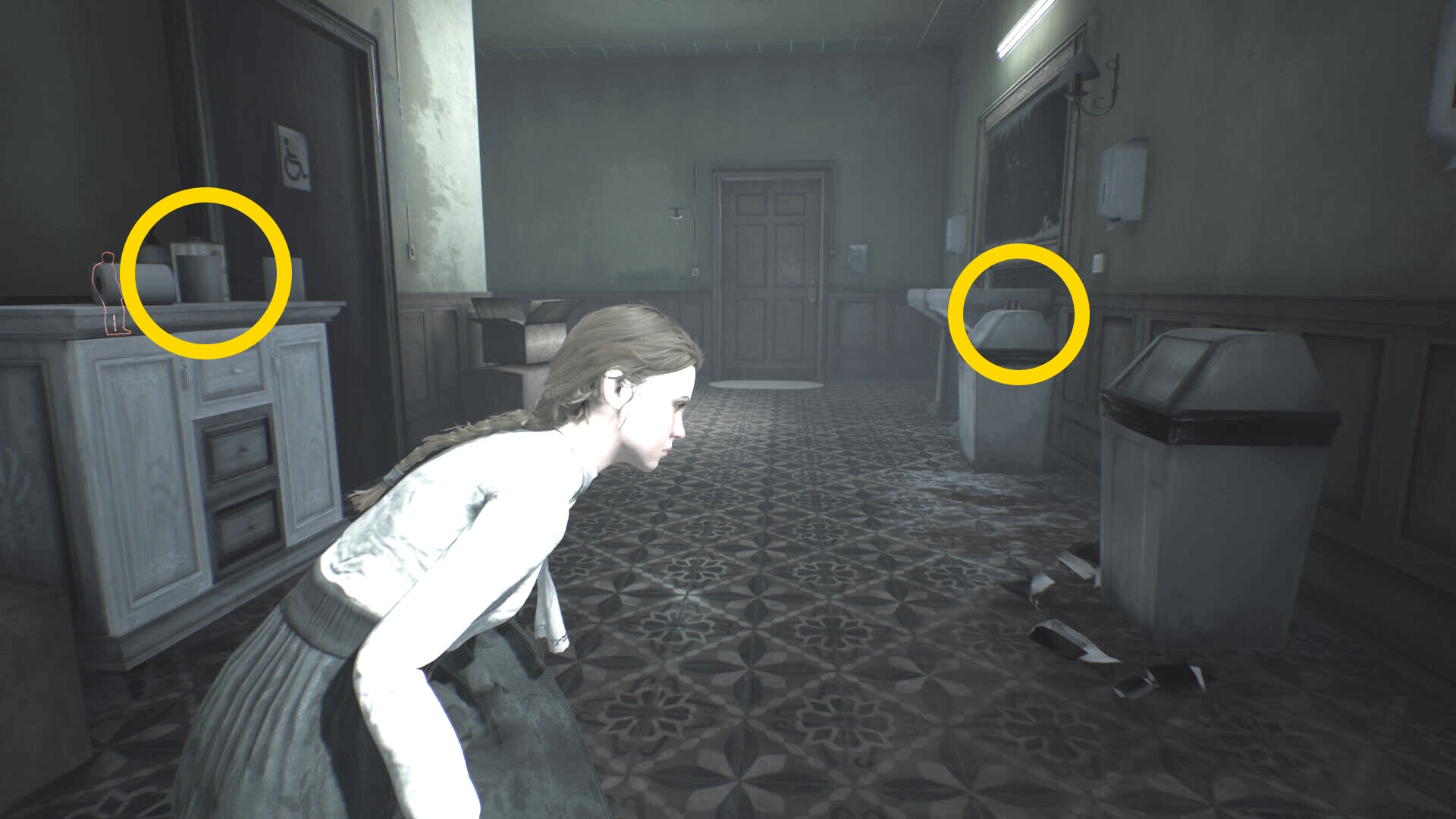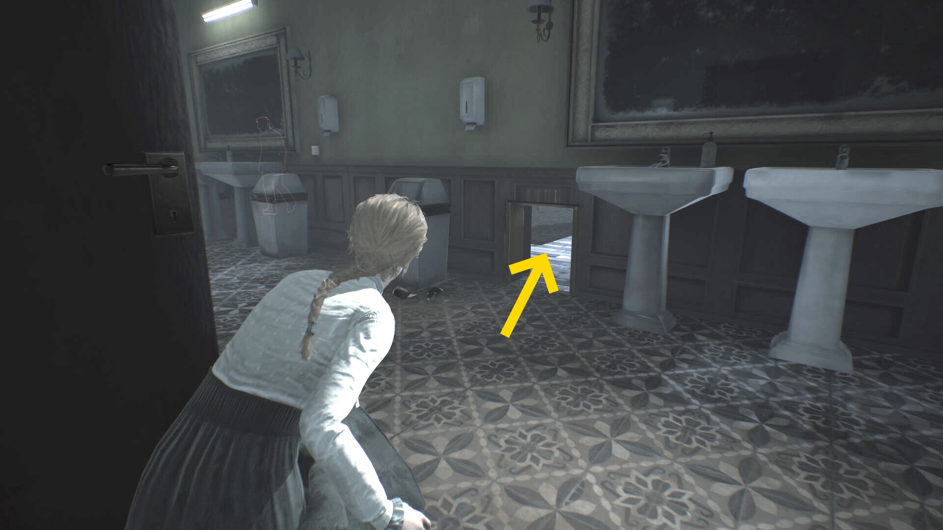 - トイレ内のクローゼットに近づき、A を押せばエリサが隠れる
