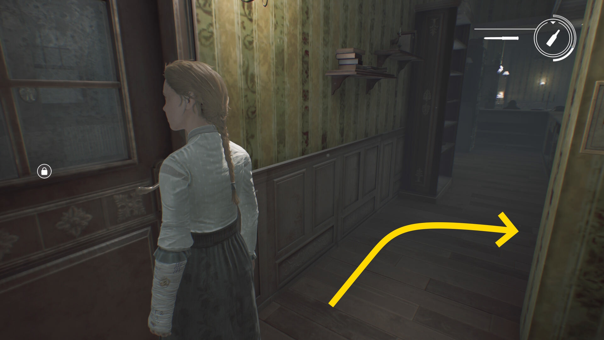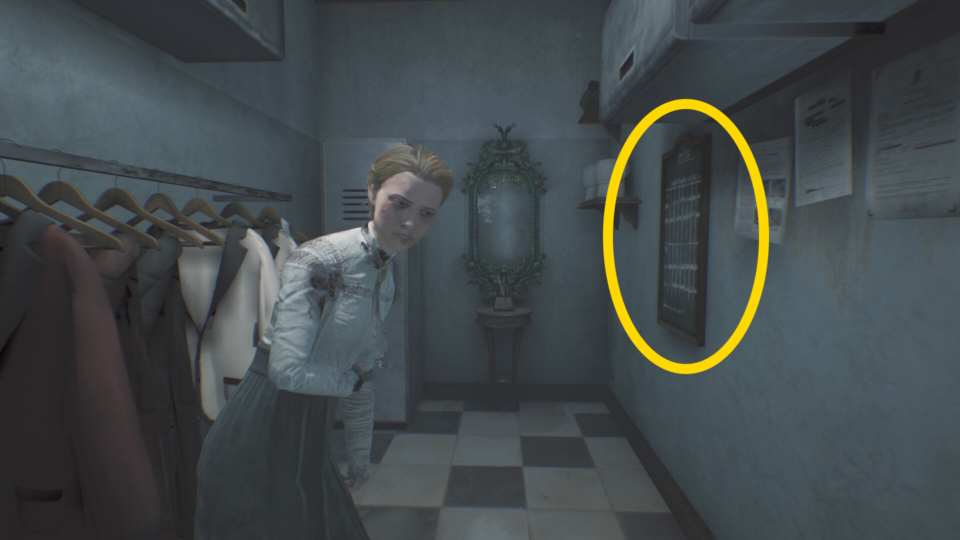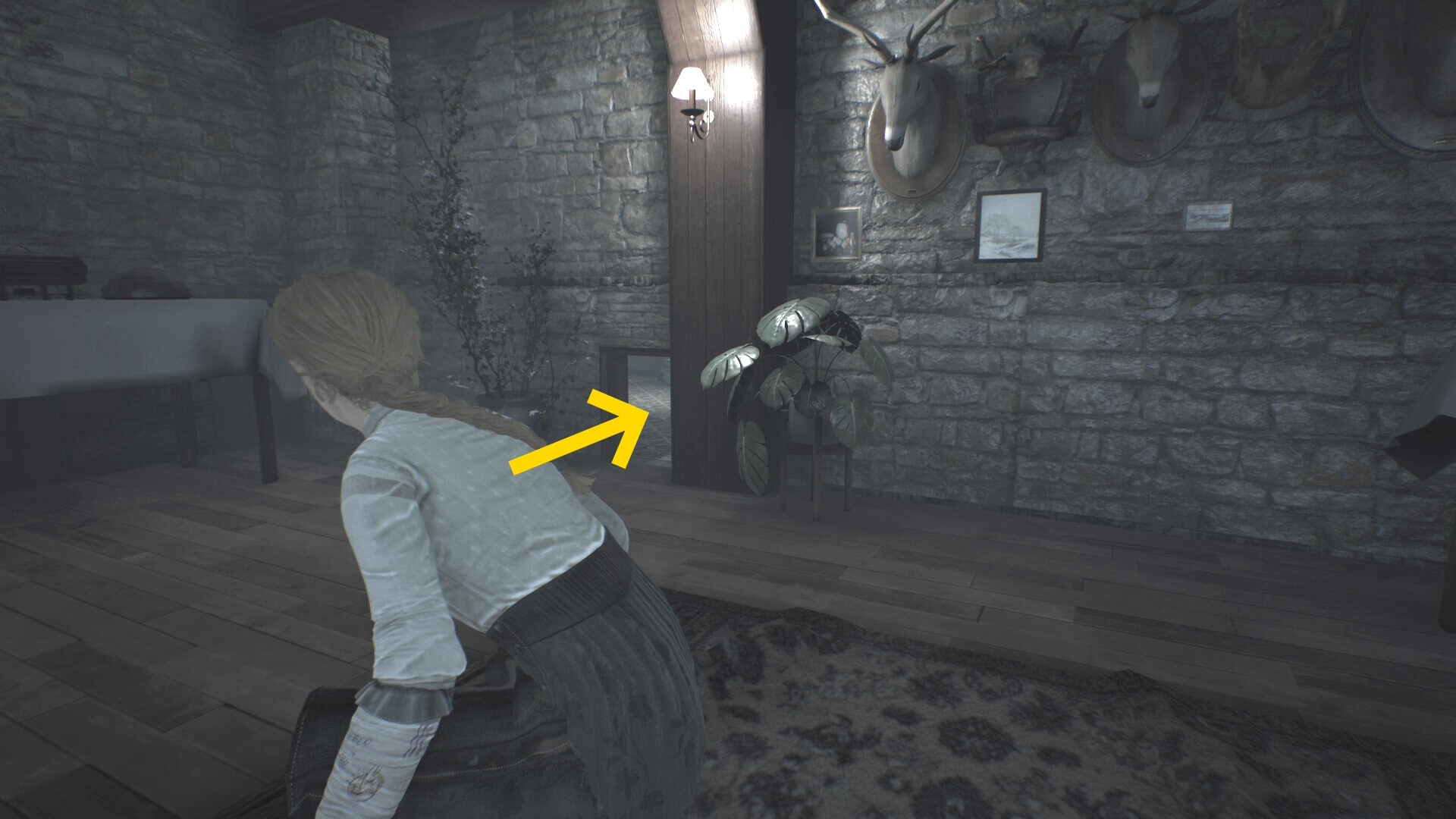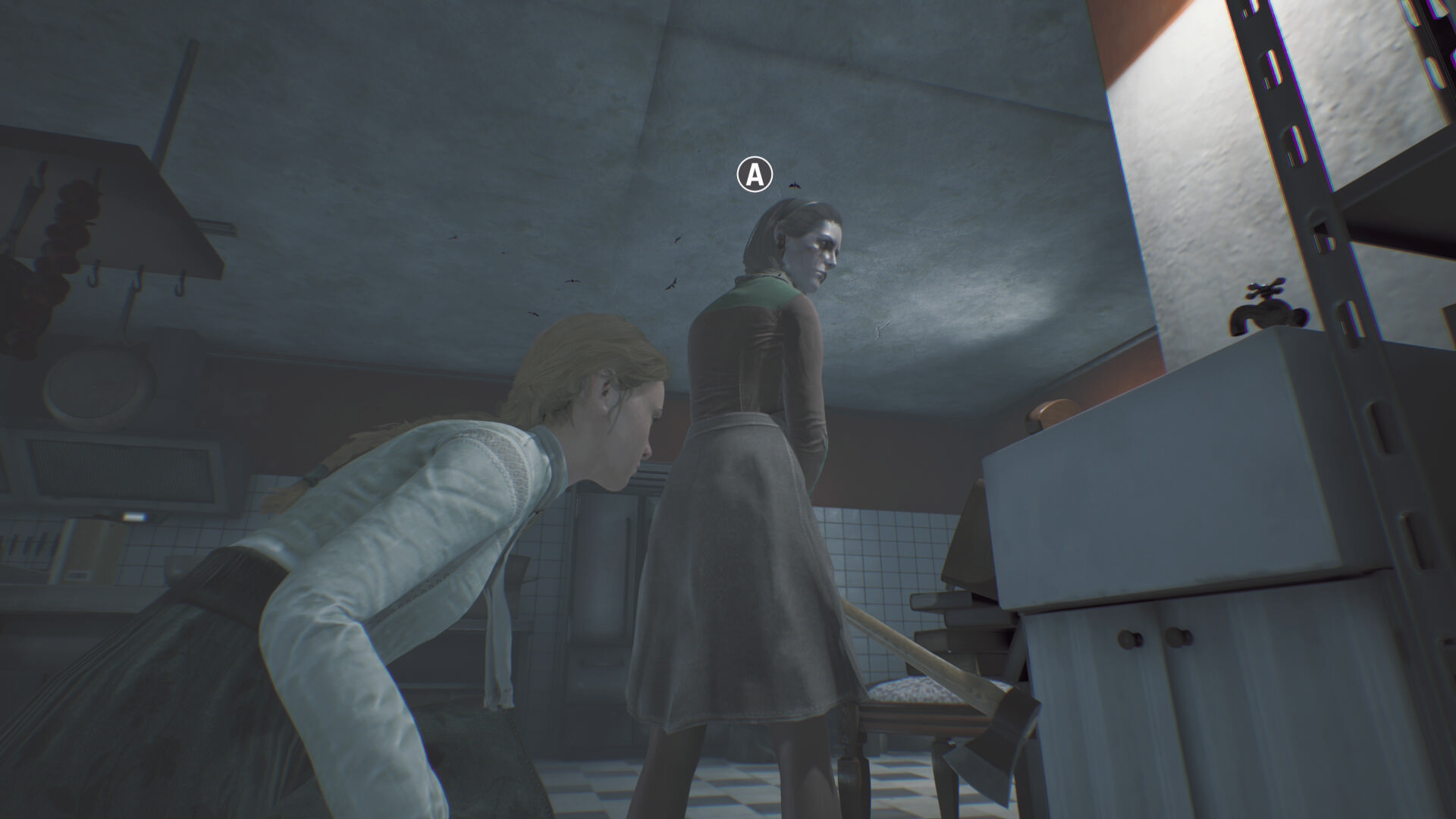 - トイレ内のクローゼットに近づき、A を押せばエリサが隠れる
