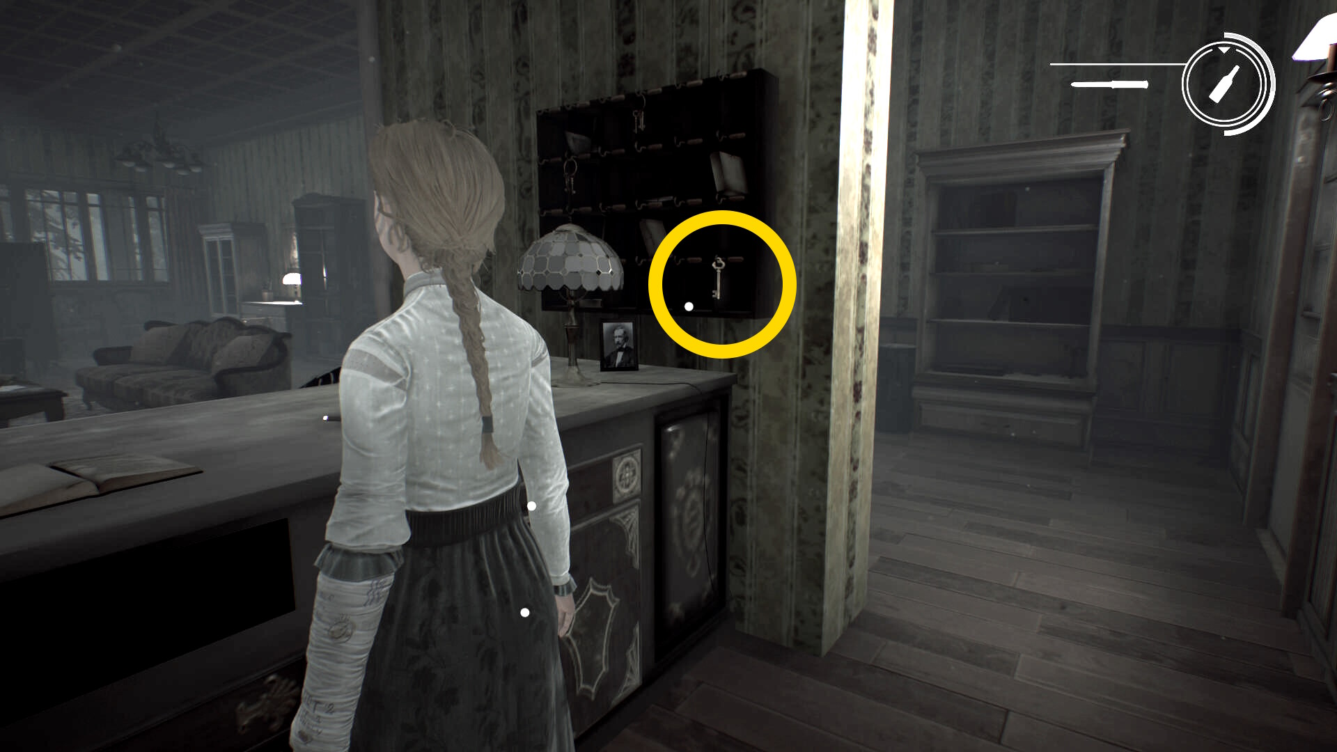 - 右のフロントに進み、カウンターデスク右端のキーホルダーから アシュマンの部屋の鍵 を回収