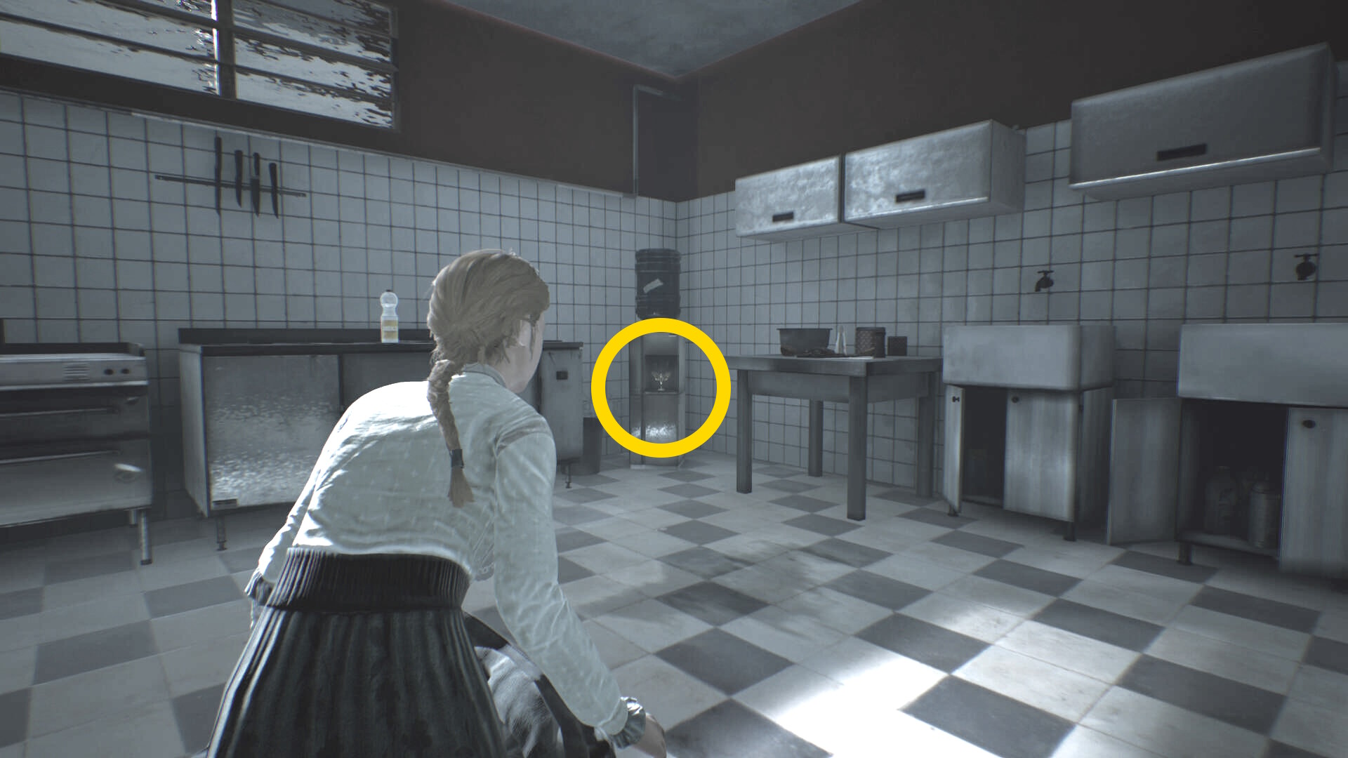 - ジュークボックスに誘導された赤い修道女に近づくが、右に見える数段の階段あたりまで来たら、しゃがみ移動時のダッシュはやめること (気づかれる)