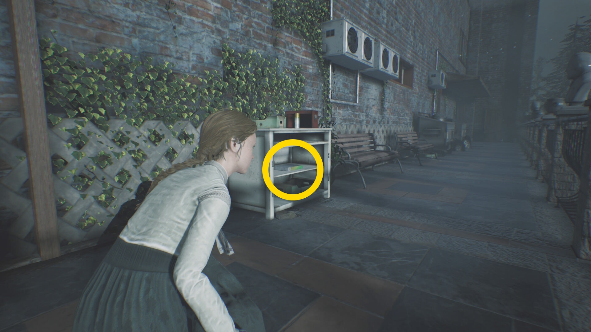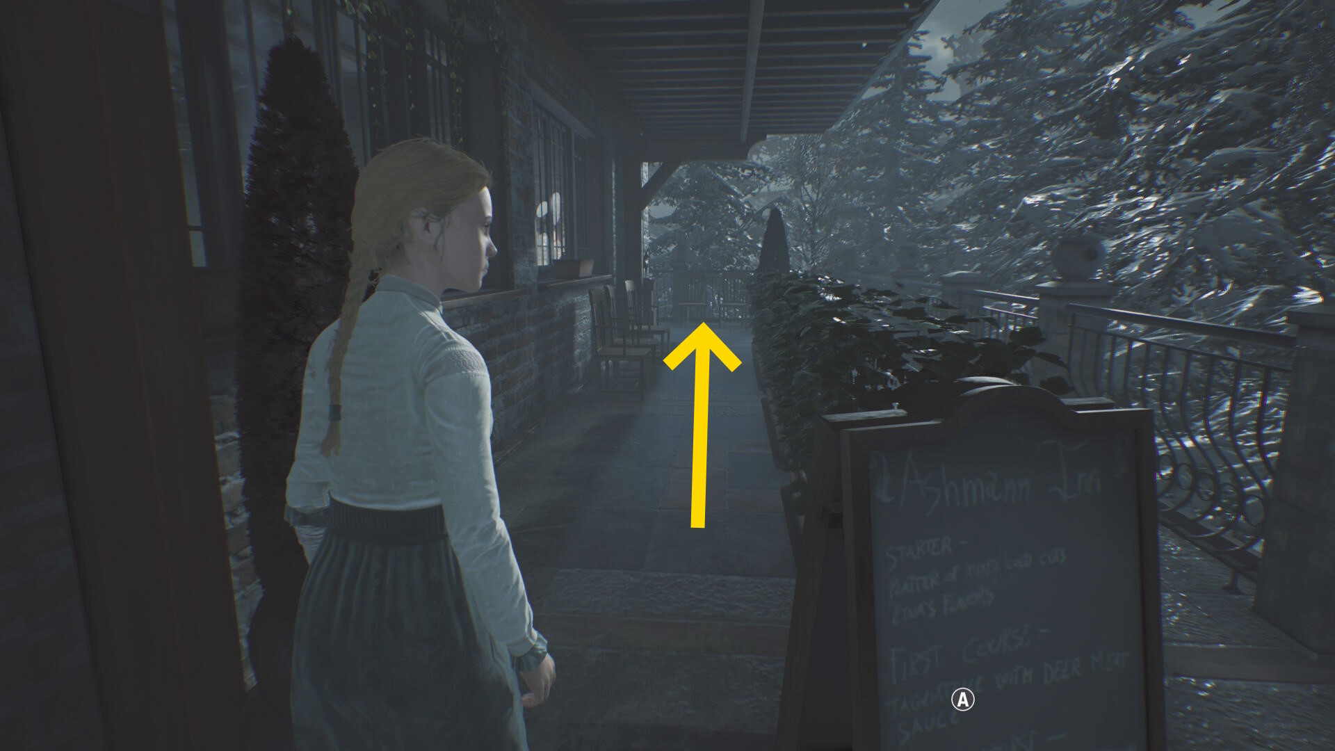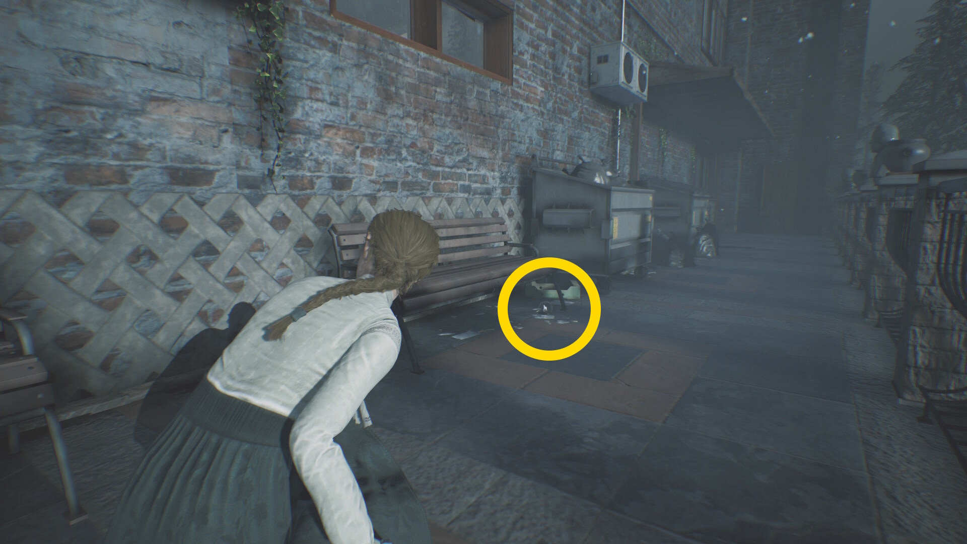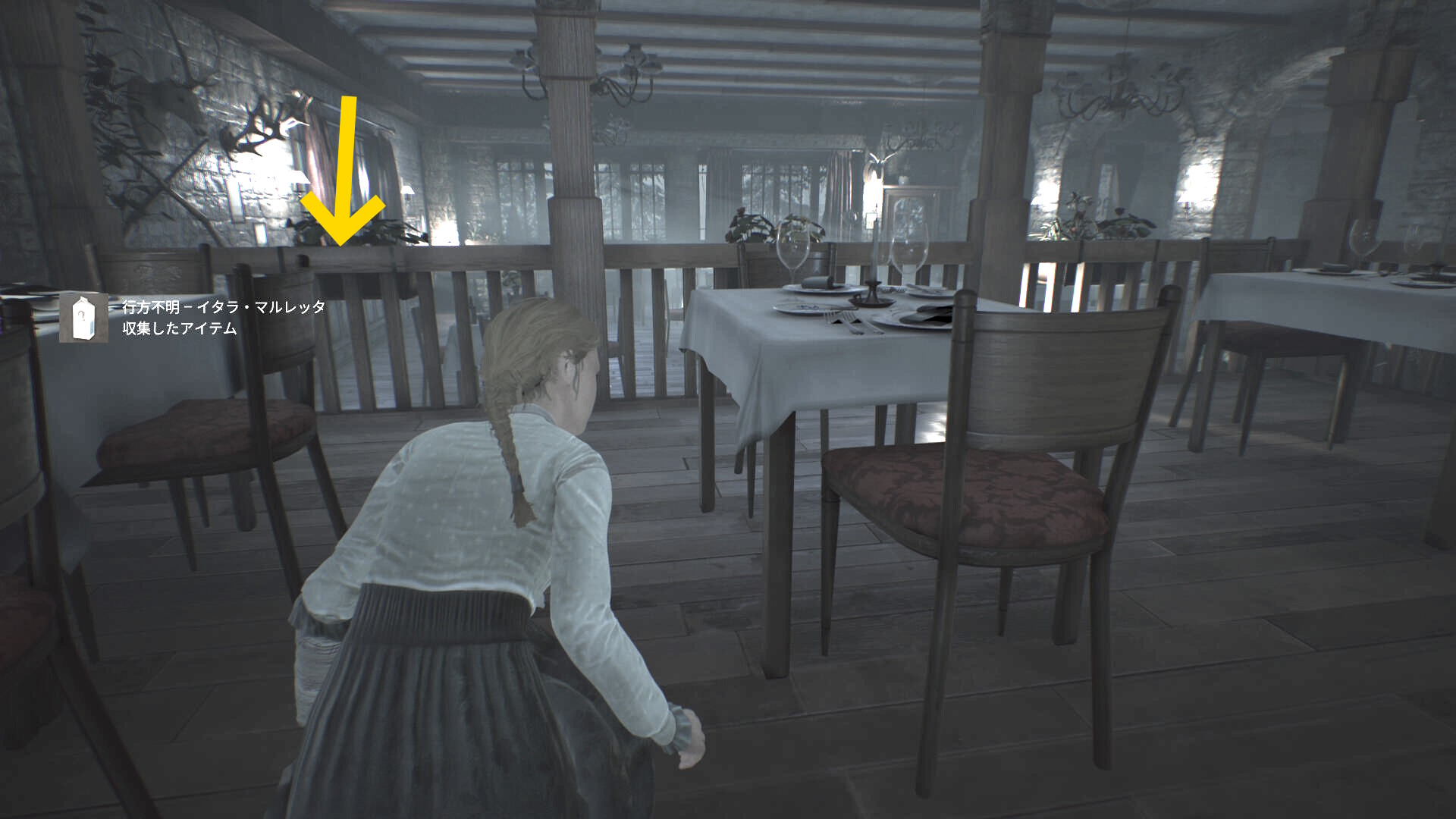 - 「行方不明 – イタラ・マルレッタ (牛乳パック:5/15)」を回収後、左前方の手すりを乗り越える ( B )
