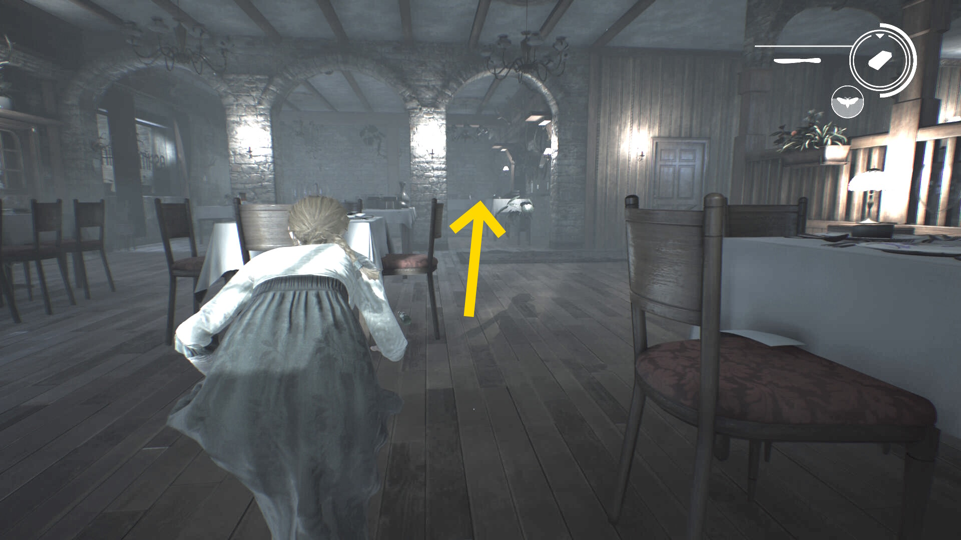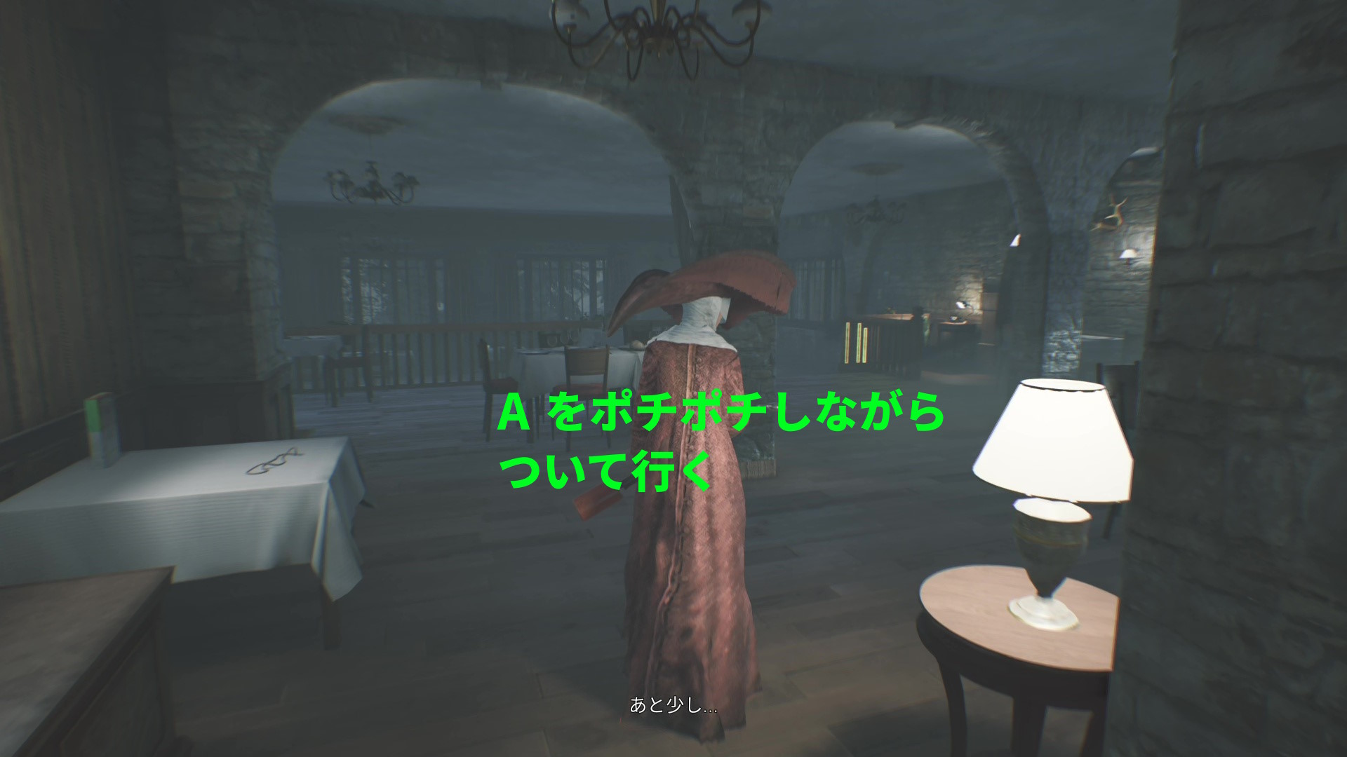 - A ボタンをポチポチしながら近距離を保っていれば、エリサがレストランを出た瞬間 (ベルが鳴った瞬間)に驚かすことができる