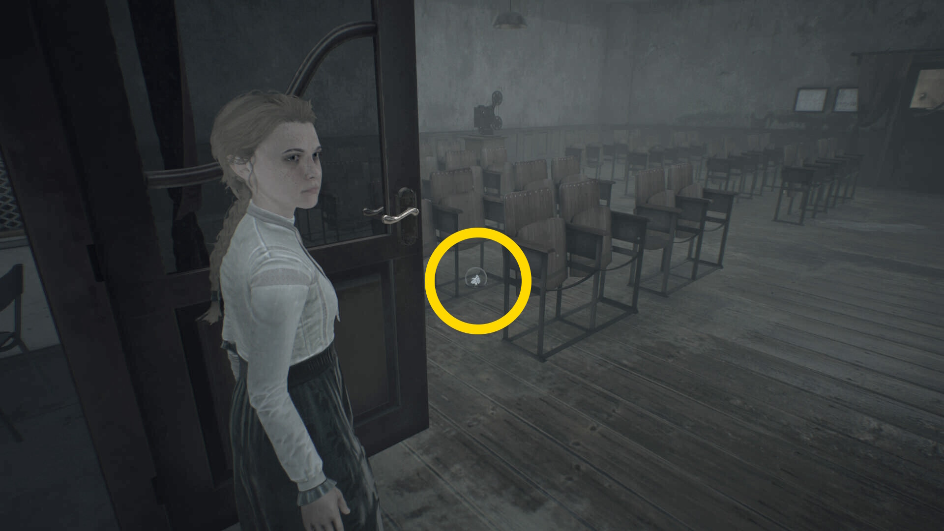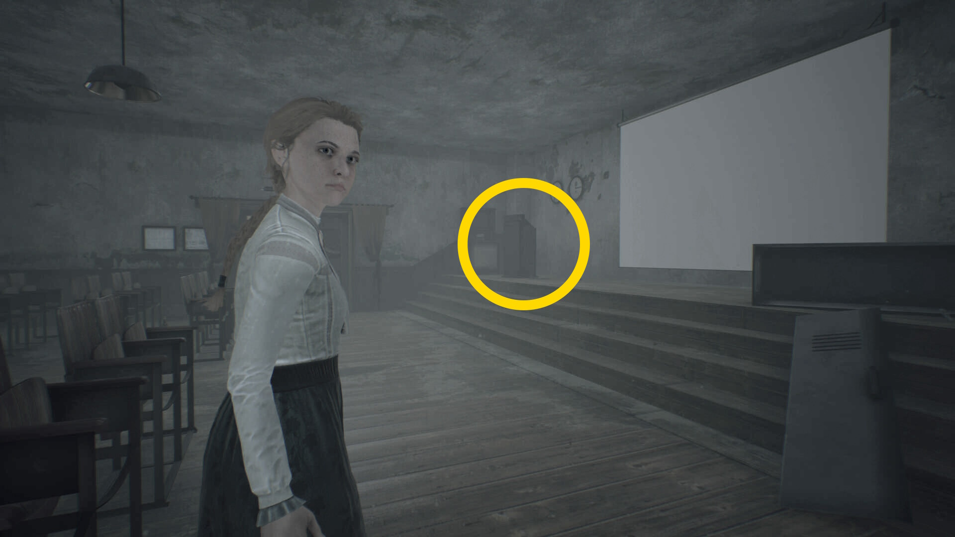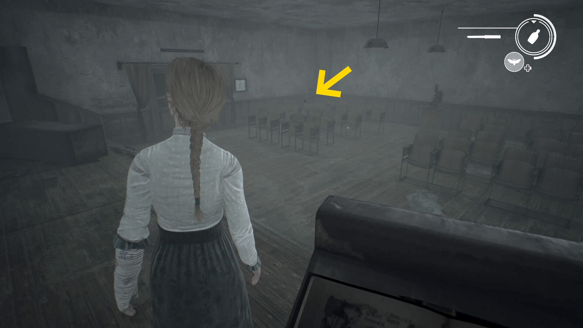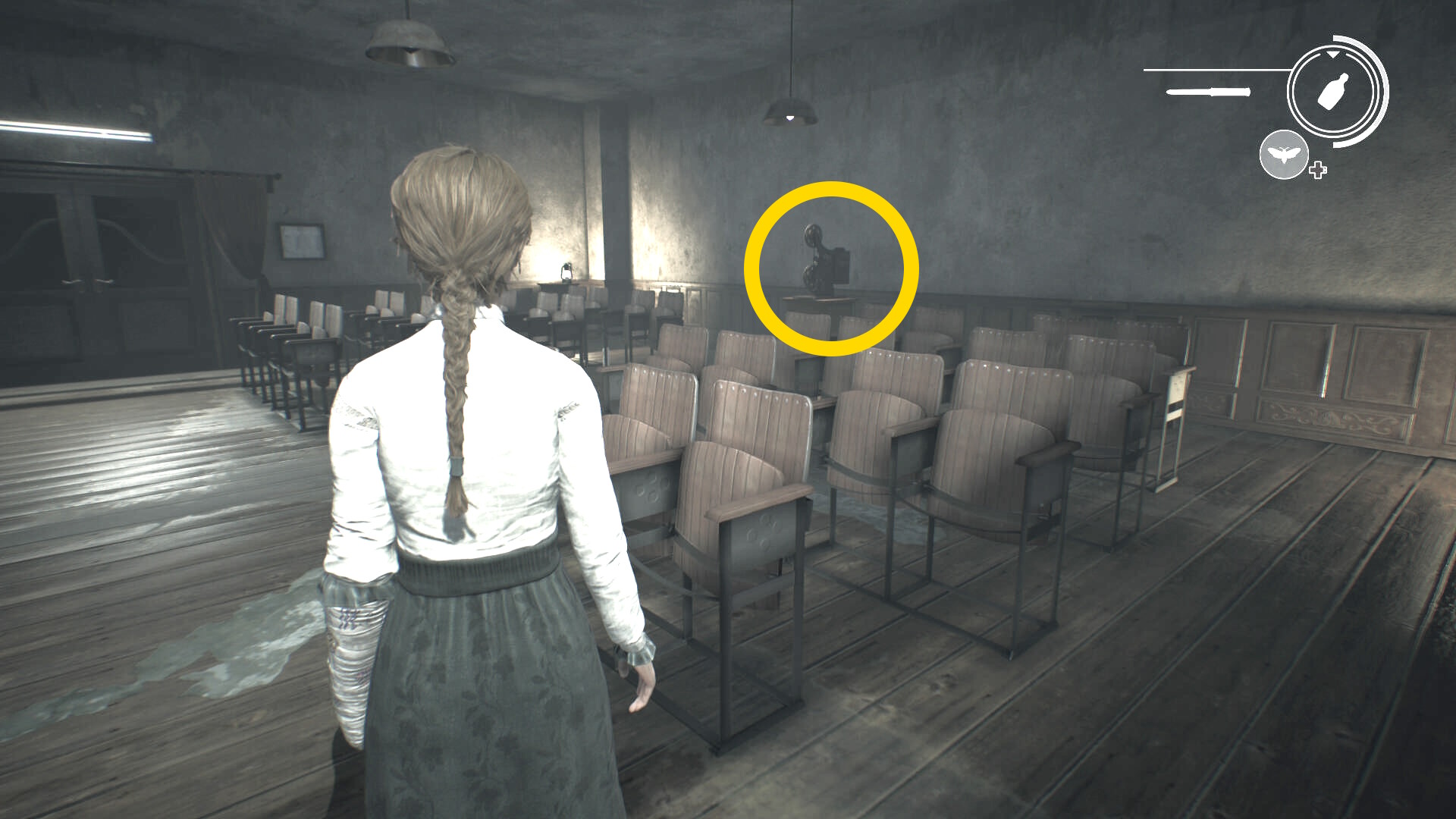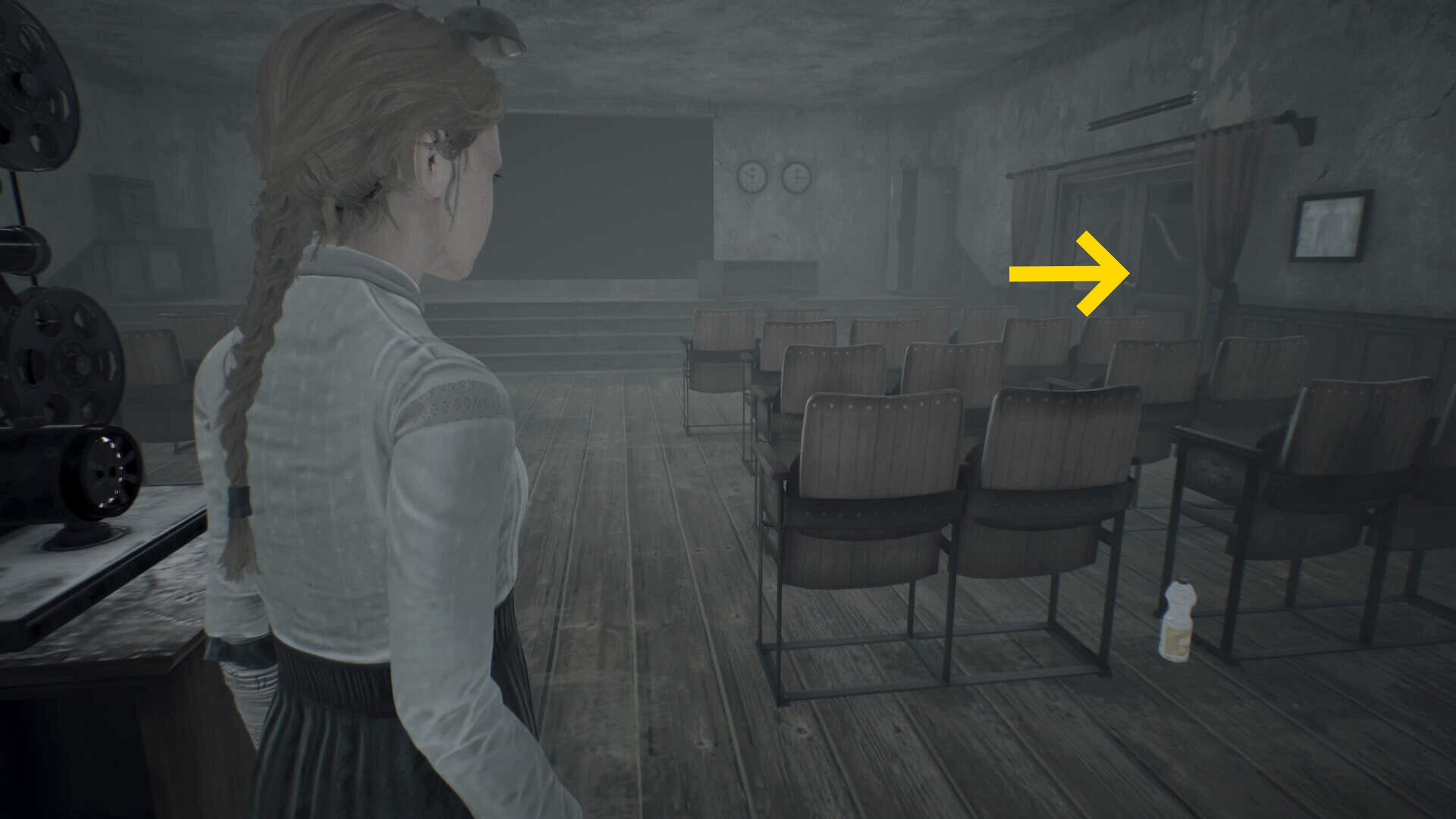 • 左に進んでいき、映写室のドアに近づくと目標が更新される (下画像:紫矢印)