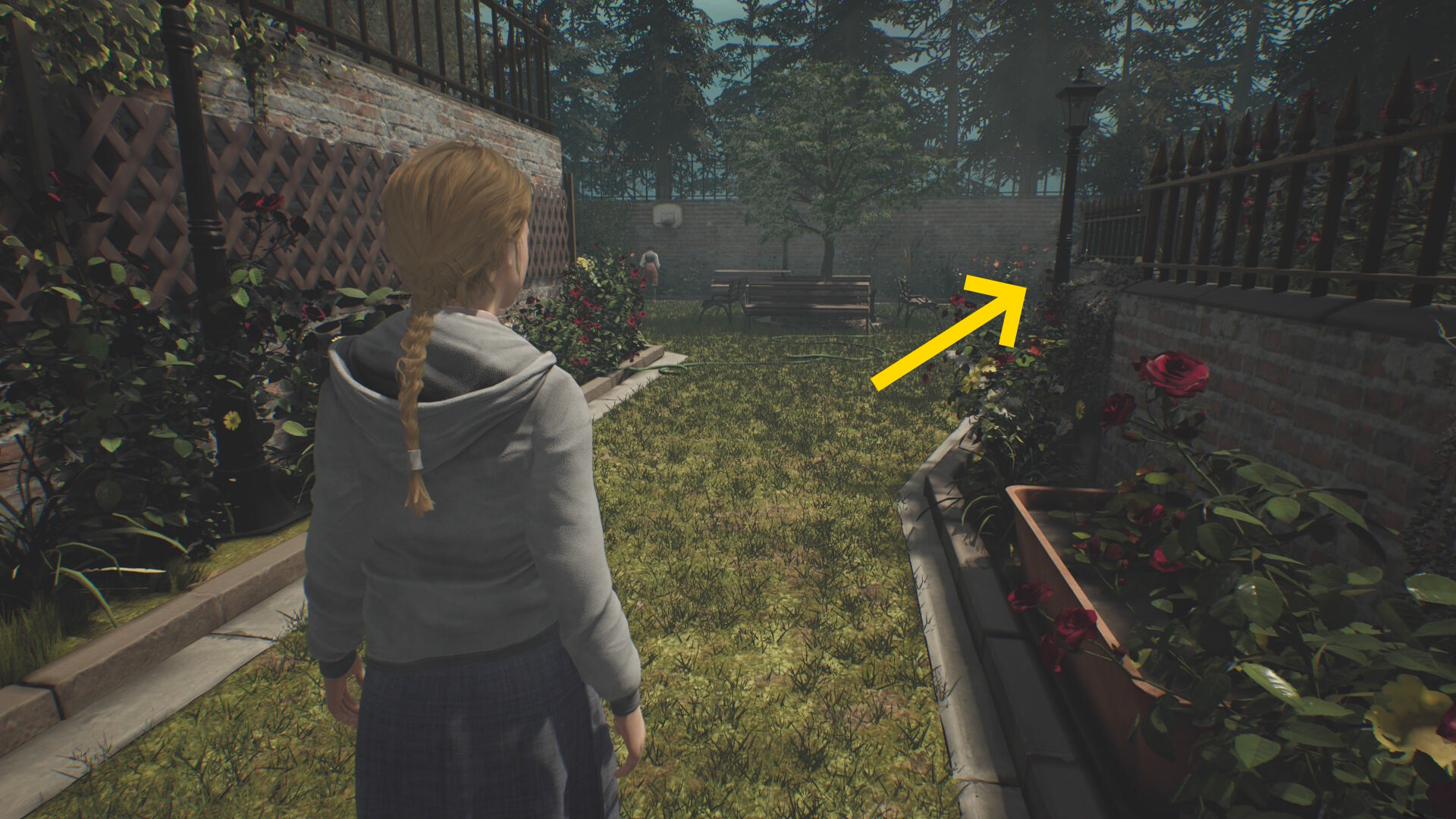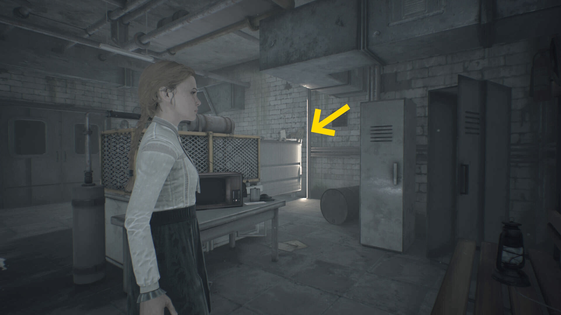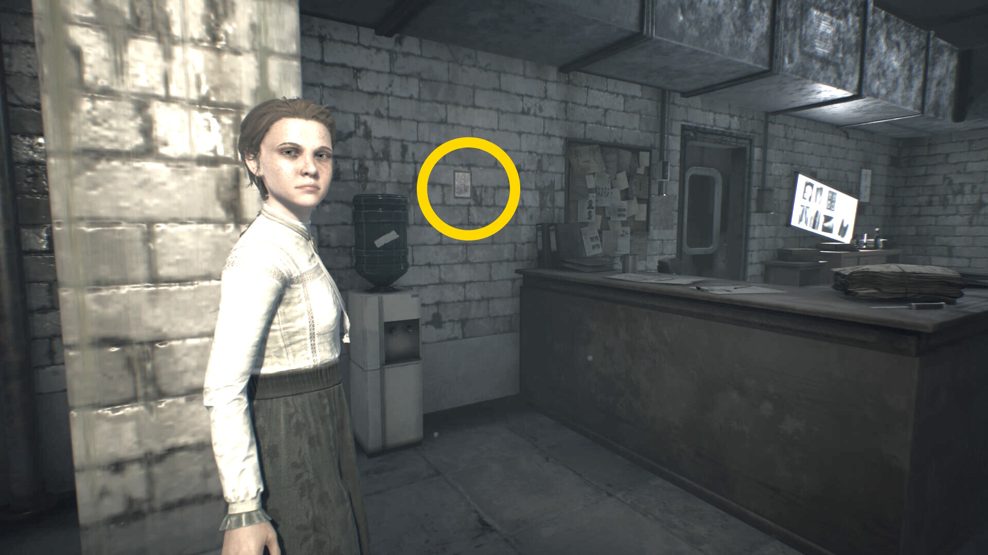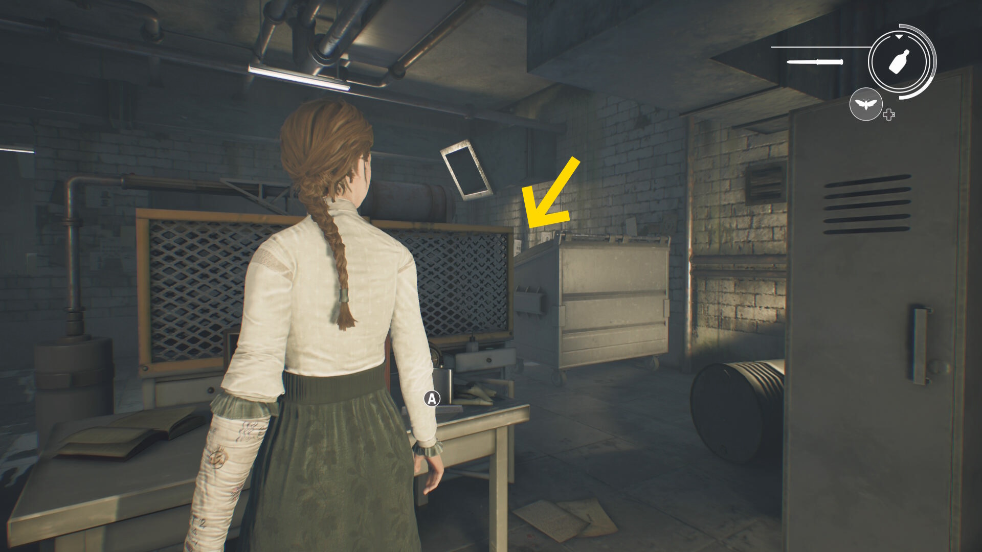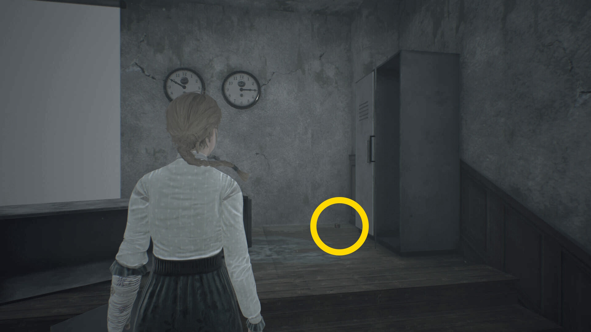 • 左に進んでいき、映写室のドアに近づくと目標が更新される (下画像:紫矢印)