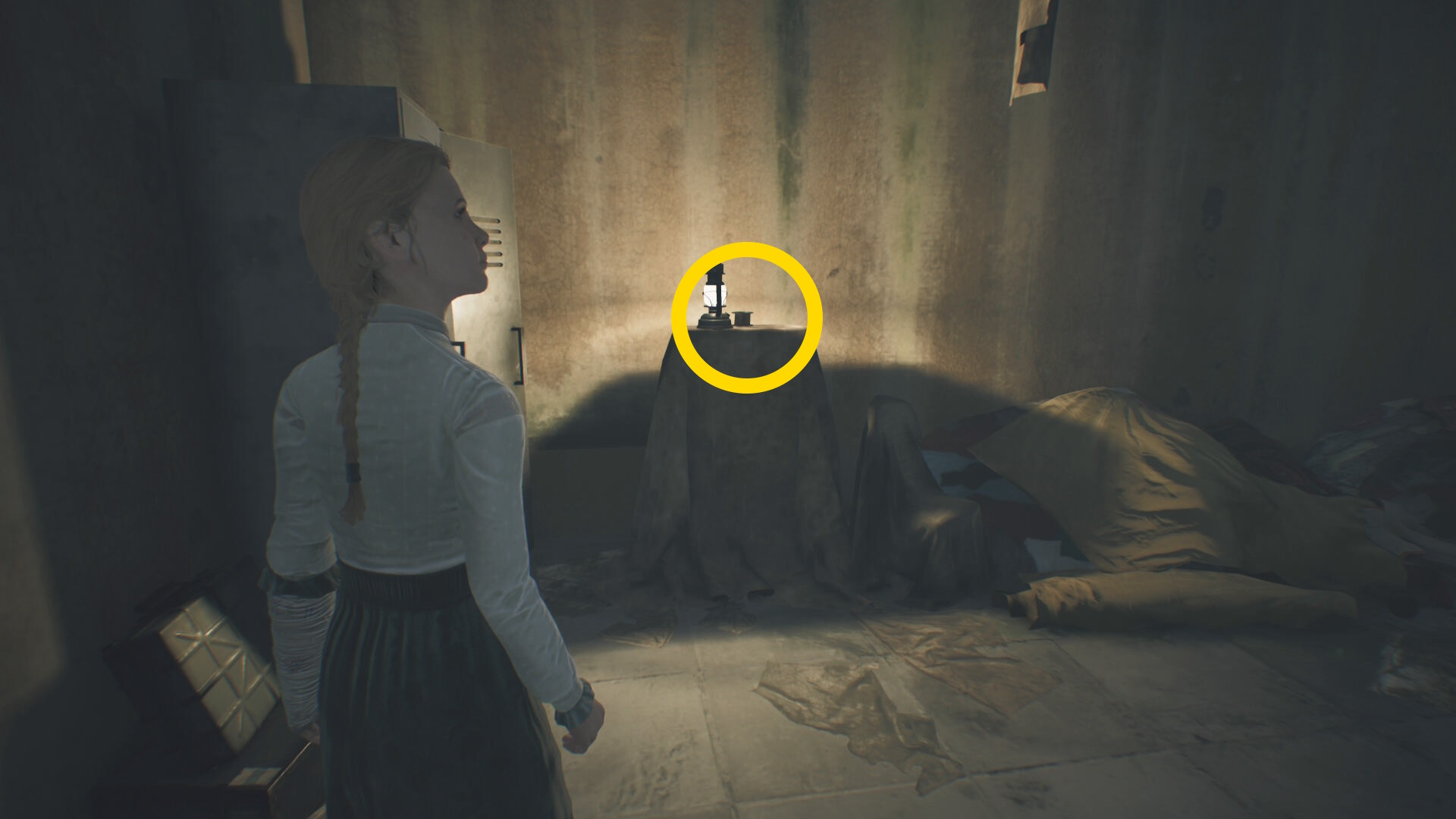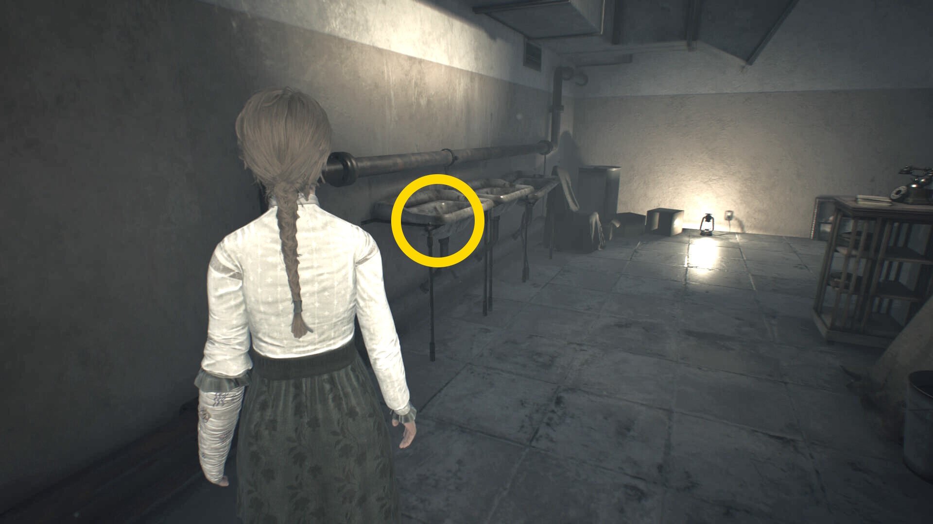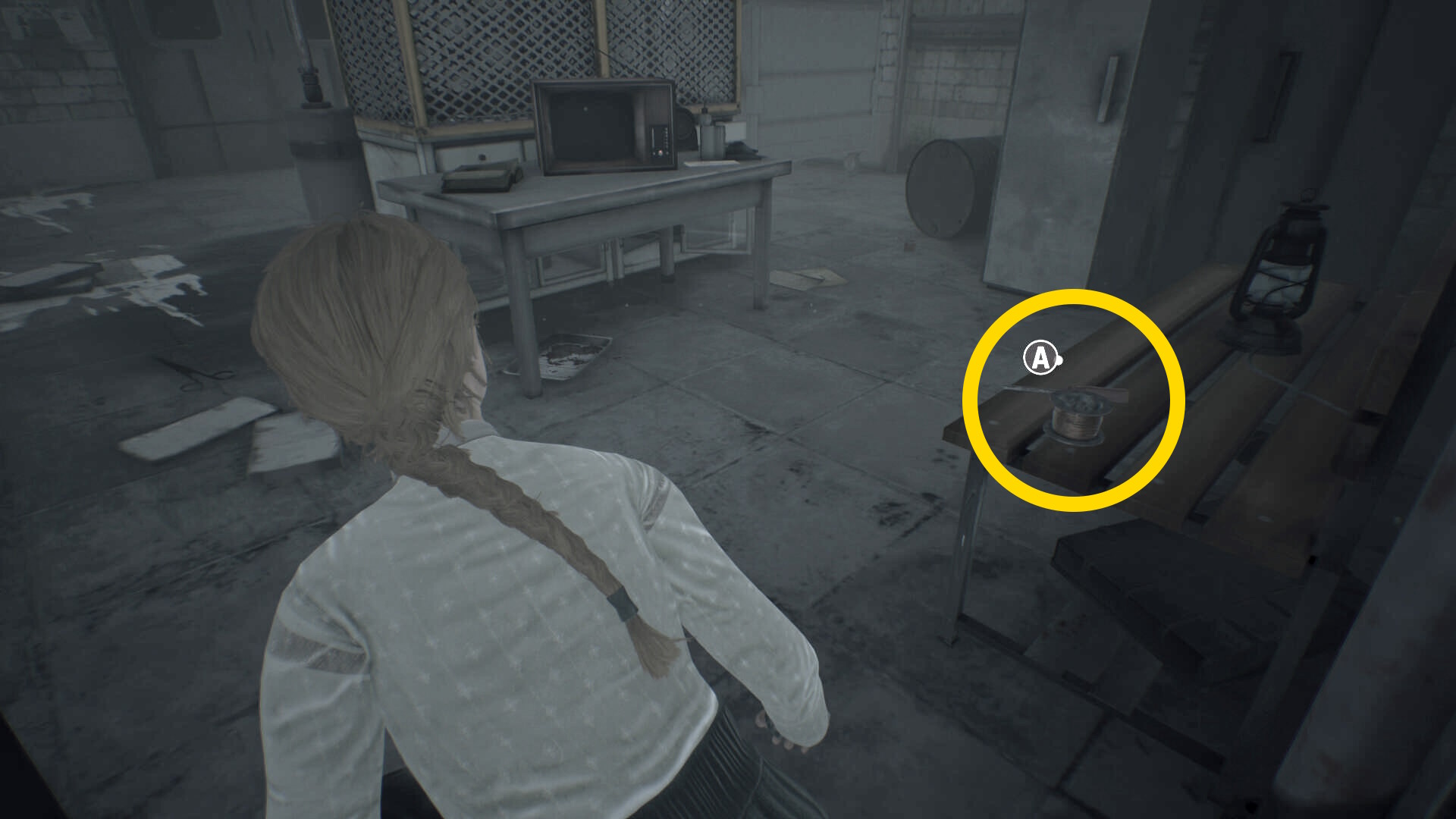 • 隣の部屋に入ってすぐ右のベンチに防御アイテムと 金属ワイヤ
