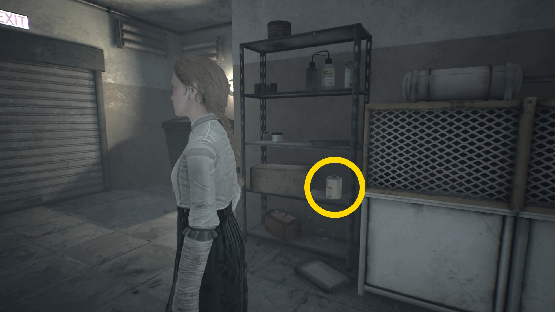 • 映写室の反対側のドアが見え、その真向かいのスチールラックの下段に 行方不明 – カティア・アンブロシオ (牛乳パック:9/15)