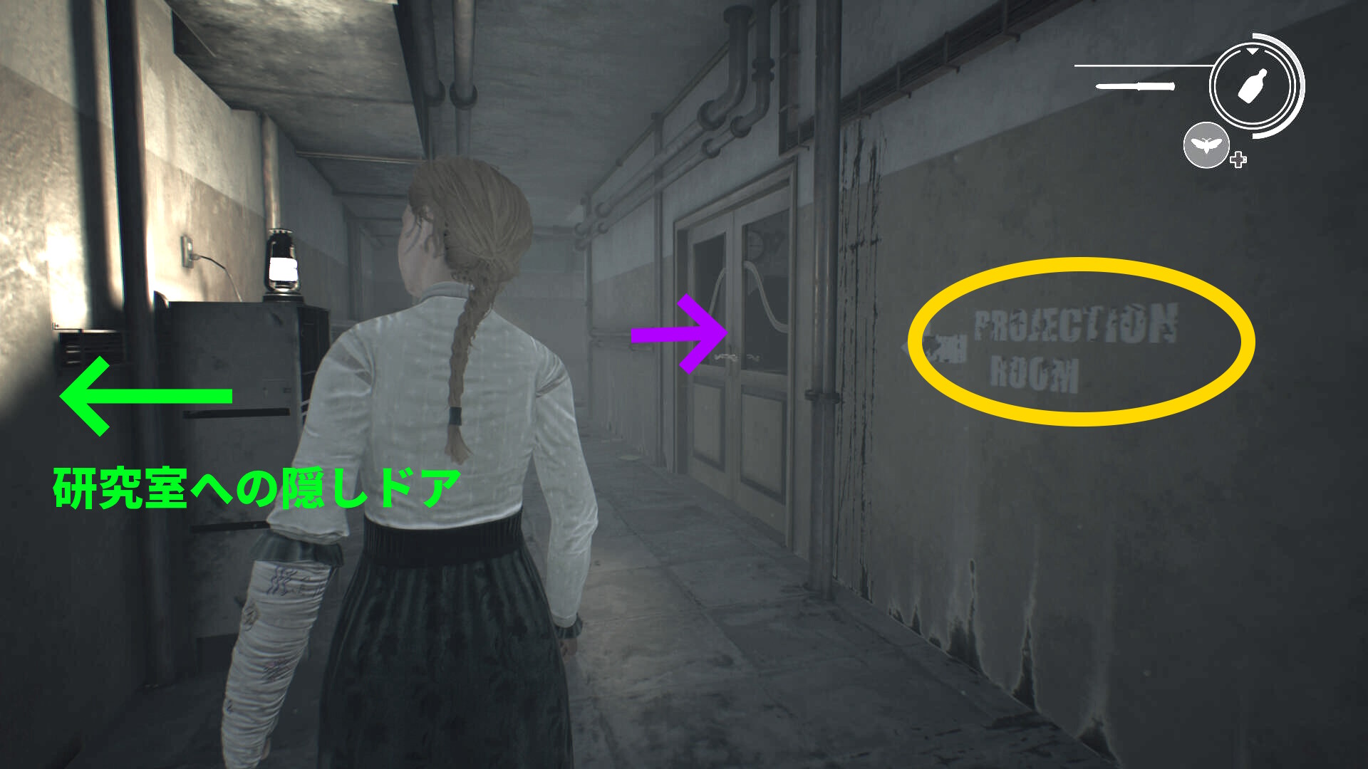 • 研究室への隠しドアは「 PROJECTION ROOM 」の表示の真向かいにある
