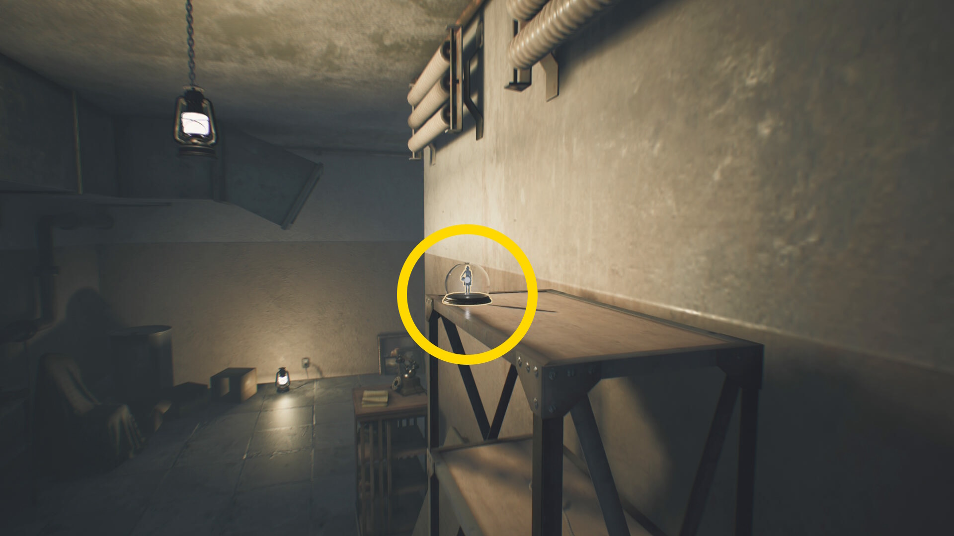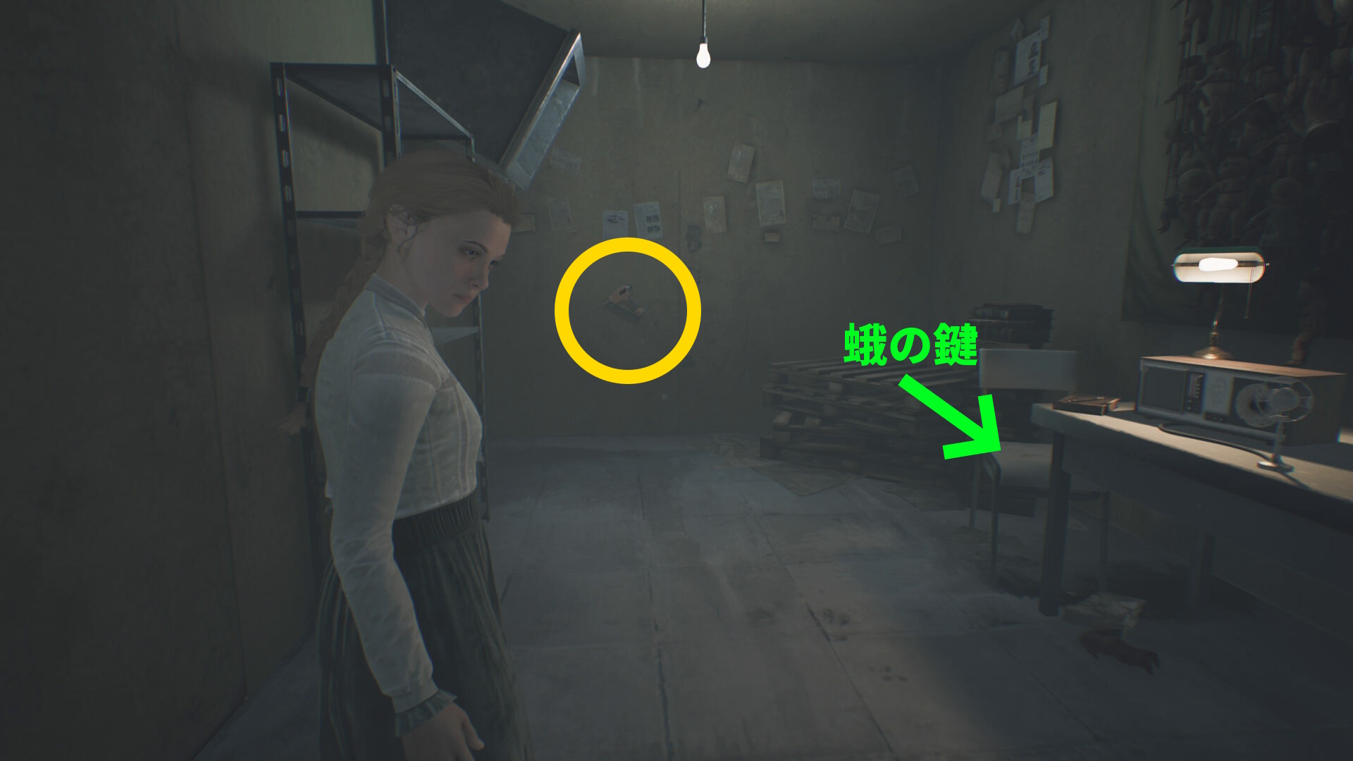• 床に 金属ワイヤ、その奥のランタンが乗るドラム缶の上に 蛾の鍵