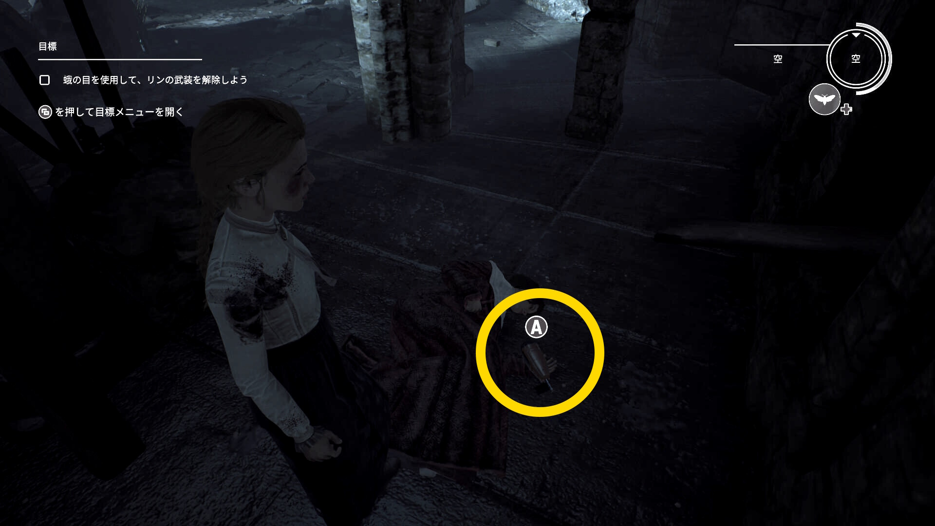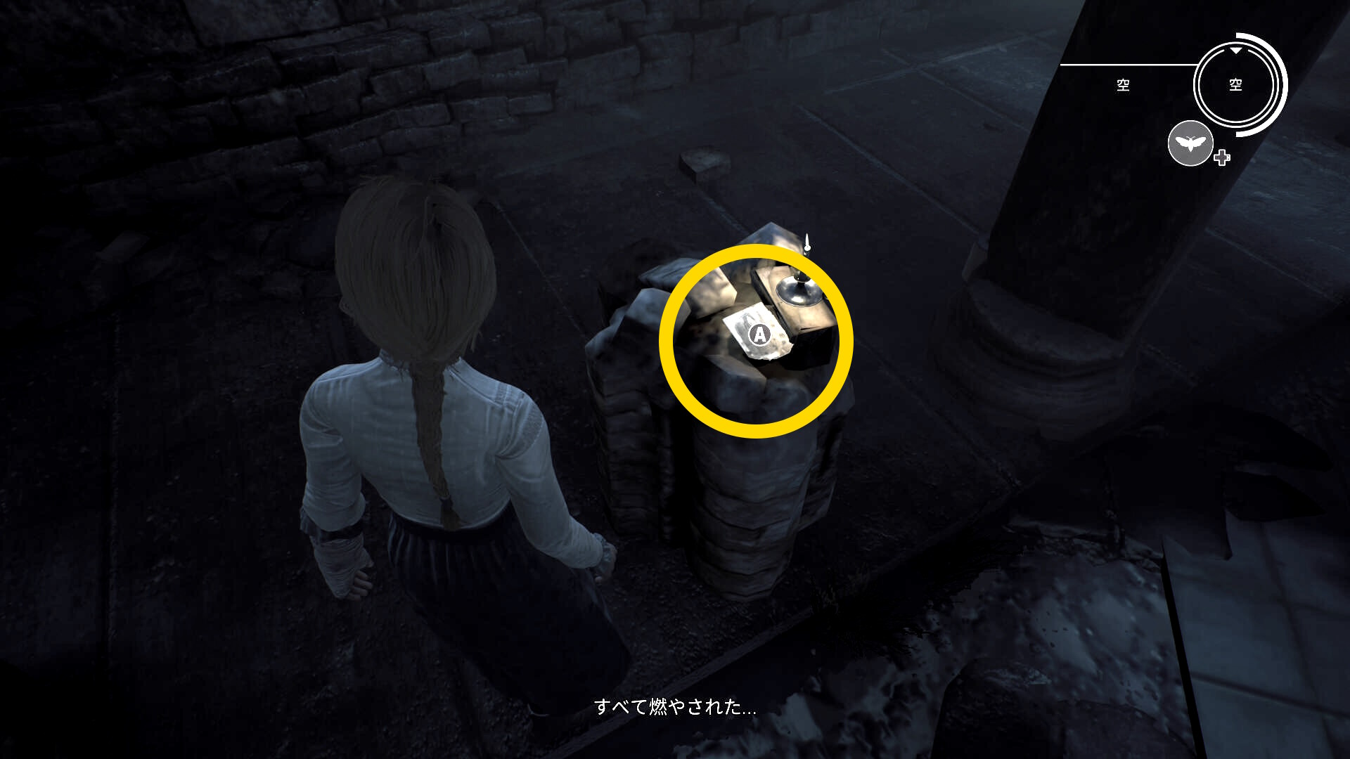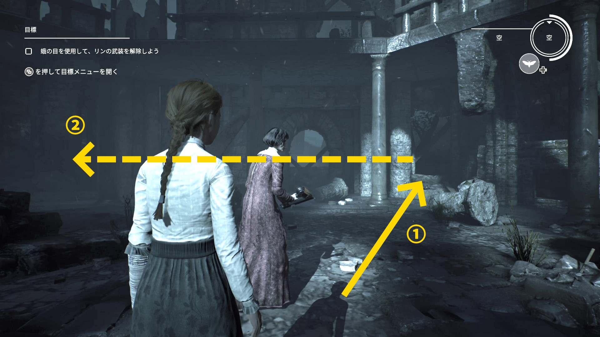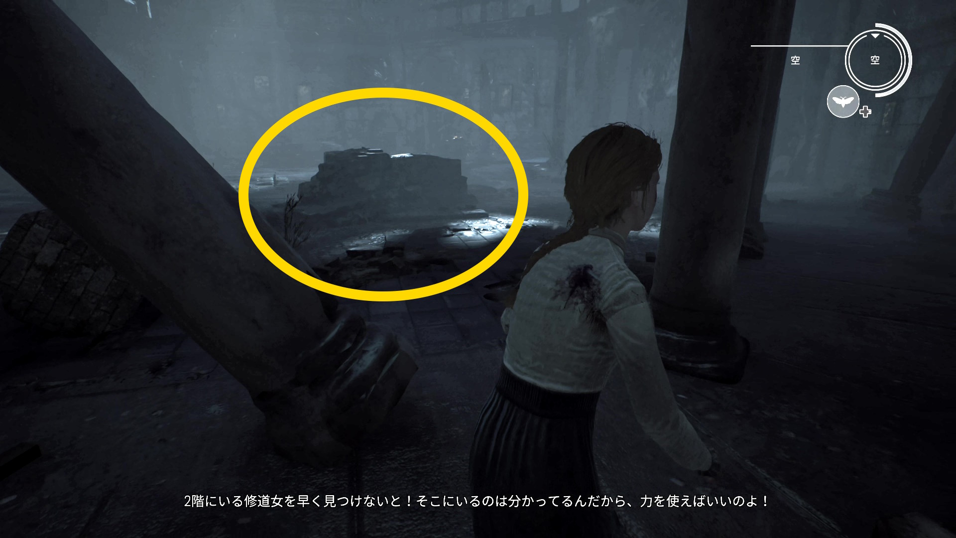 - リンがセレステを見失っている&レンガを3個回収したら、上階にいる赤い修道女に向かって蛾の目を発動