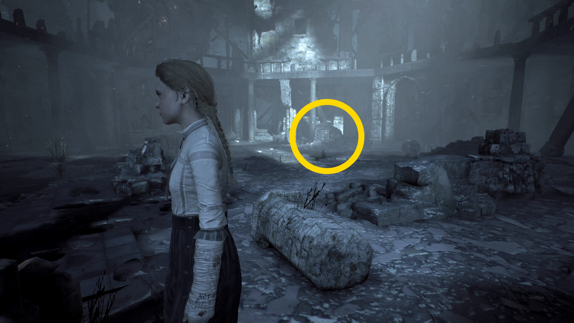 - 左に移動すると画面奥に「壁の名残り」のようなものが見え、そこにレンガがたくさん置かれているので回収すること (下画像2枚目)