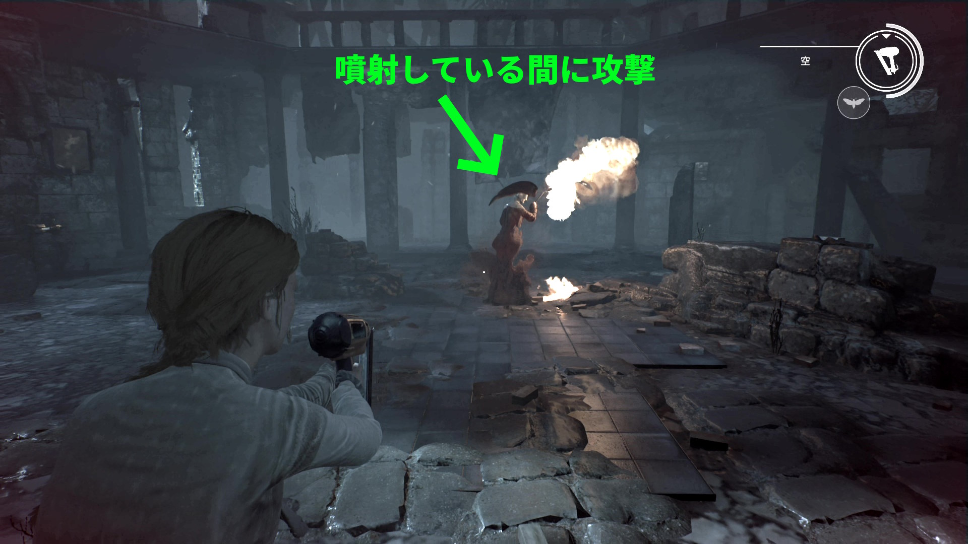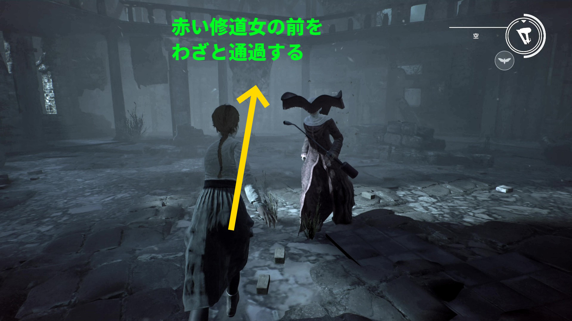 - そのため、わざと赤い修道女の前をダッシュで通過し、噴射を誘発させたところをネイルガンで攻撃する