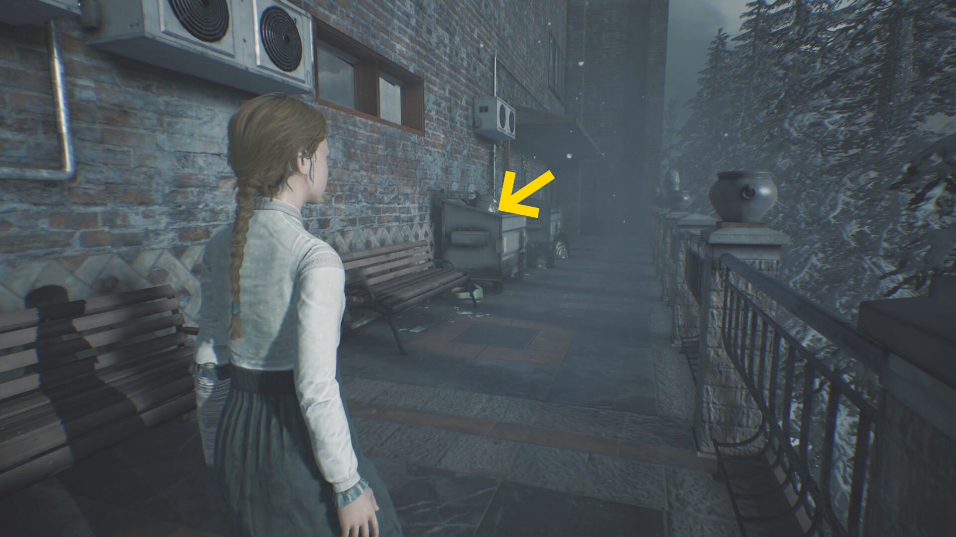 - 左に進み、ゴミコンテナの中に 蛾の鍵 (下画像2枚目)