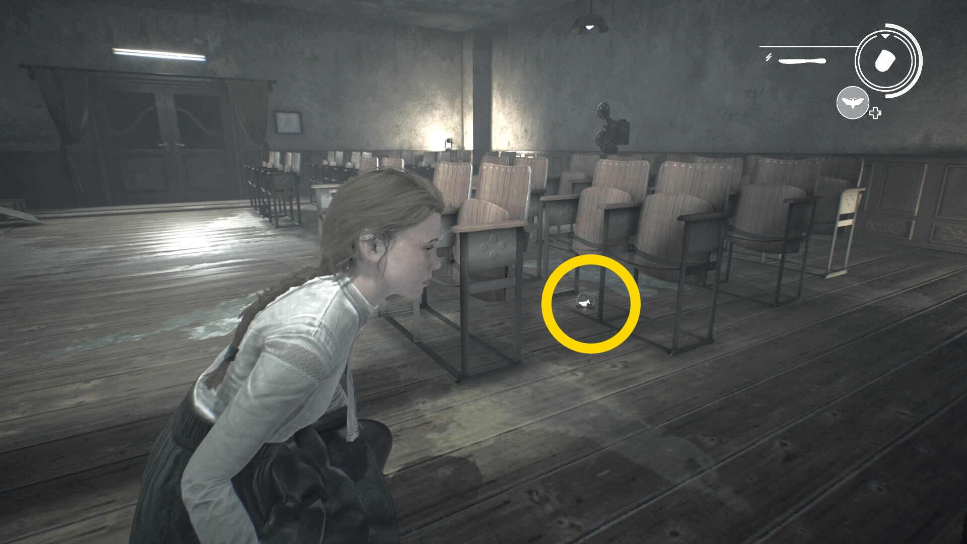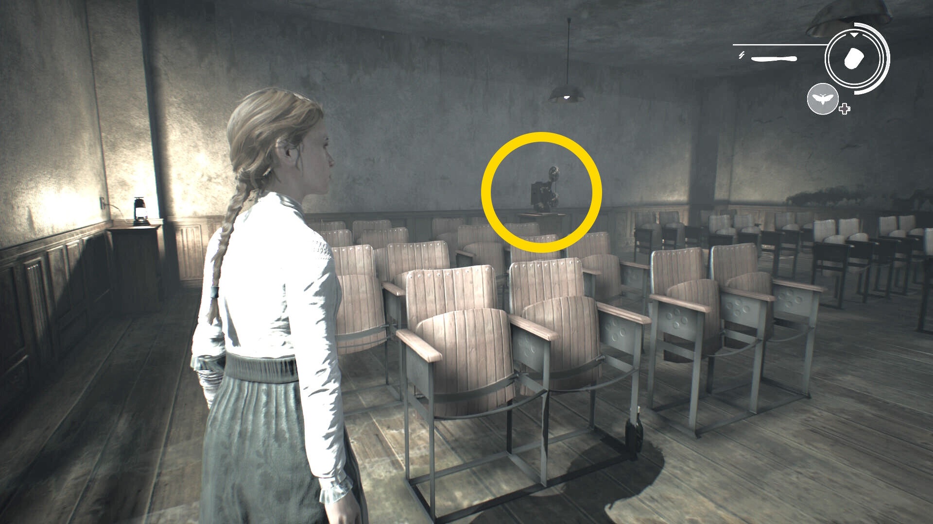 - 見つかったら、一旦廊下に出てぐるっと回って映写室に戻り、映写機でフィルムを再生しよう