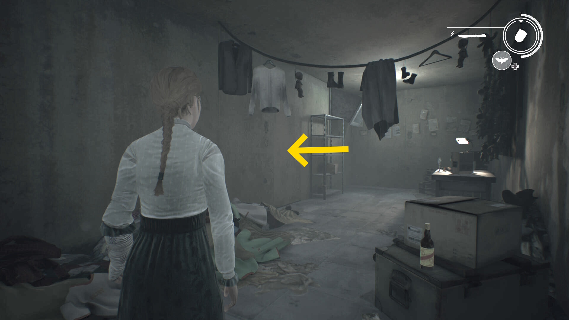 - 隠し部屋に入ったら、ロッカー近くの服の山にある 蛾の鍵 を先に回収する