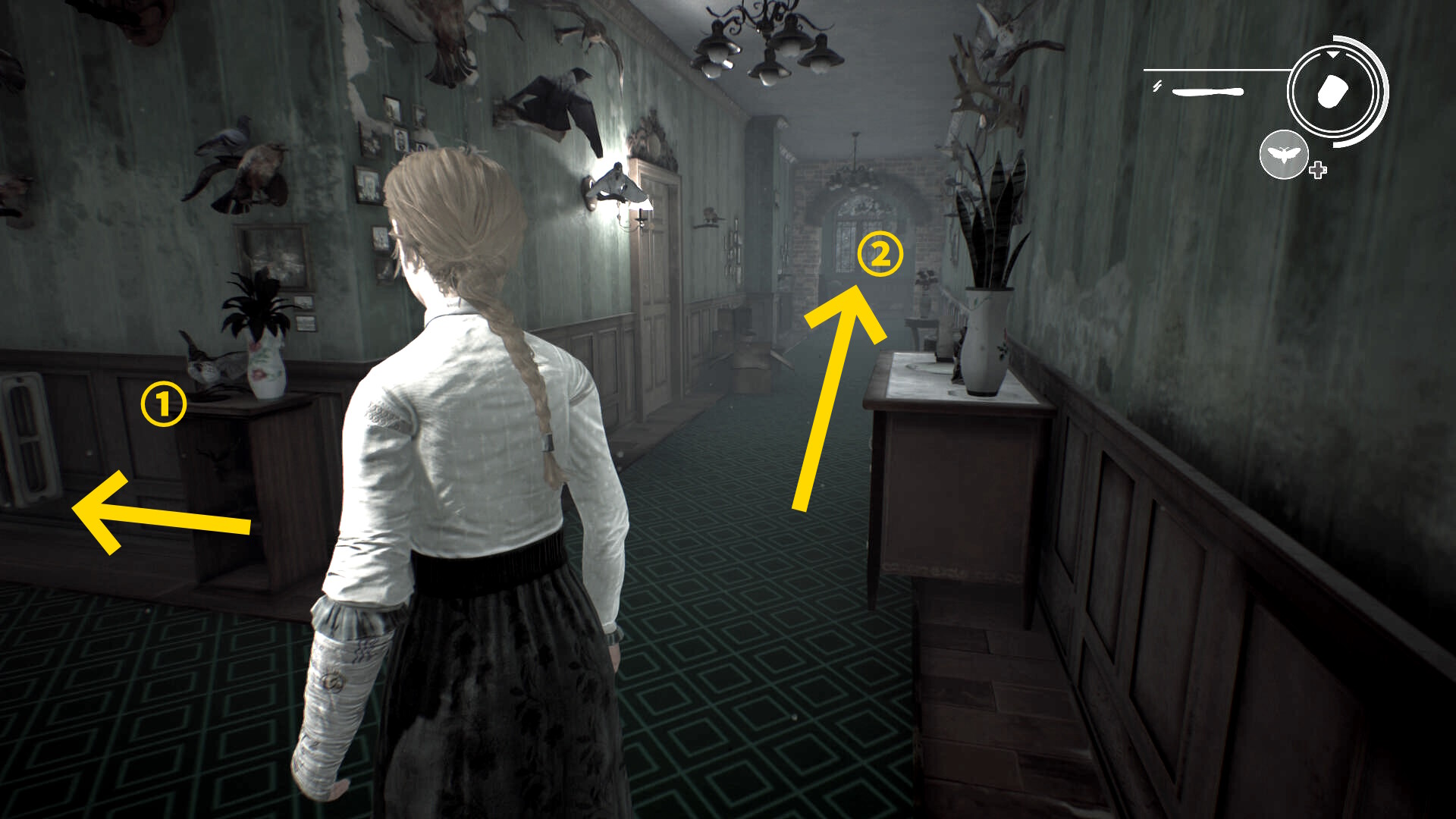 - 映画室は正面の廊下の突き当りにある (下画像②)が、先に収集物を回収するため、左へ (下画像①)