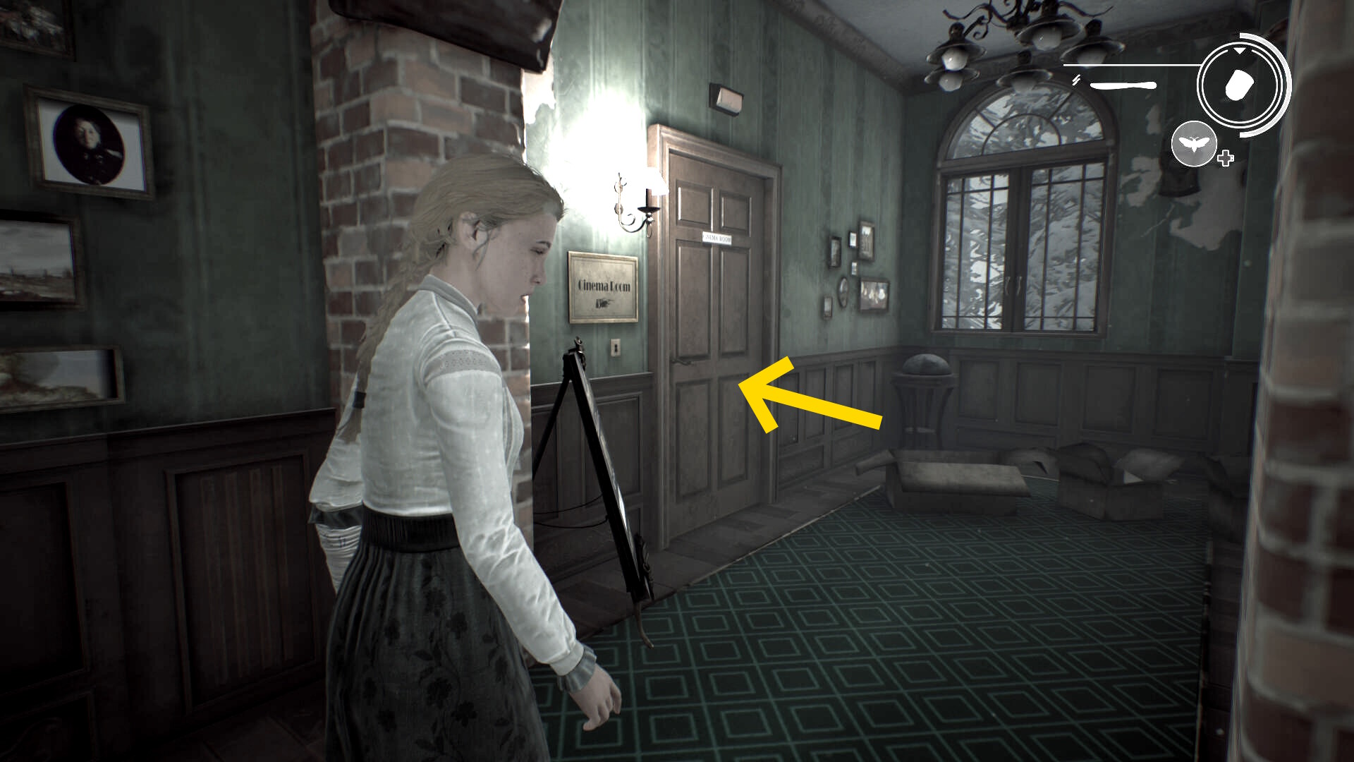 - すぐ左の隠しドアを開け、廊下をぐるっと進んで映写室に入る