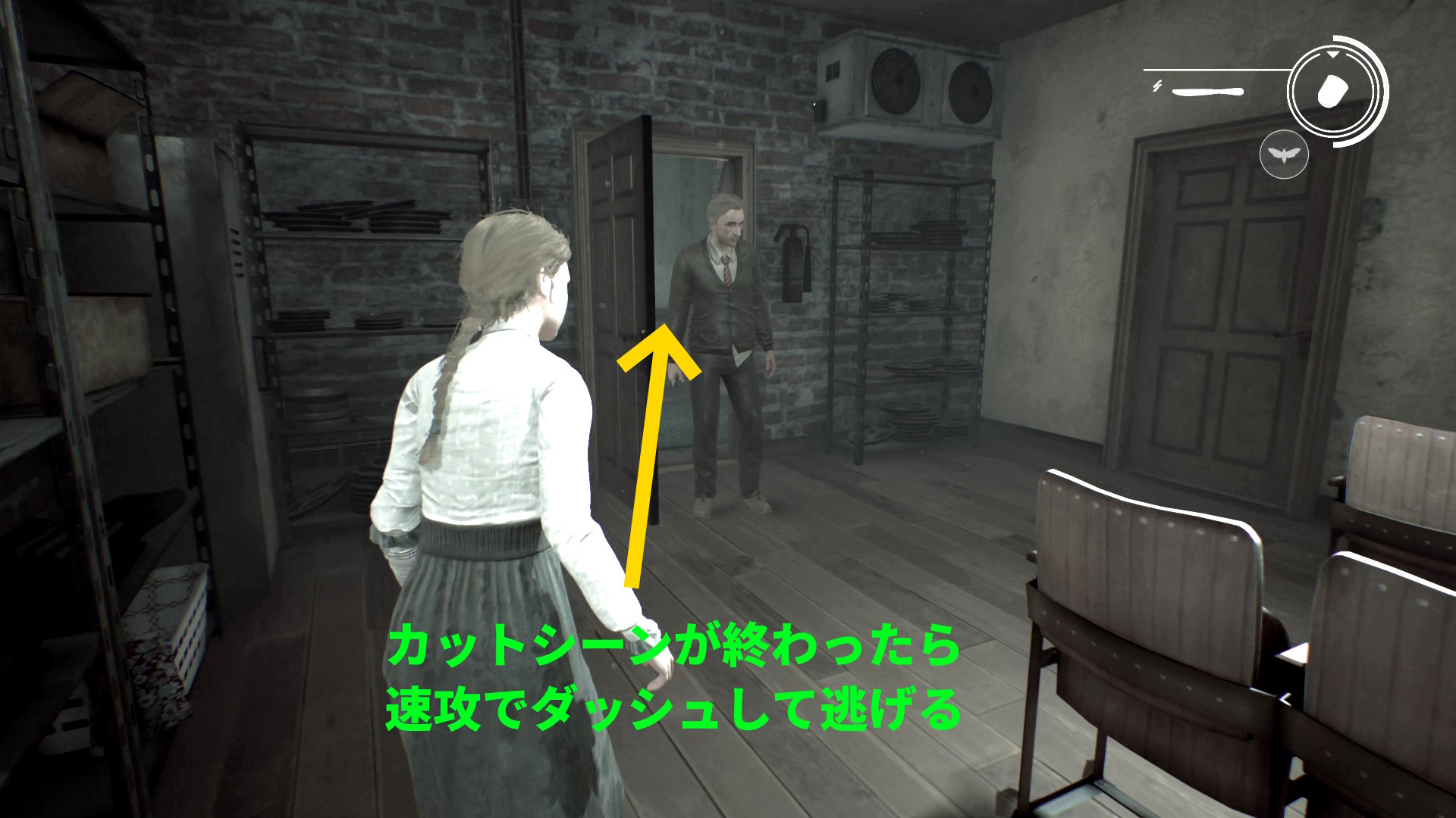 - カットシーンが終わったら、ダッシュでドアに向かい (ドアが閉じるときがあるので A ポチポチしながら)、212号室に向かってひたすら走っていこう
