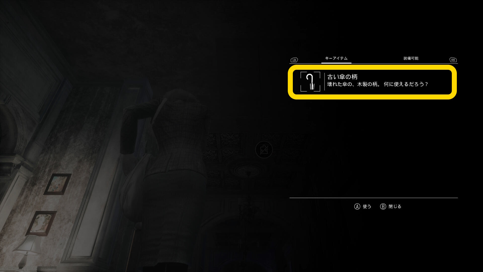 - 2階のエレベーター前に戻り、吊り下げられた取っ手の前でインベントリを開き、「古びた傘の柄」を使う
