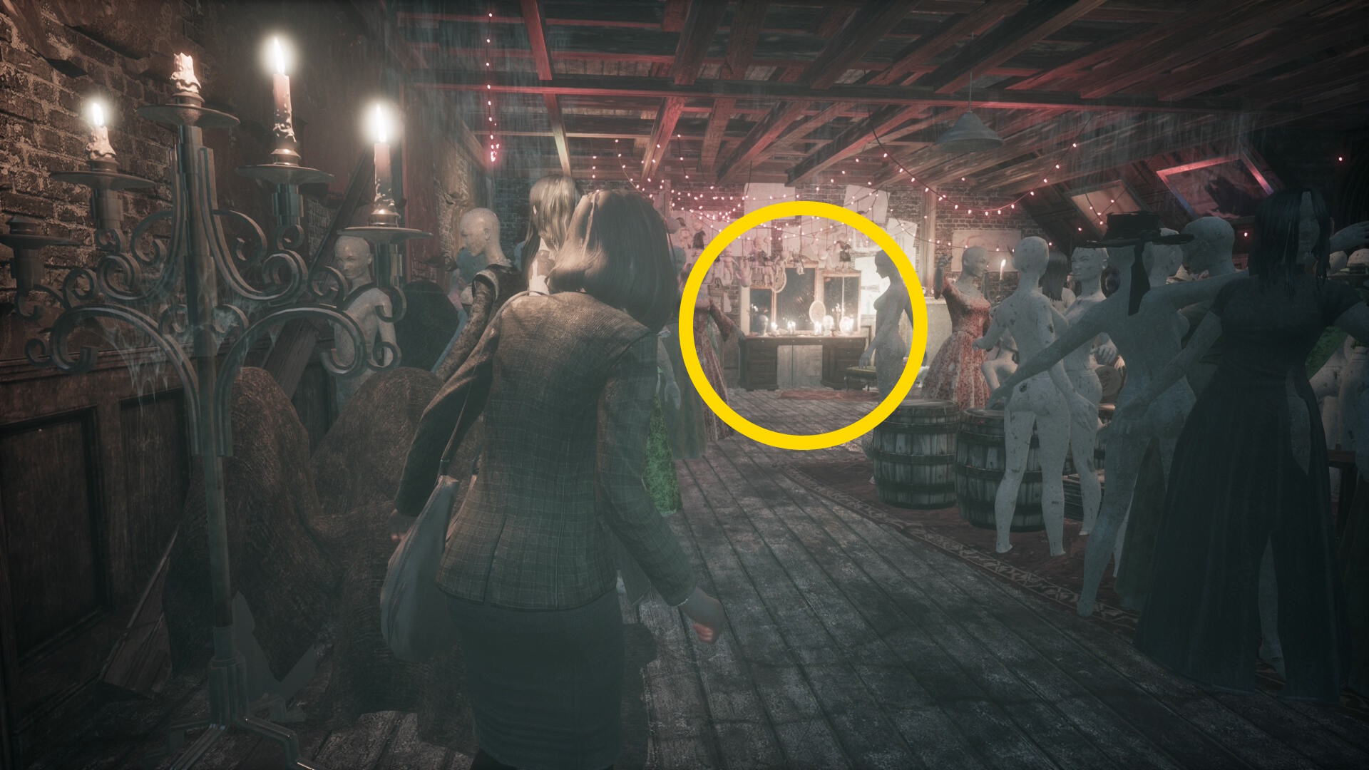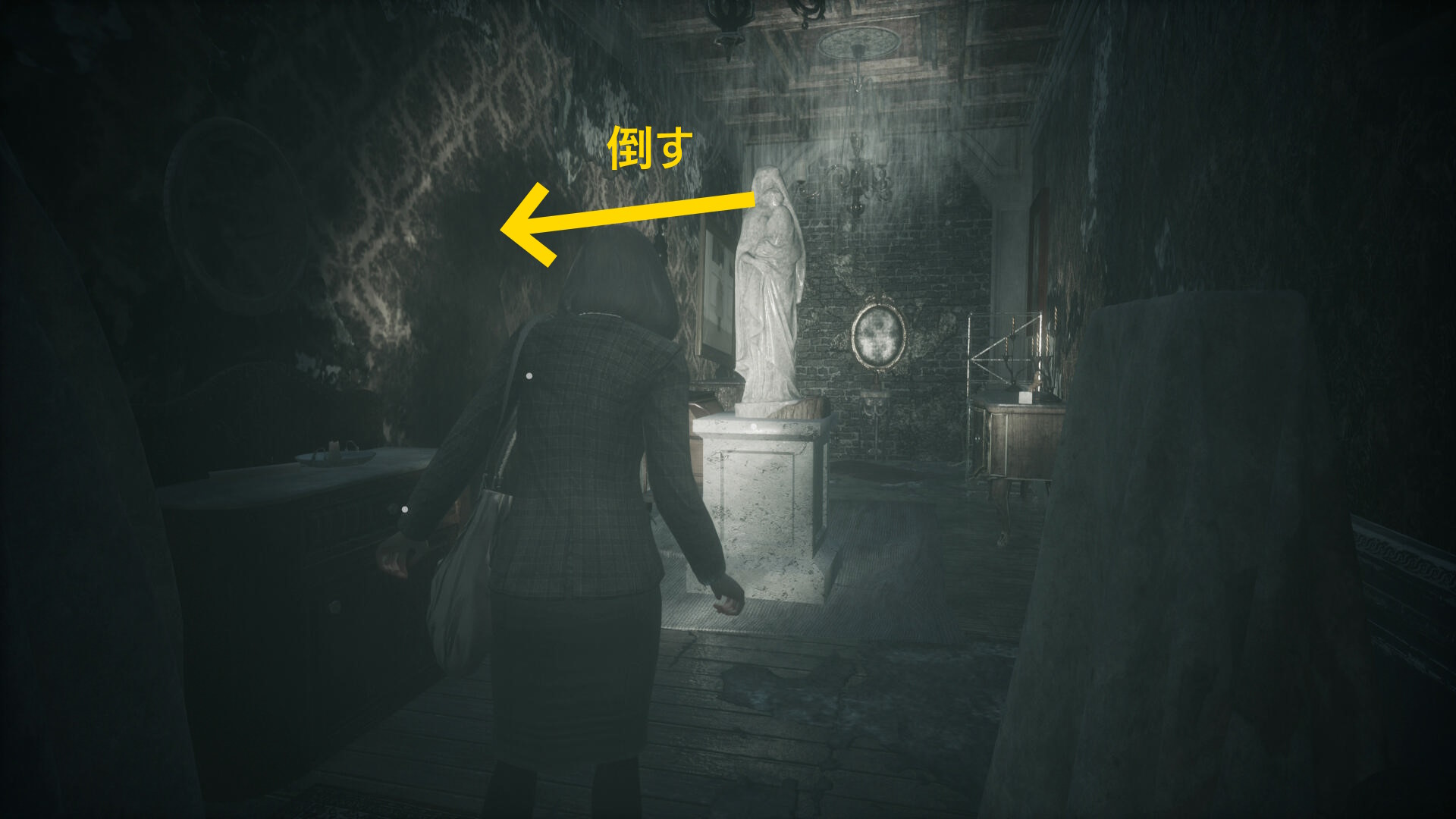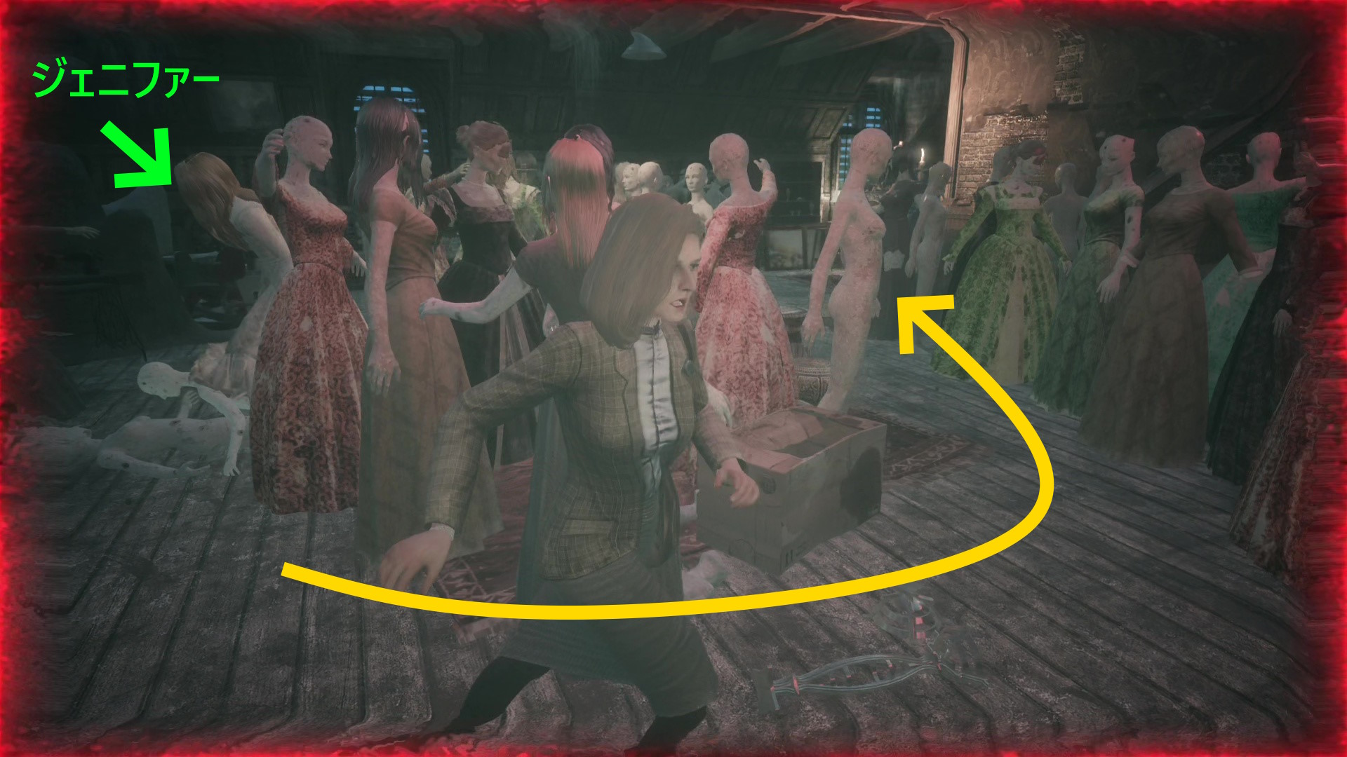 - 左ルートを進むとマネキンが倒れて道が塞がれ、ジェニファーが追いかけてくる