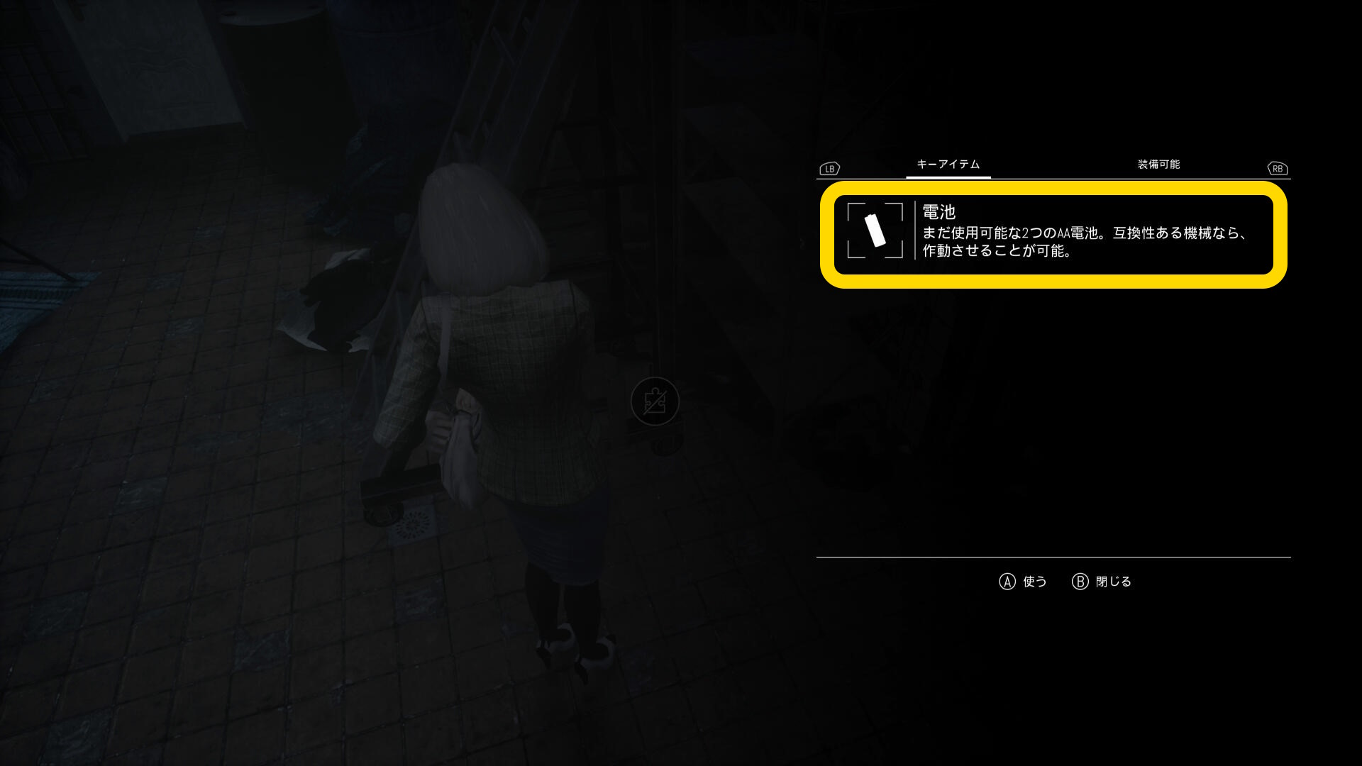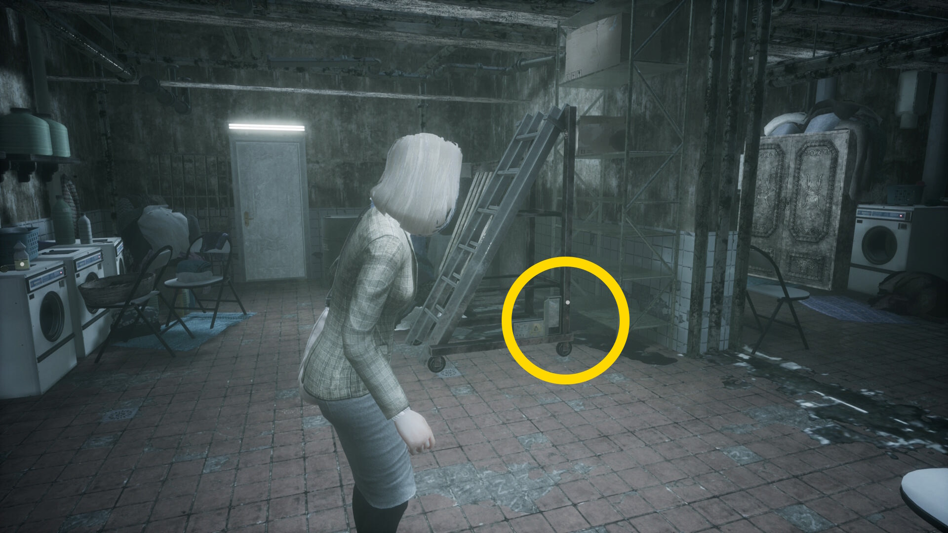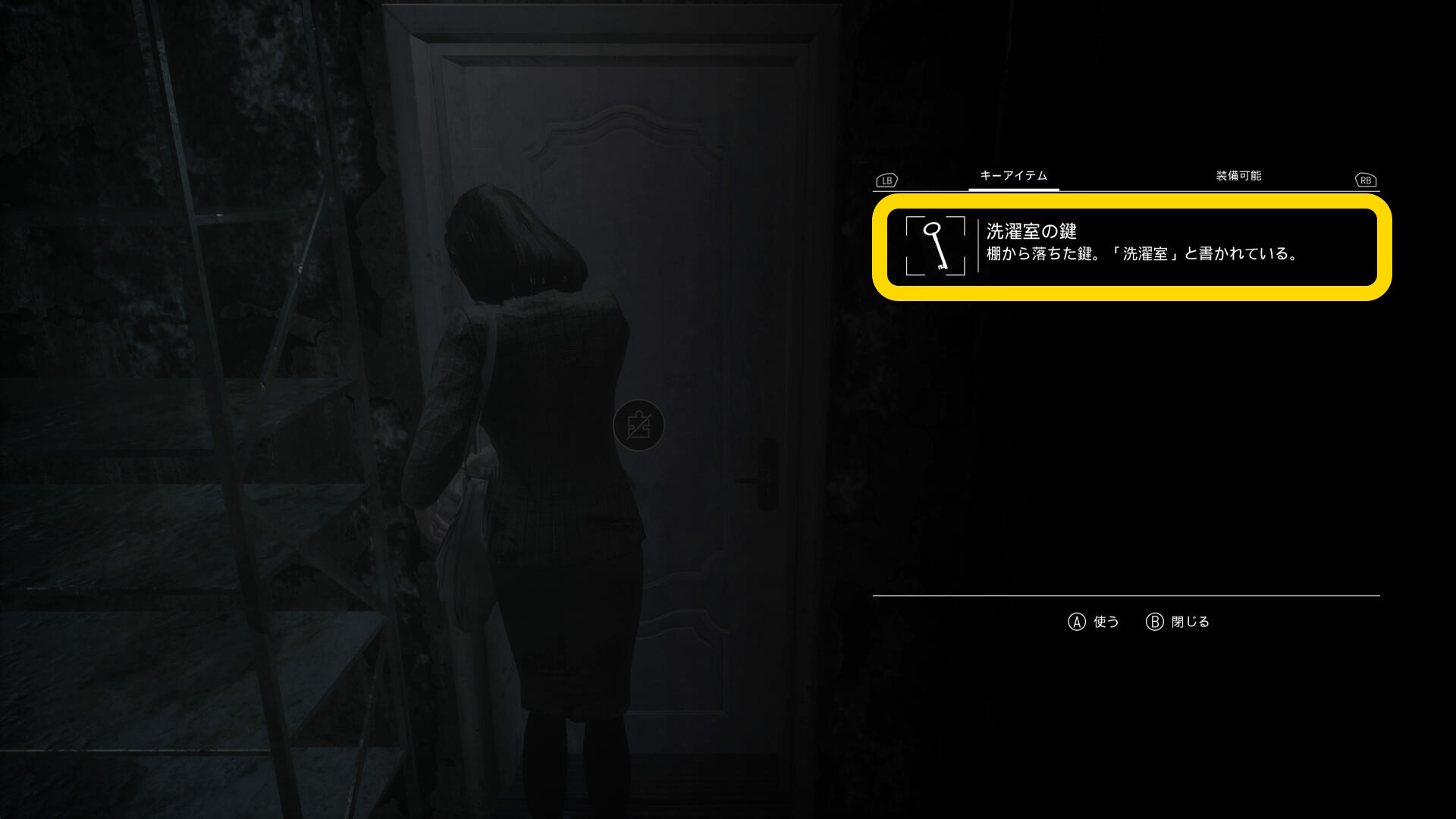- スチール製の棚を動かしたドアに戻ってインベントリを開き、「洗濯室の鍵」を使う
