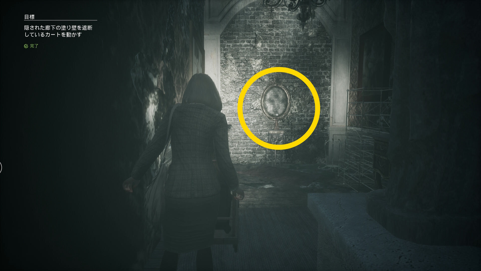 - セーブ後、カートが置かれていた塗り壁を調べる