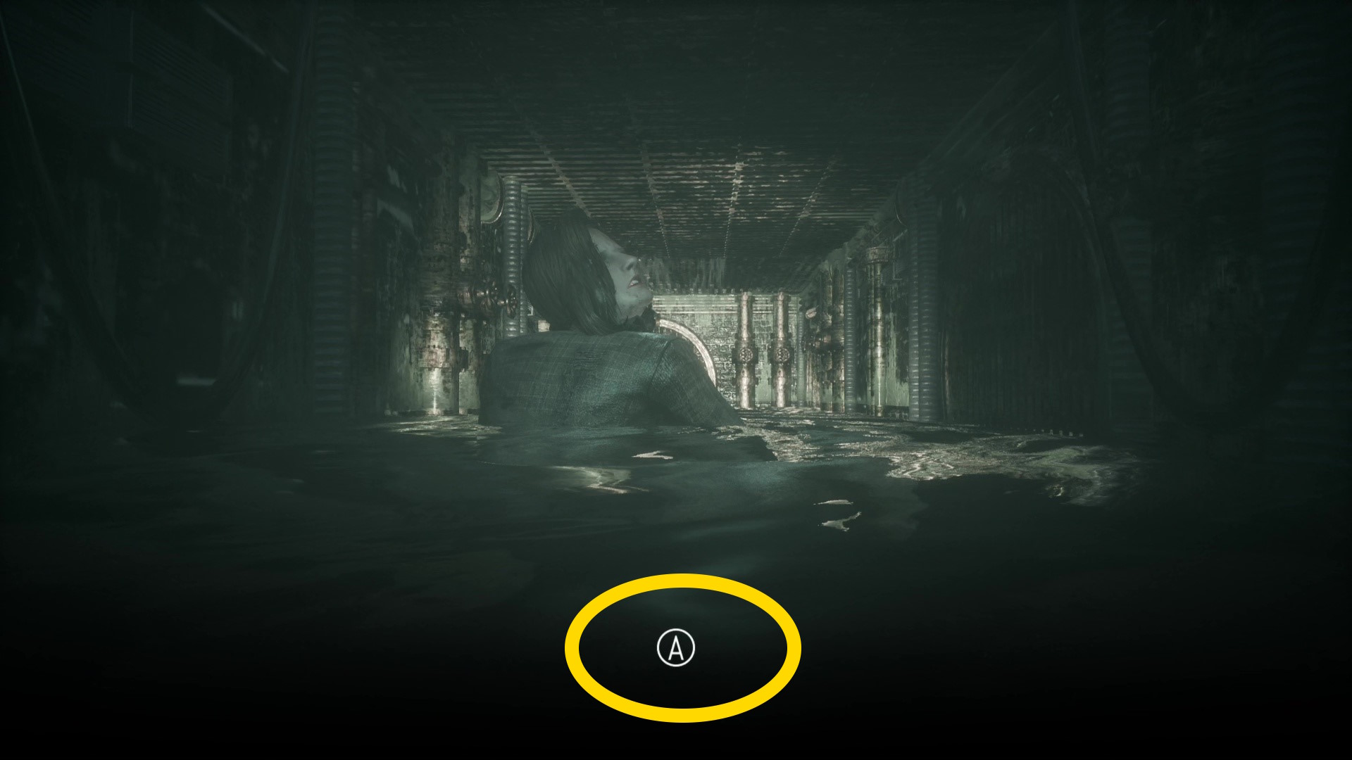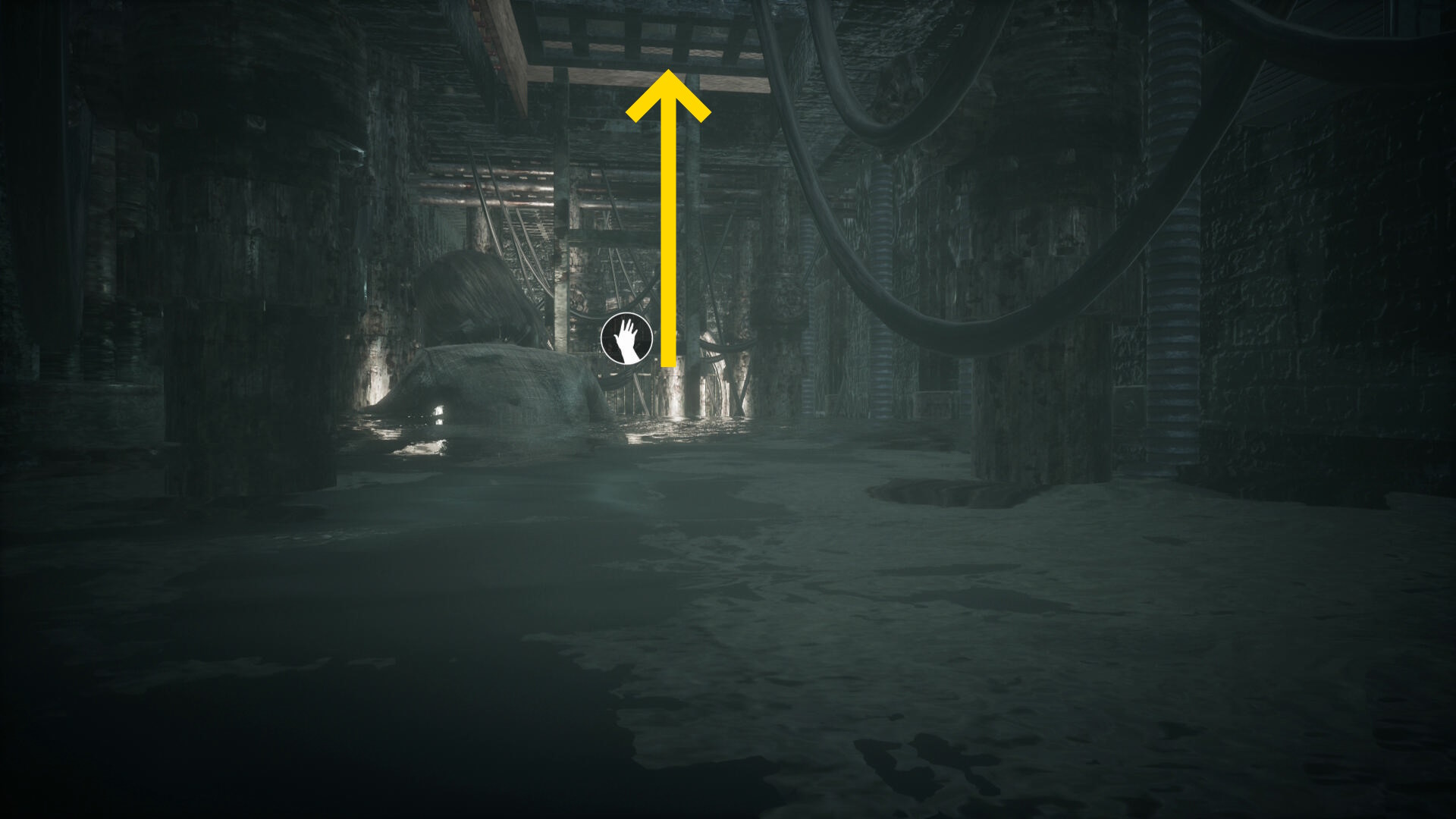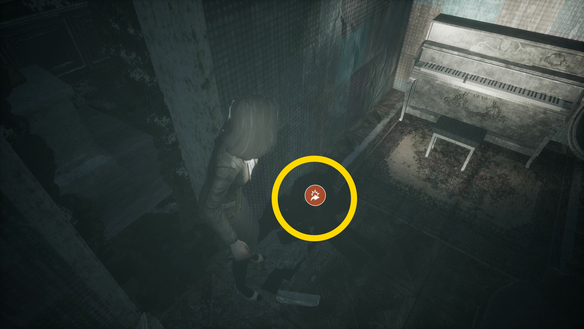 - 少し前進すると頭上で「ドタドタ」と追跡者の足音が響き、その後にローズマリーに向かって脊椎剣が振り下ろされる ( QTE )
