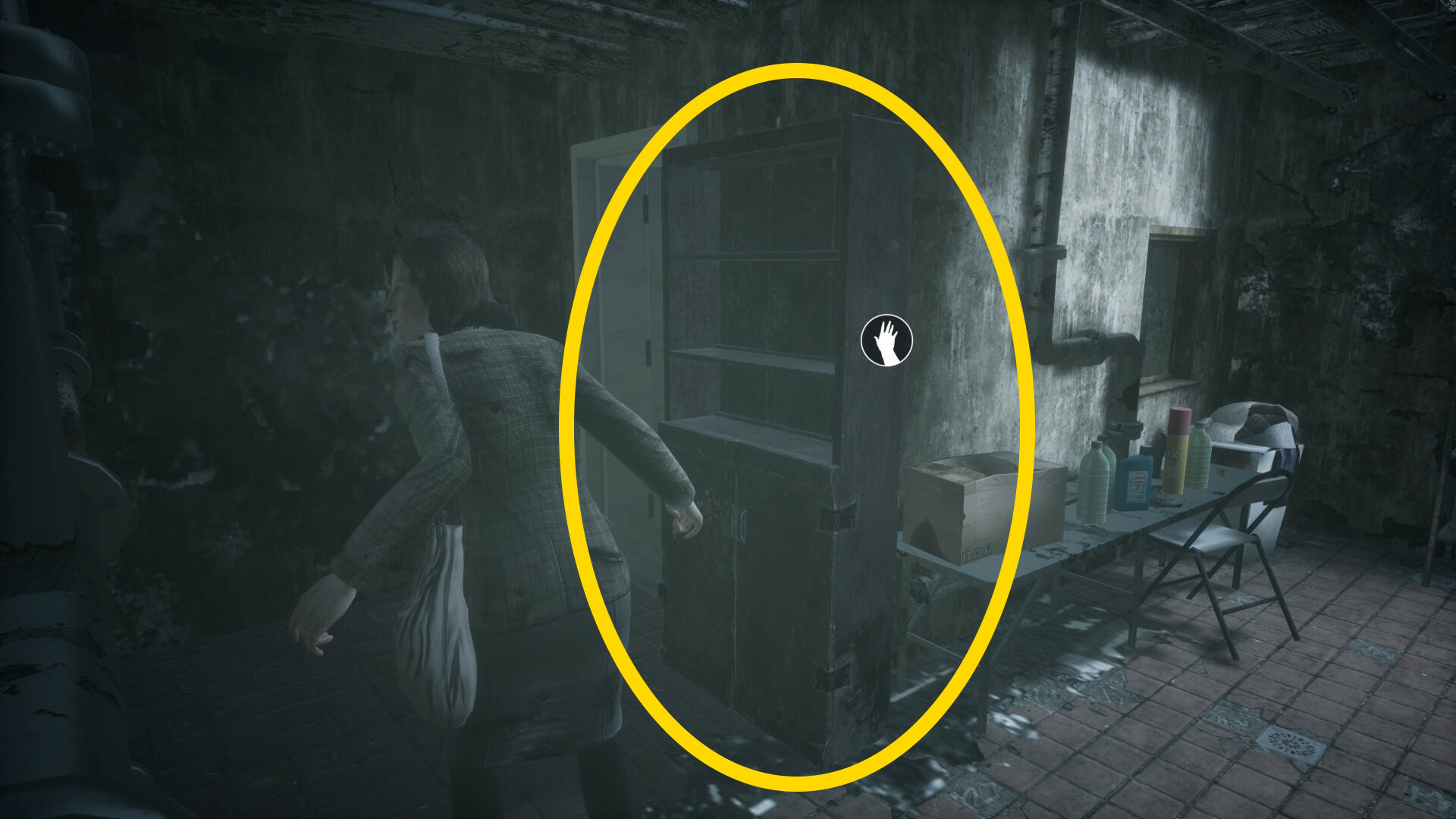 - 中に入ったら、すぐ左の棚を動かしてドアを封鎖する