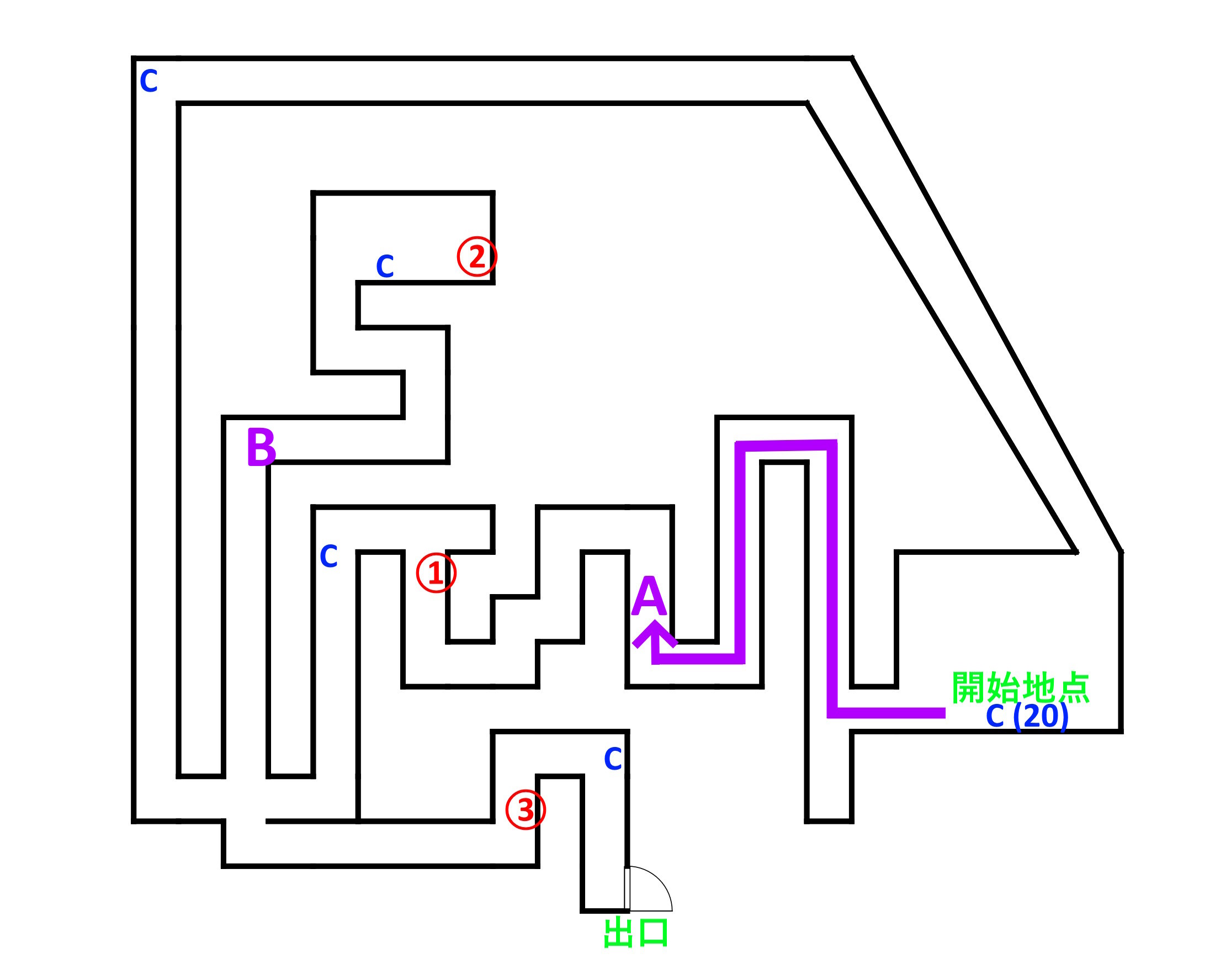 - C:収集品の場所 (どれか1箇所で回収すればオーケー:当サイト的にオススメは「②の手前」「③の奥」のどちらか)