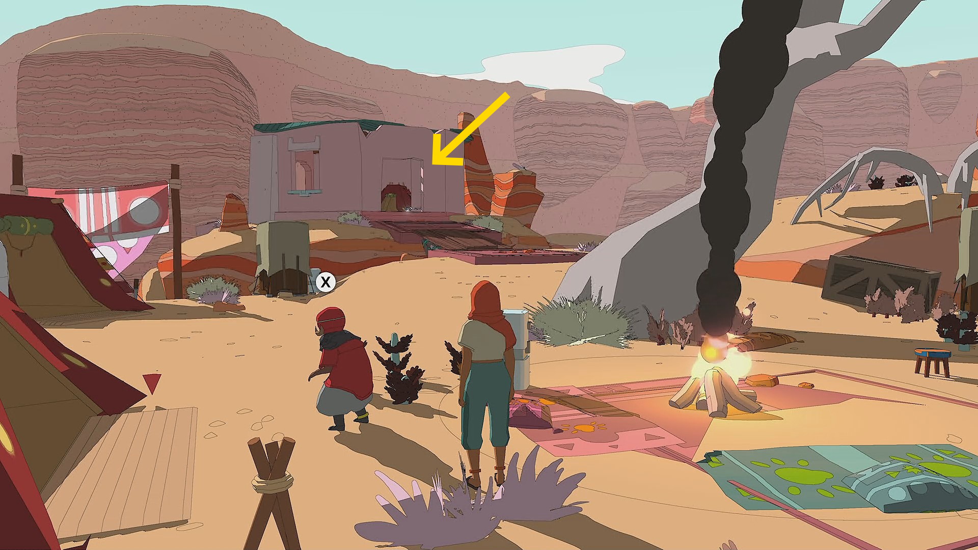 - 建物から出たら、正面奥に煙があがるキャンプ(アイベクス族のキャンプ)へ向かうとカットシーン