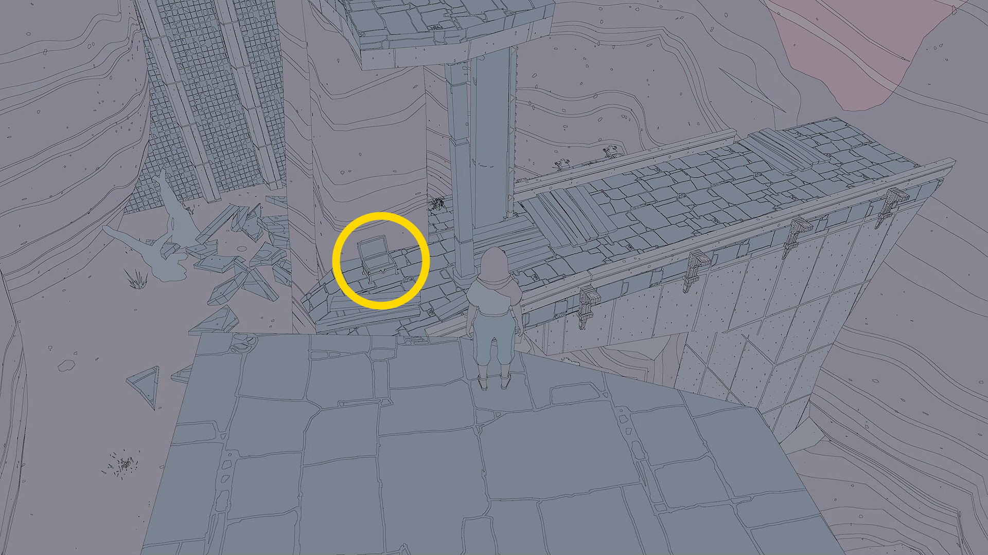 - カットシーン後、3箇所の浮いた床にあるスイッチを踏むことで巨大な像を完成させる必要がある