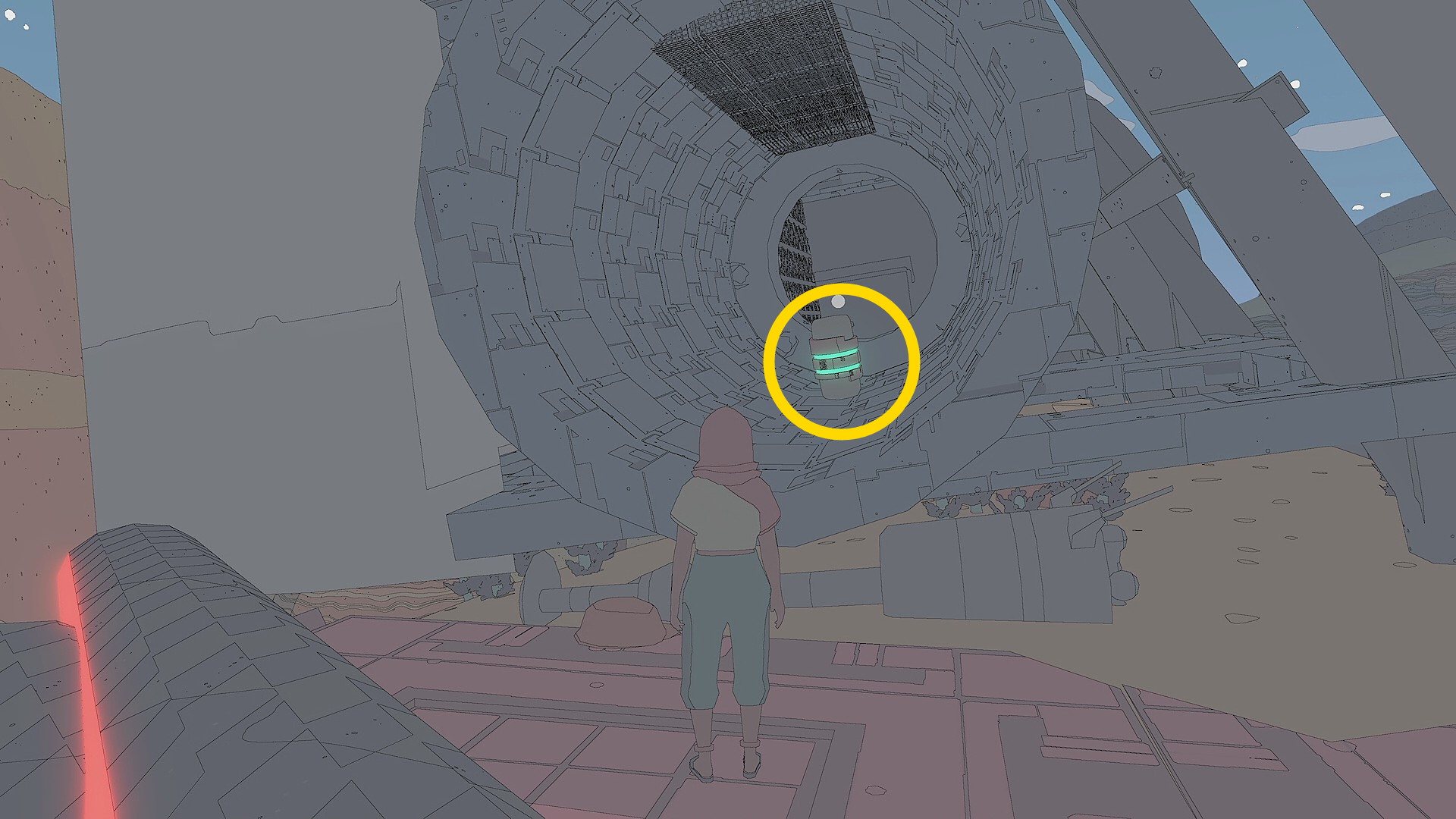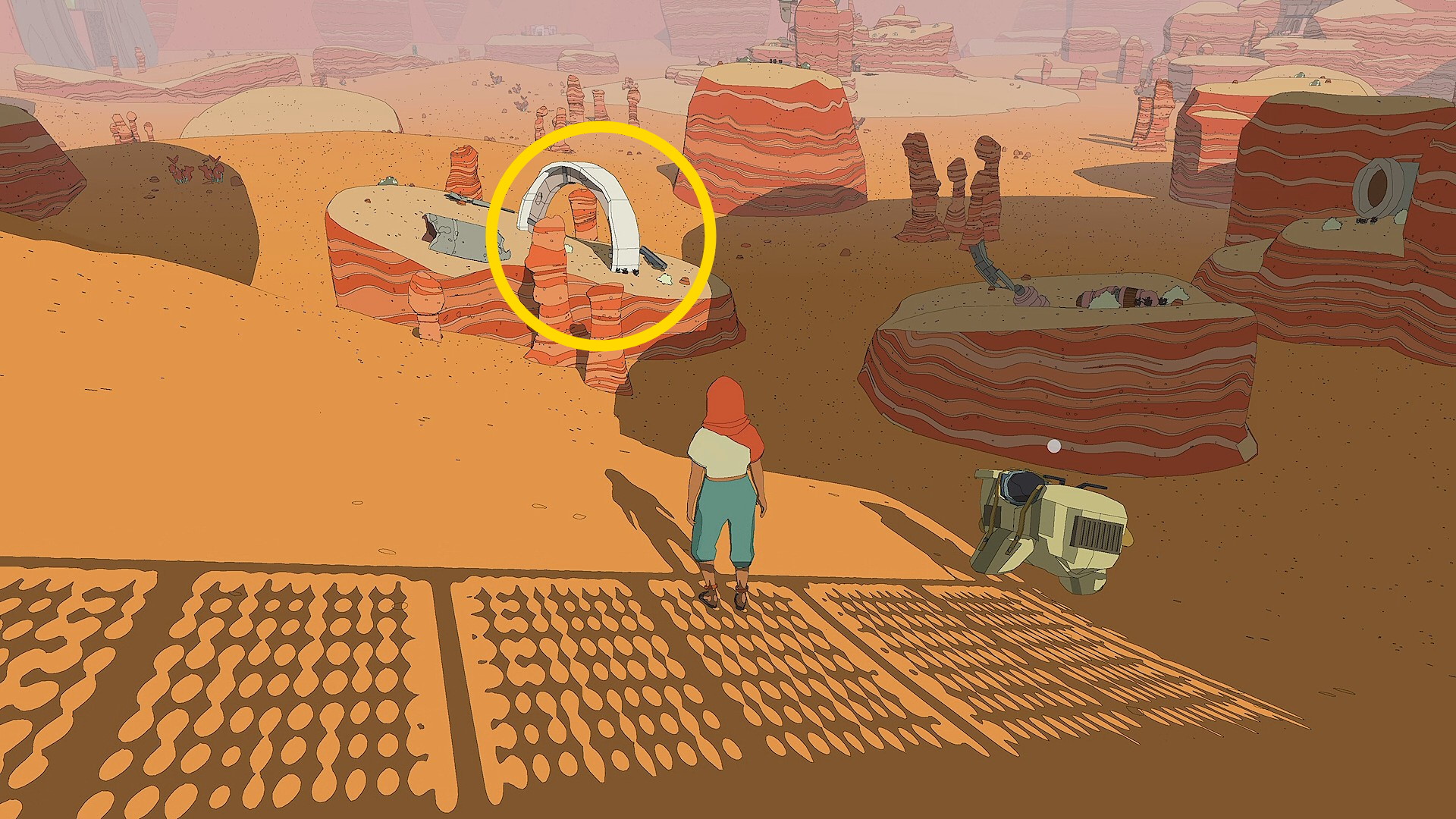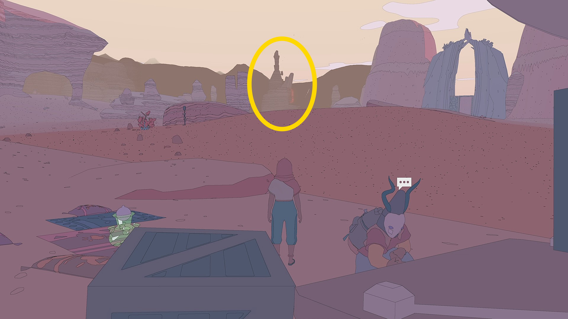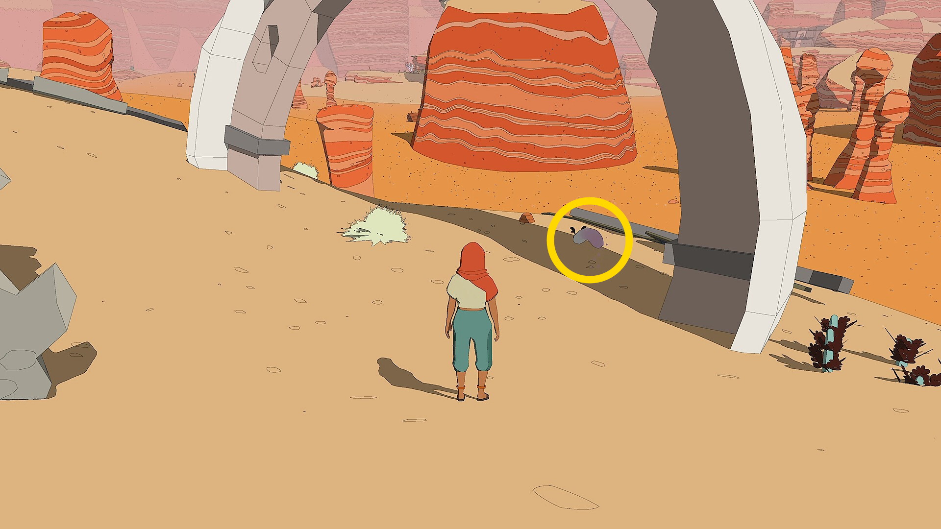 - 朽ちた宇宙船を出たら、東に向かうと左前方に小さなトンネルのある岩山が見えてくる(下動画参照)