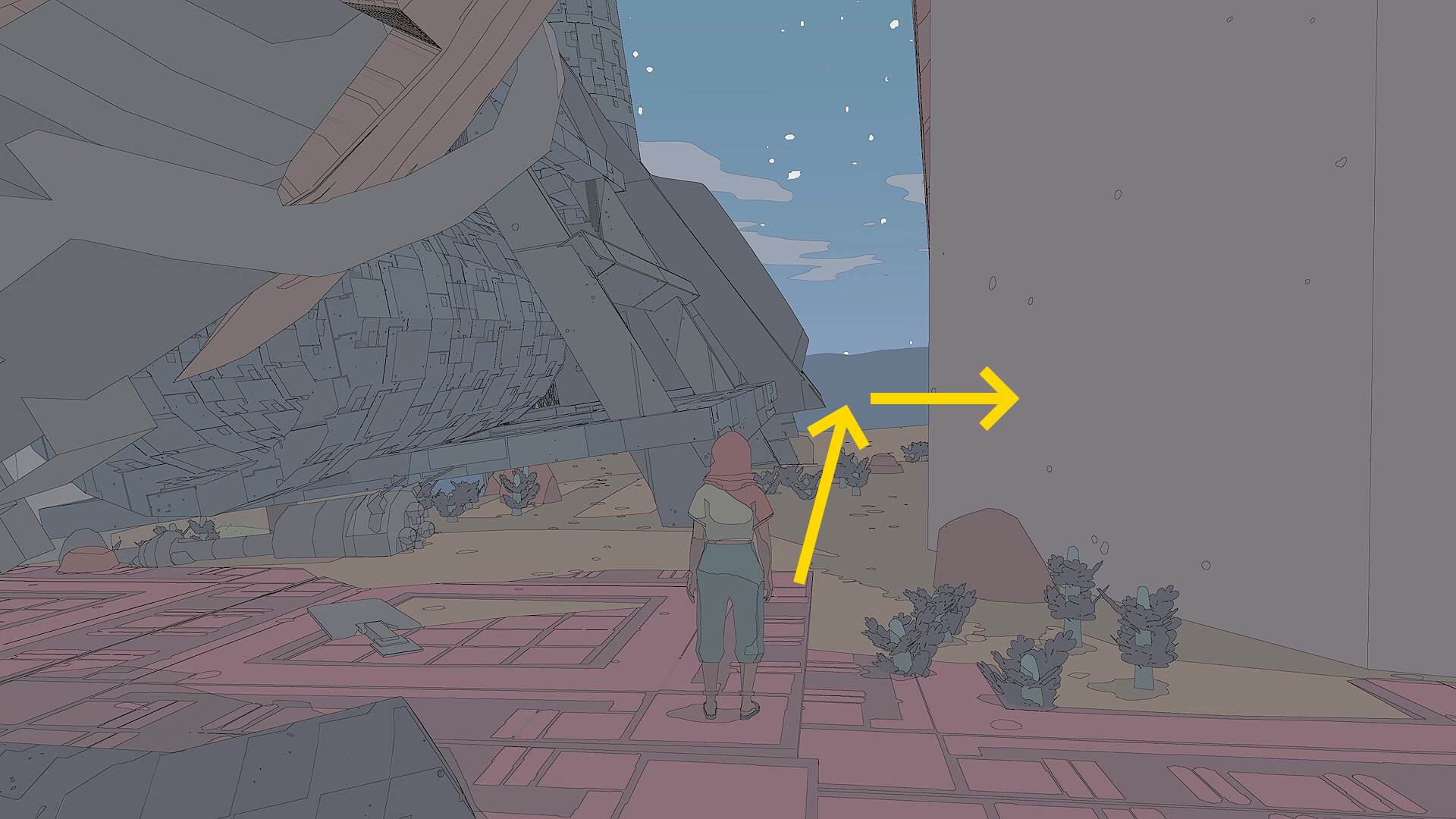 - 西に見える朽ちた宇宙船に向かう