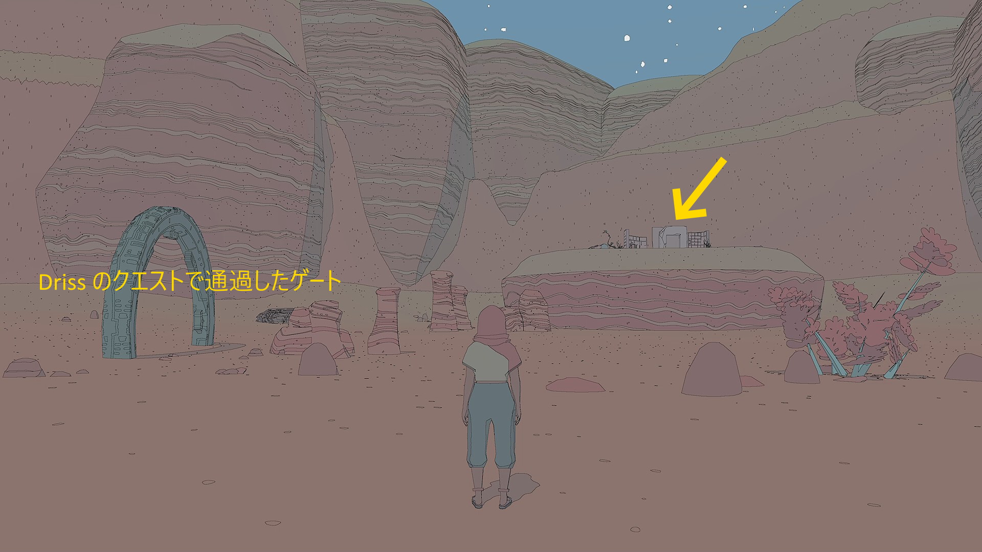 - ドリスのクエストでバイクに乗って通過した半円形のゲートのすぐ近く