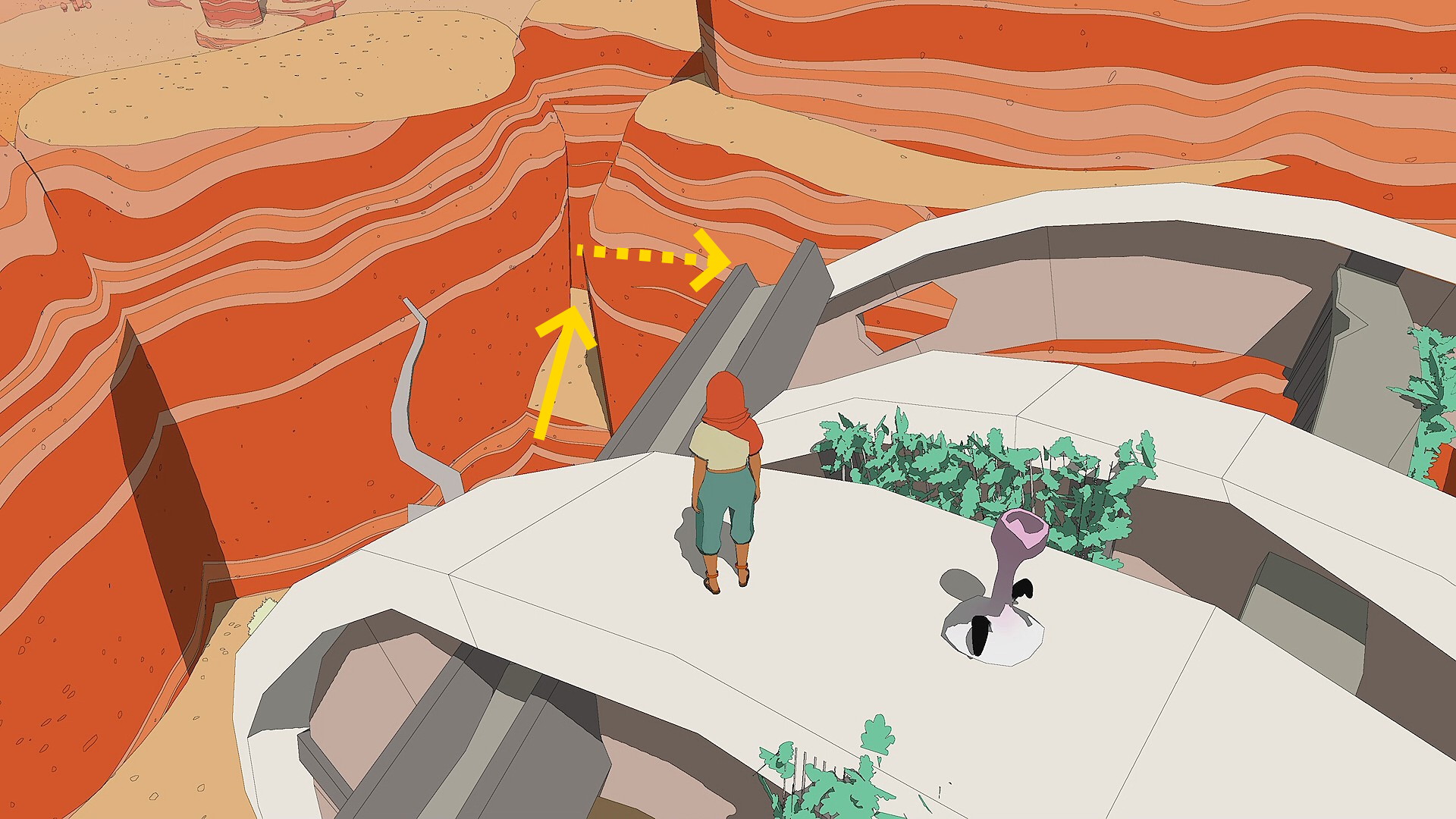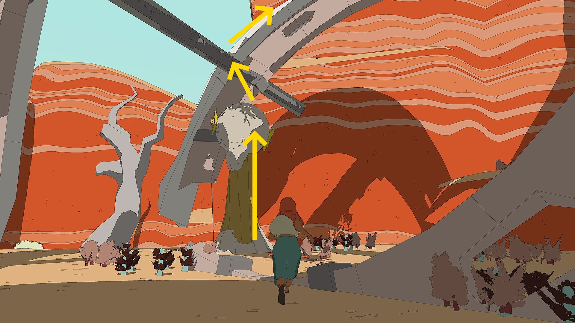 - 螺旋階段を登り、滑空で向こう側に見える朽ちた宇宙船へ