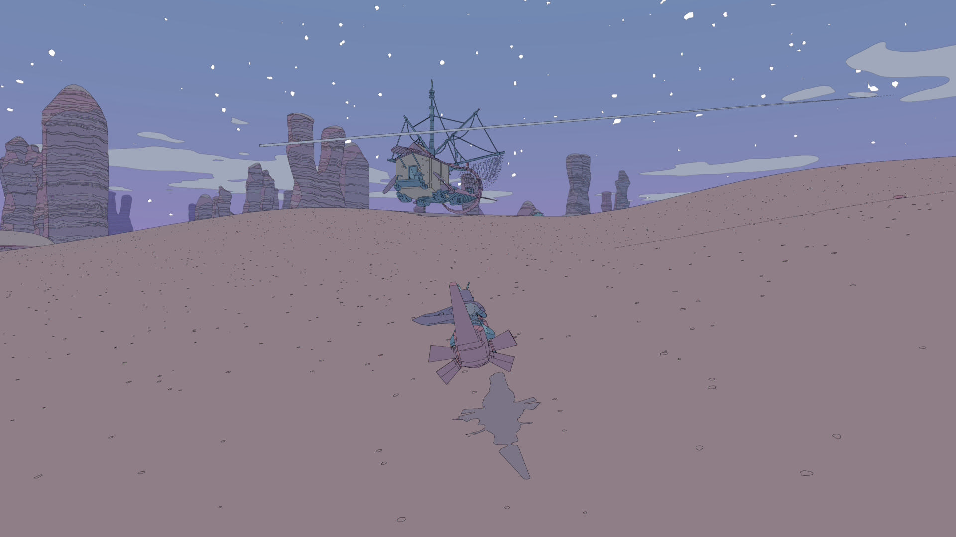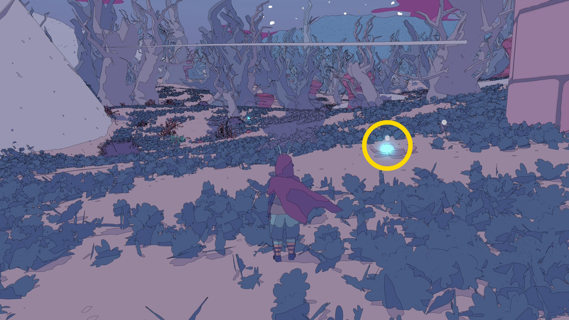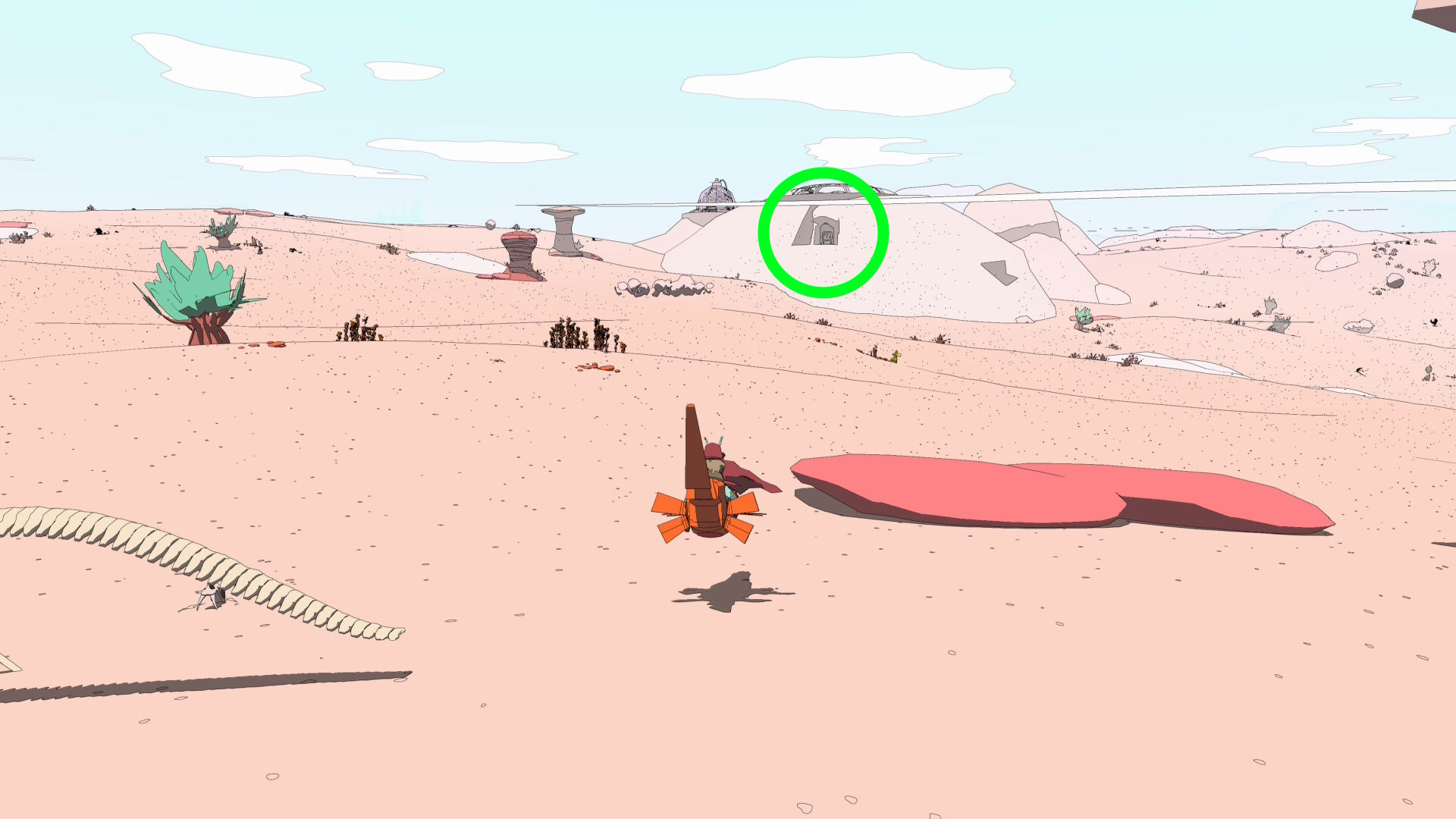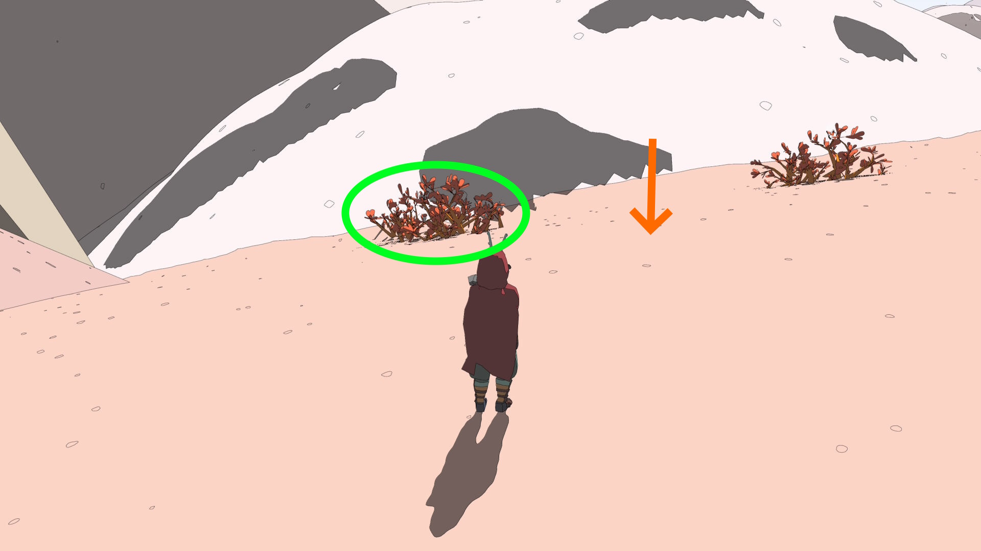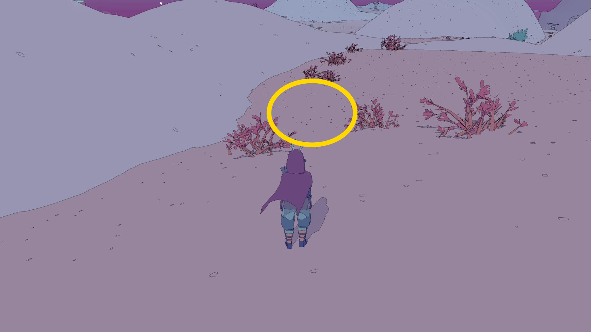 • 白い山のふもとでホバーバイクを降り、山を登る(ジャンプしながらだと登りやすい)