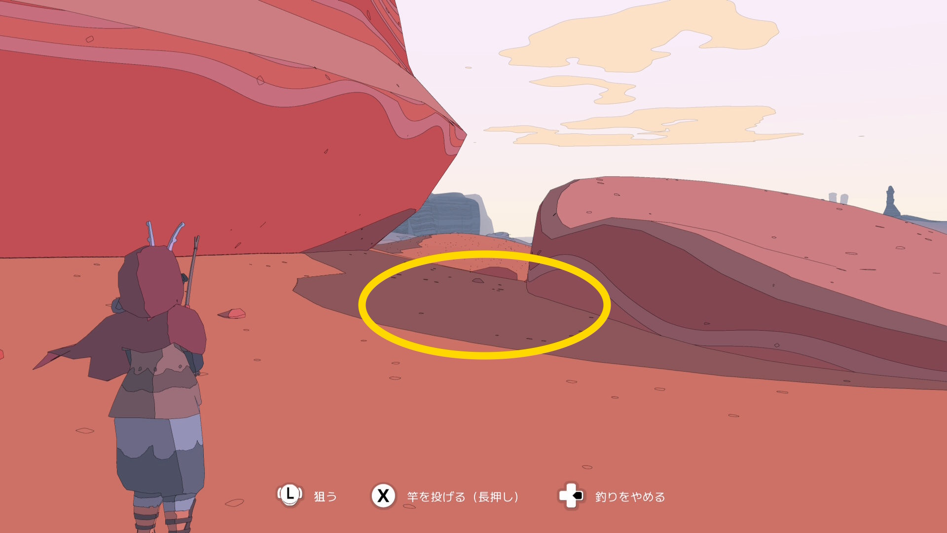 • 南を向くとやや南東に灰色の草がぽつんとあるので、そこに仕掛けを投げると サンドレイ(魚:11/17)が釣れやすい