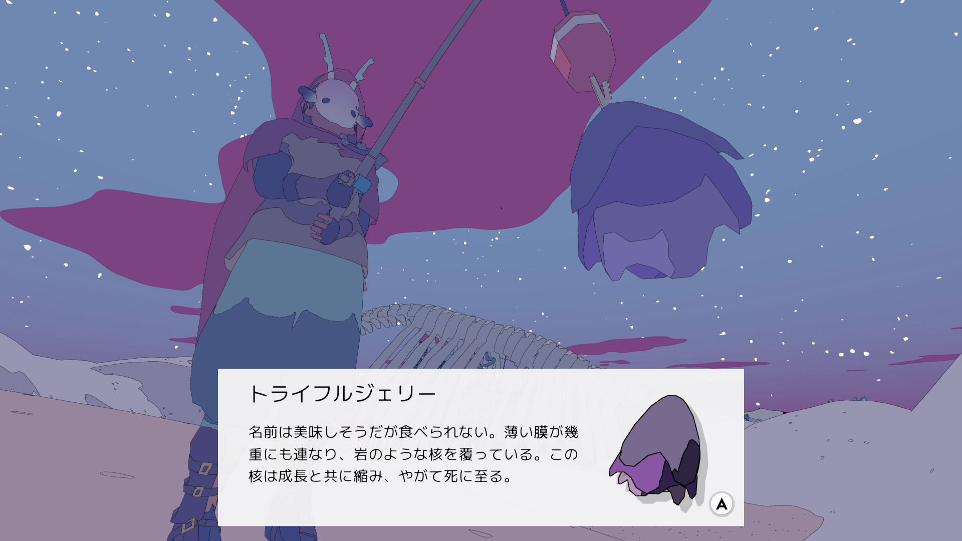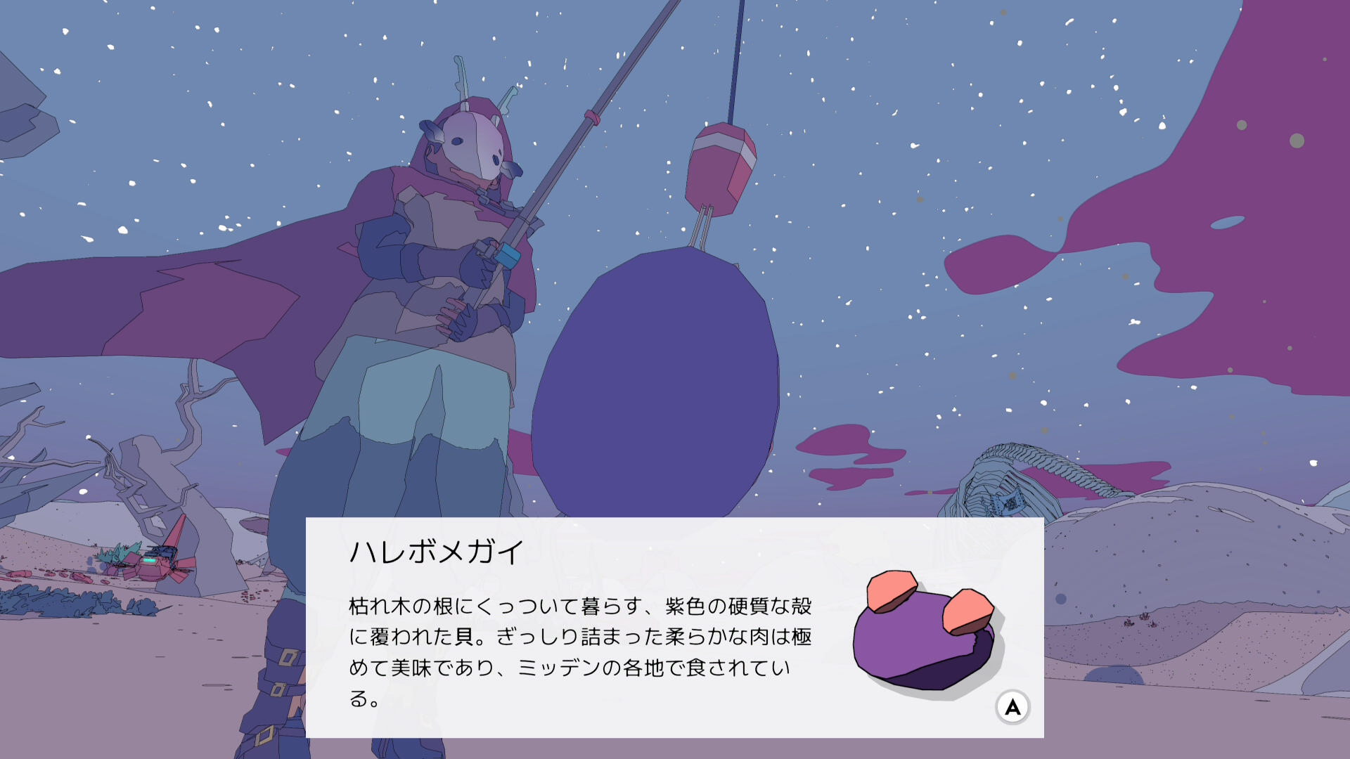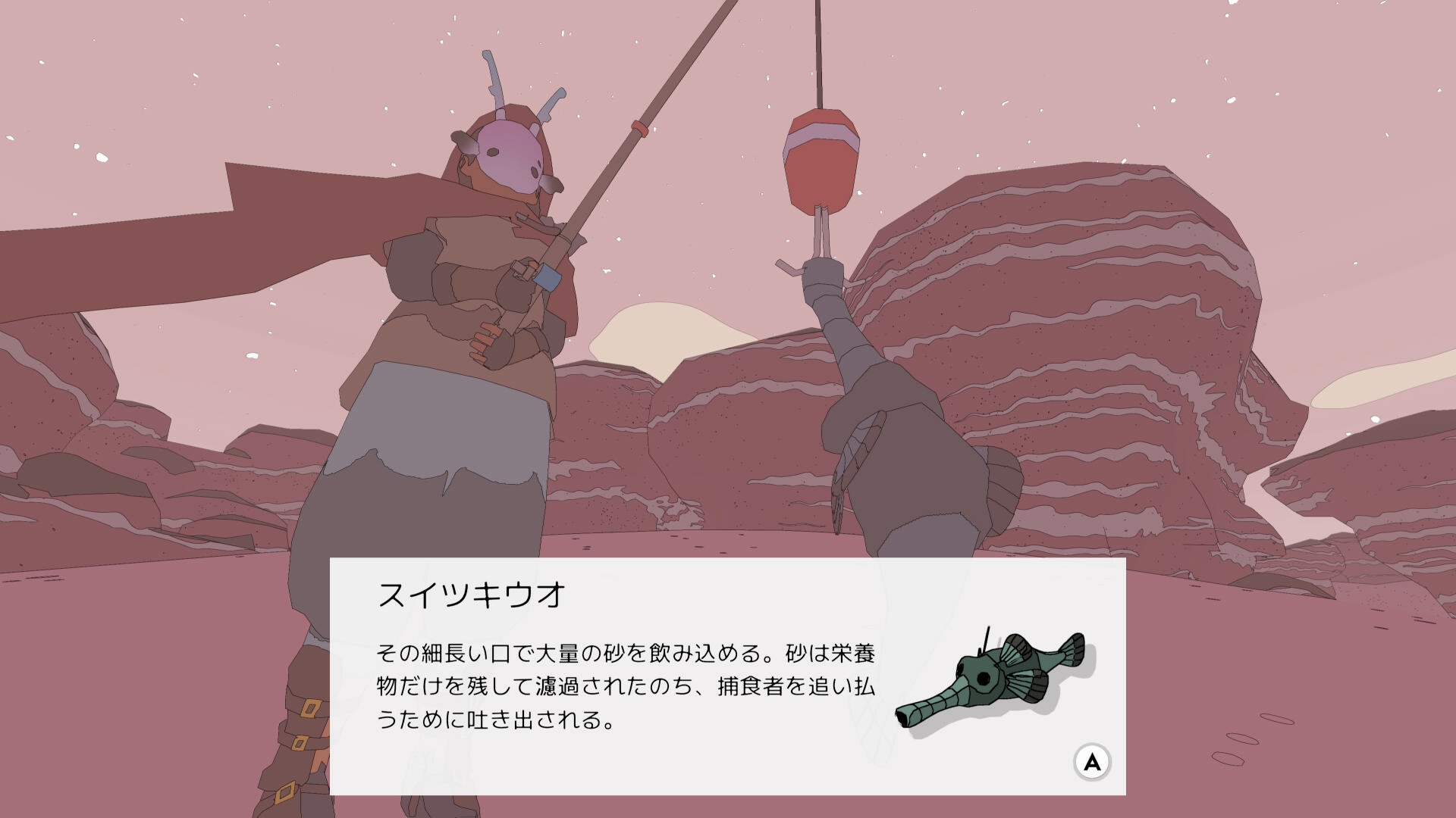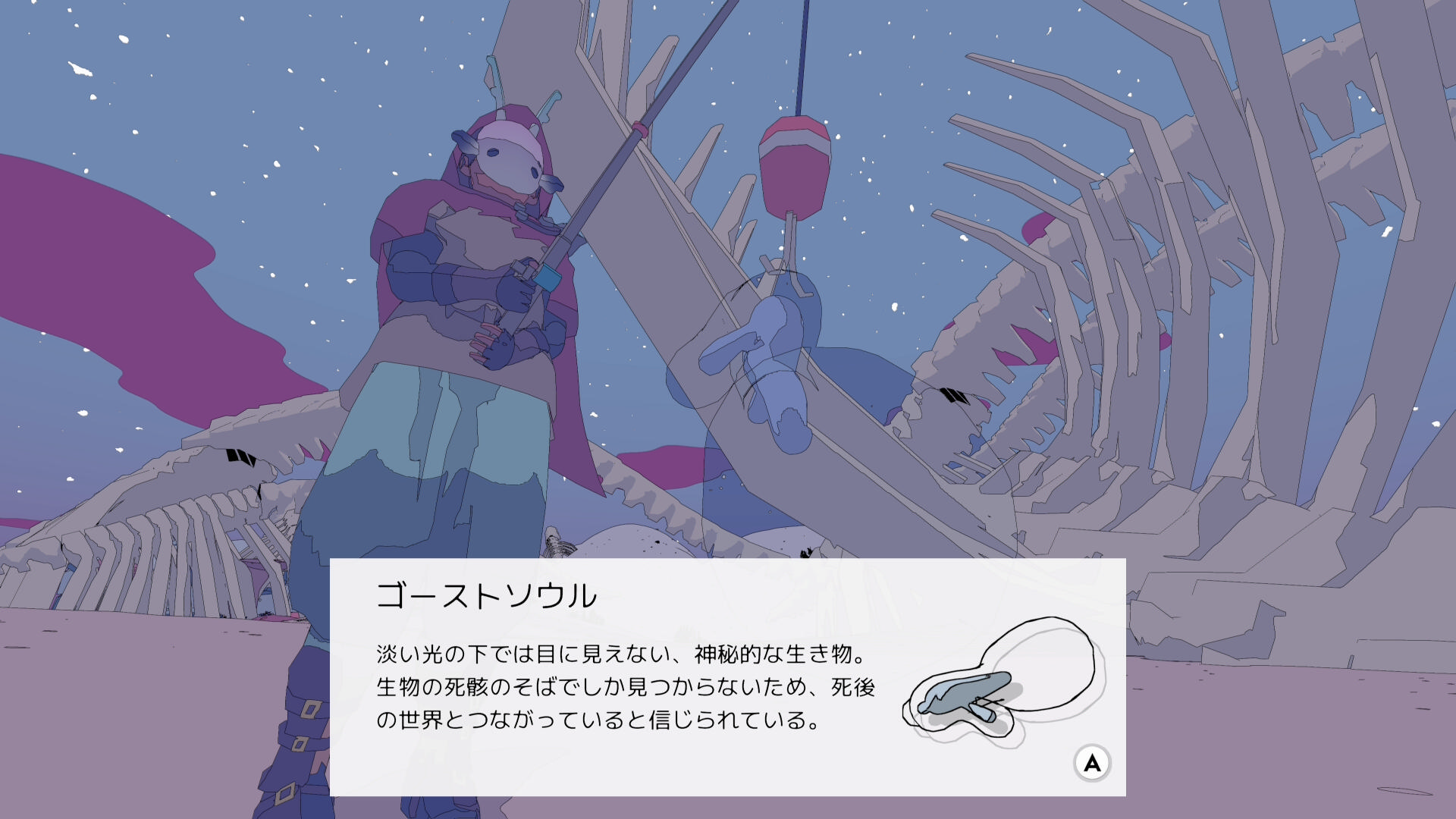 • 巨大な恐竜の骨にまじって、小さい生物の骨があり、その周辺に仕掛けを投げれば ゴーストソウル(魚:5/17)が釣れやすい(釣り人ヨシに指定された魚ではないが釣っておく)