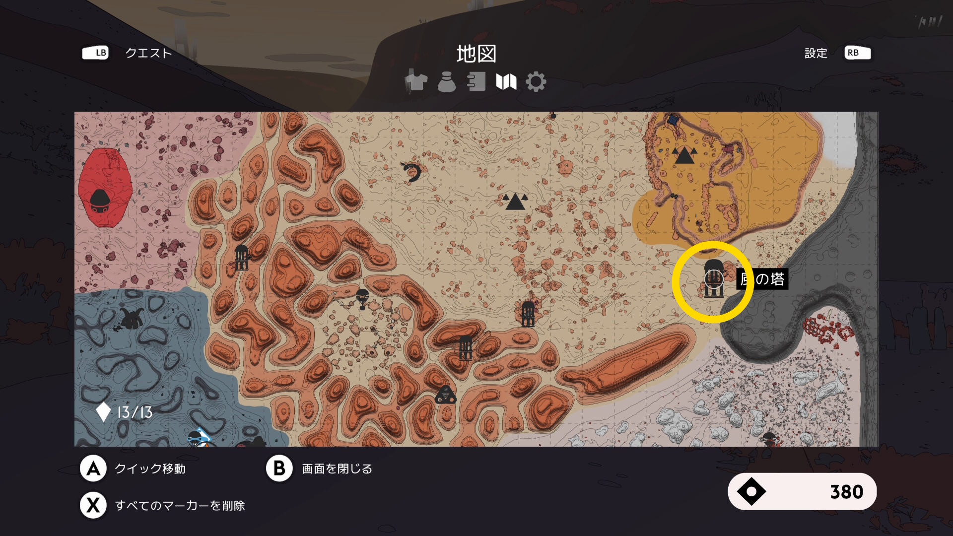 • サンシィの南東にある「風の塔」にファストトラベル