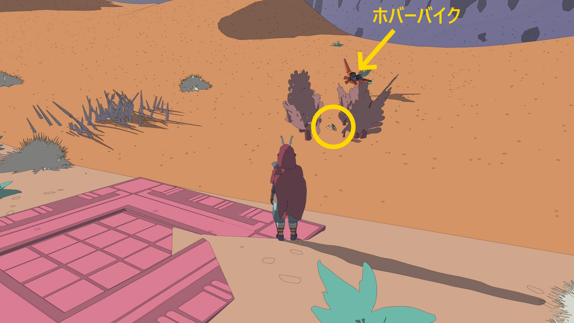 • 到着したら南に進み、ホバーバイクの手前の植物のところに オヒサマ蝶(蝶:1/8)がいるので捕獲しておく