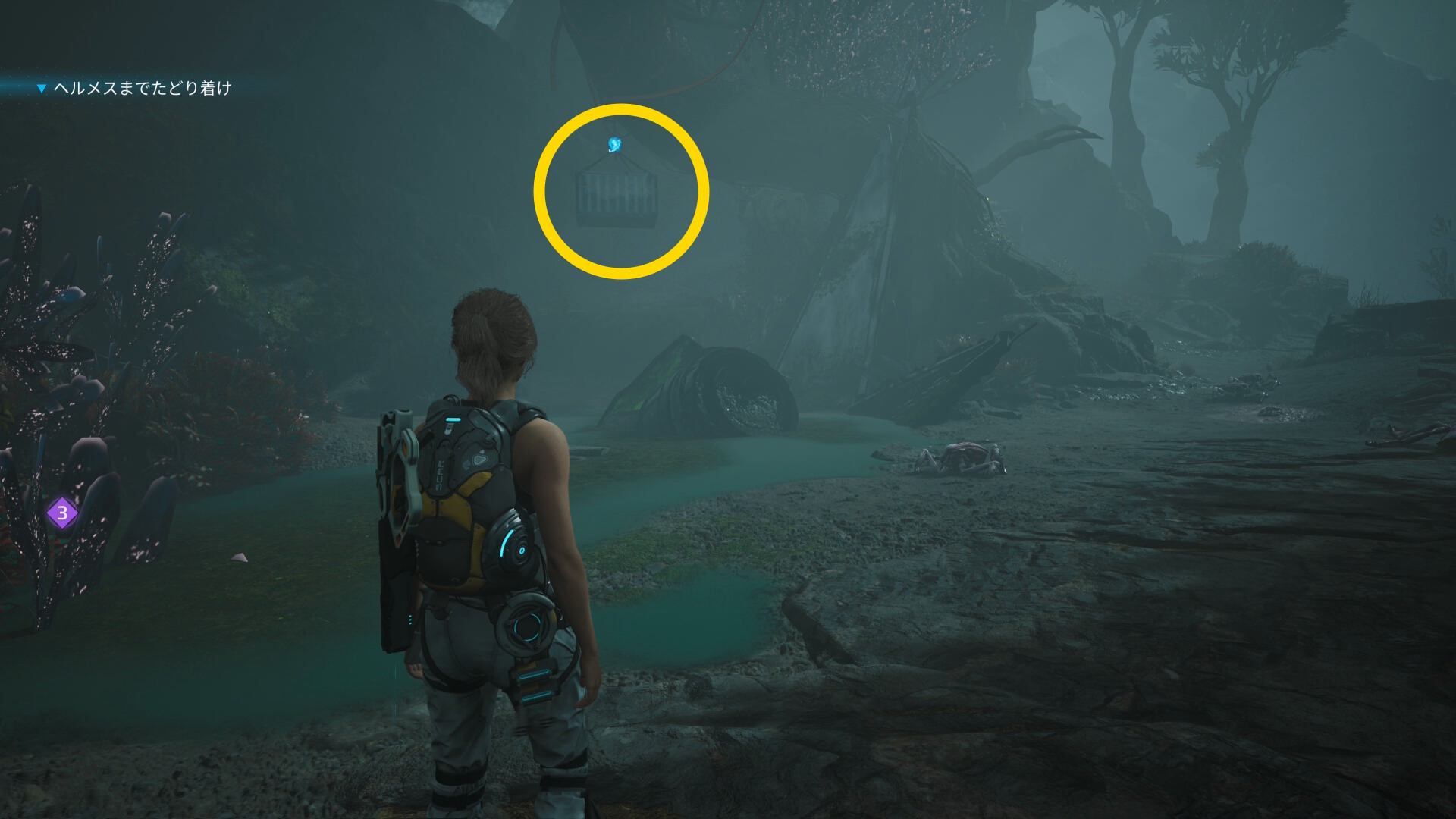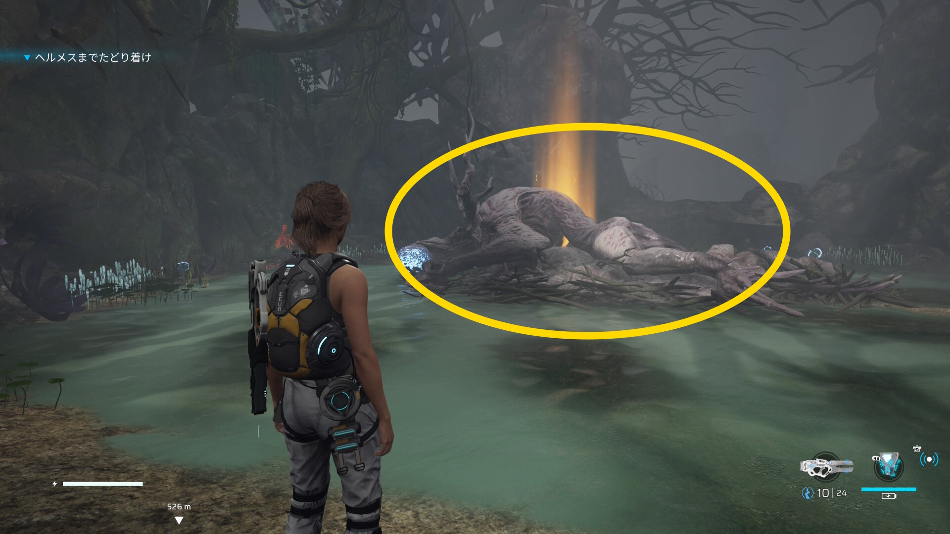 - 左を向くとヘルメスのスラスターが沼に落ちている