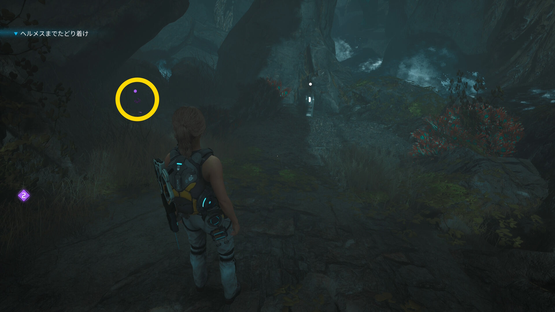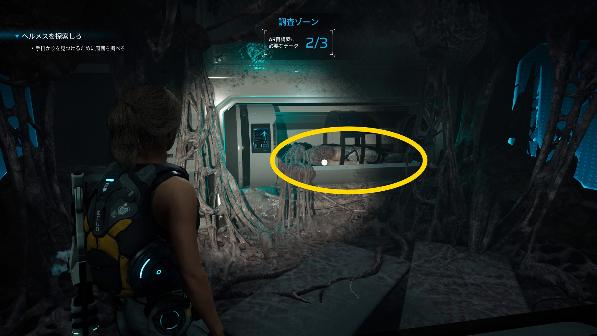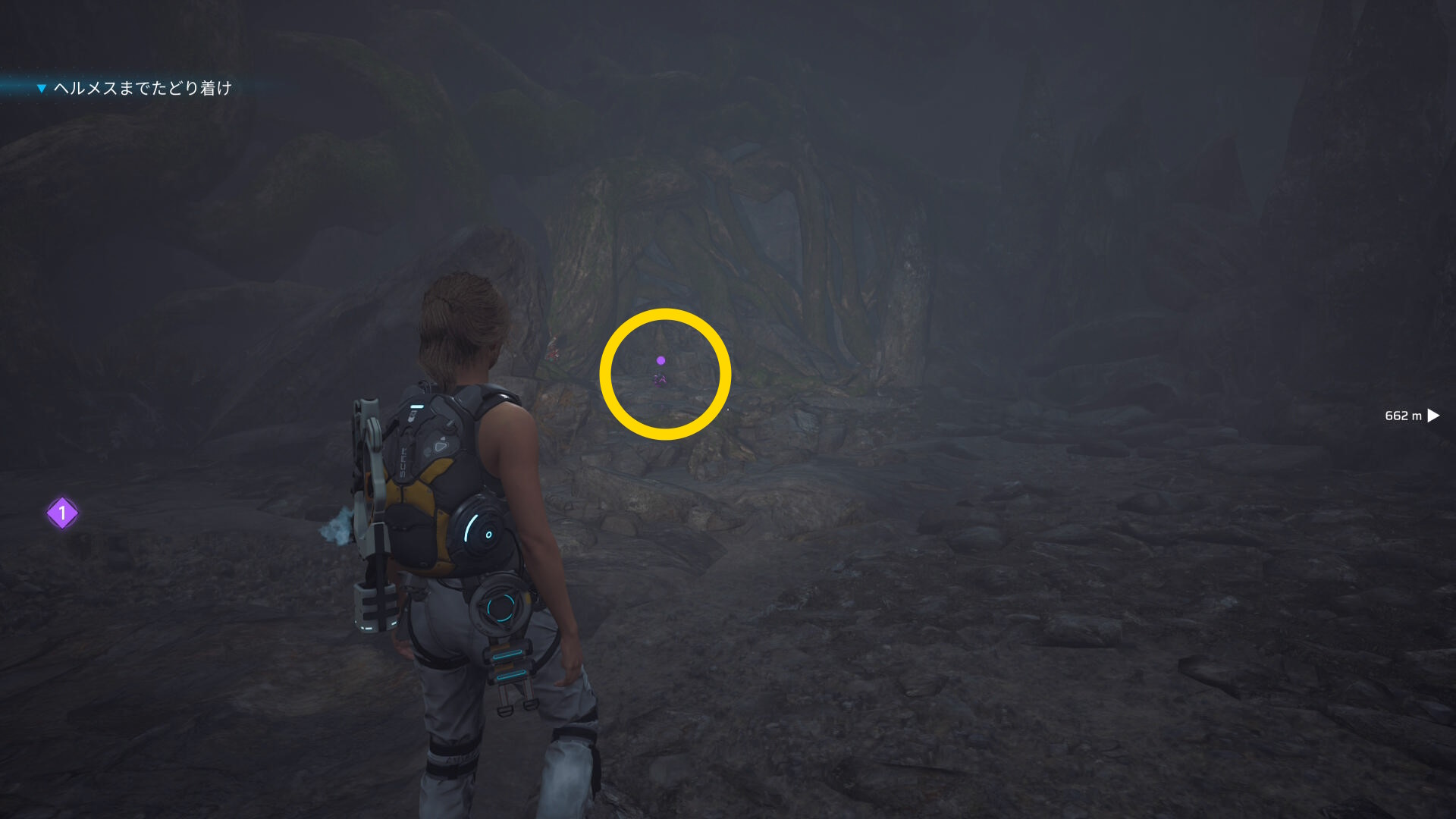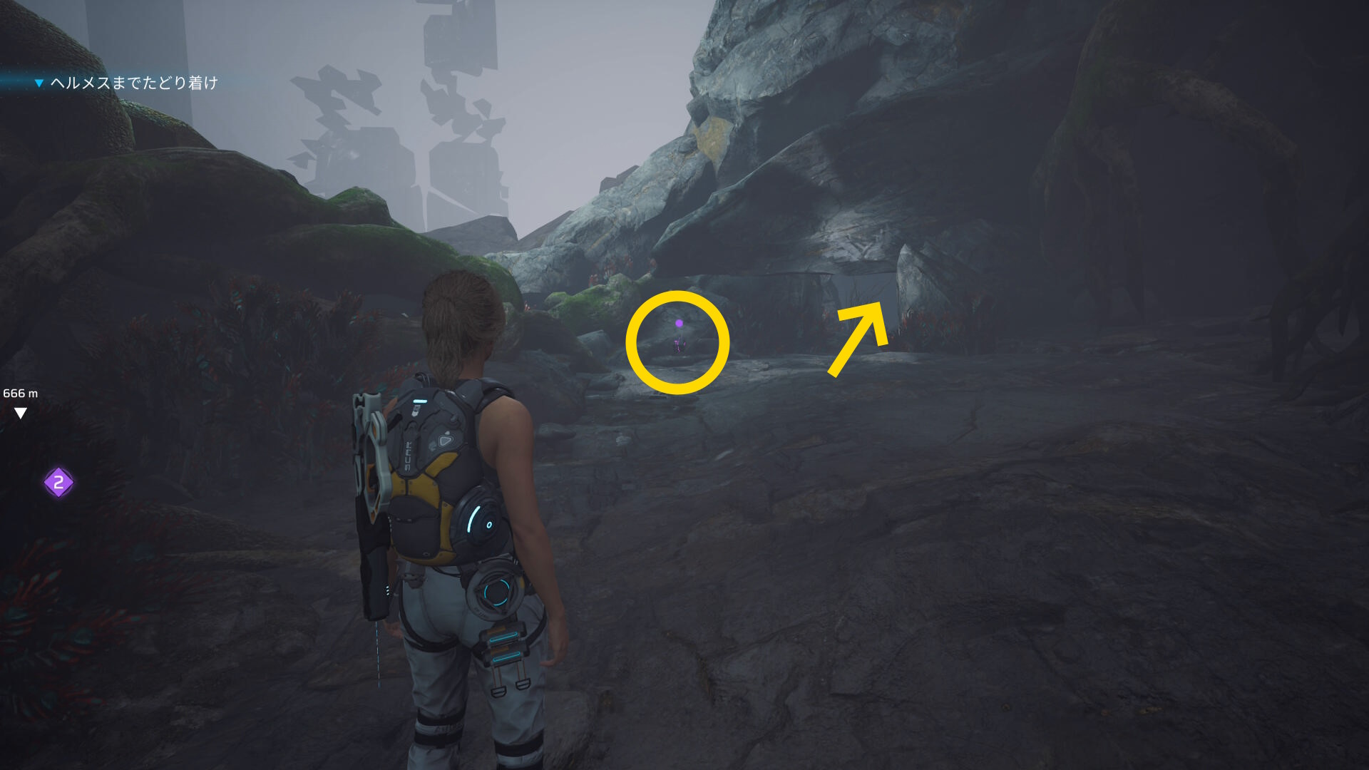 - 洞窟を進むと奥に エイリアンの柱(5/17) が見えてくる。なお、その手前右壁に「フレッシュの死骸」があるが調べても調べなくてもオーケー(下画像、右側の白い◯)
